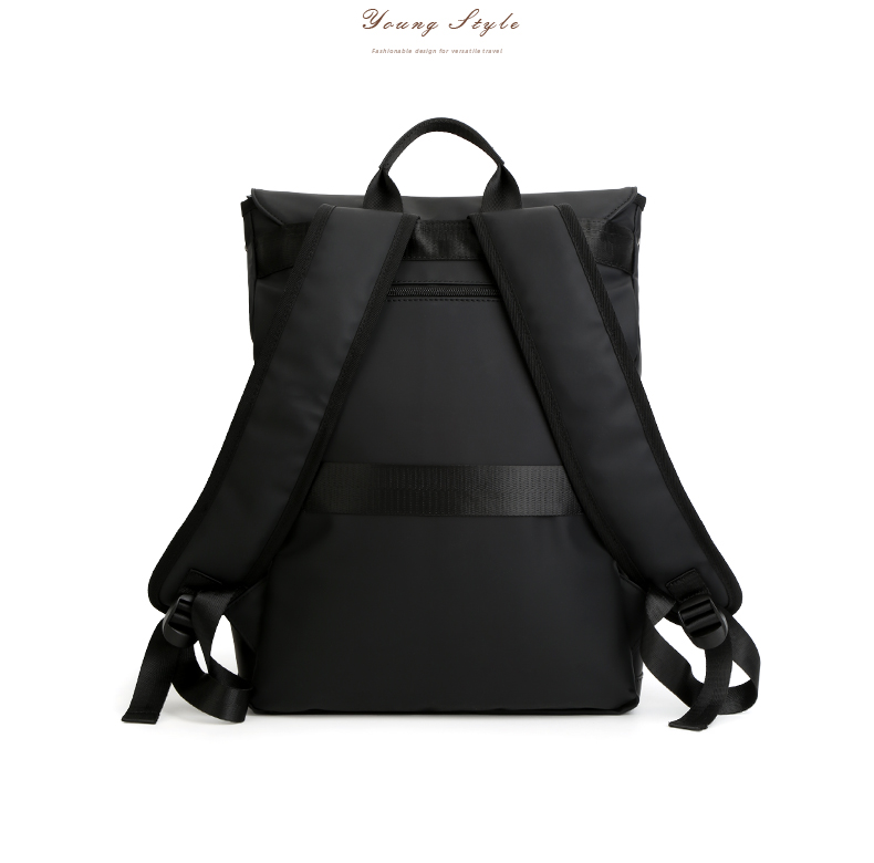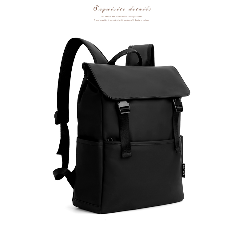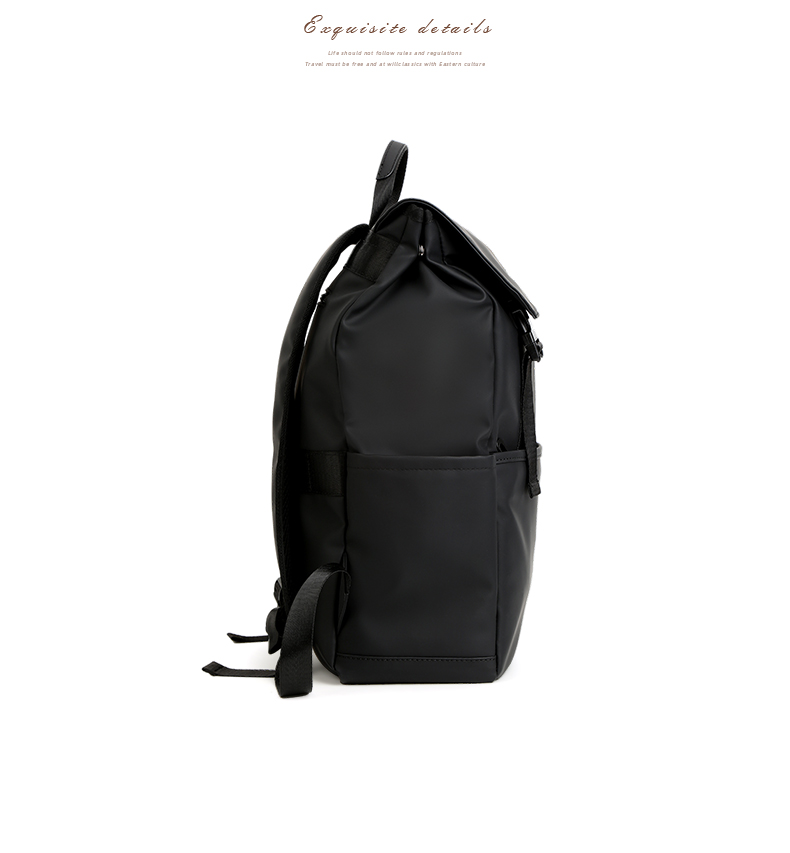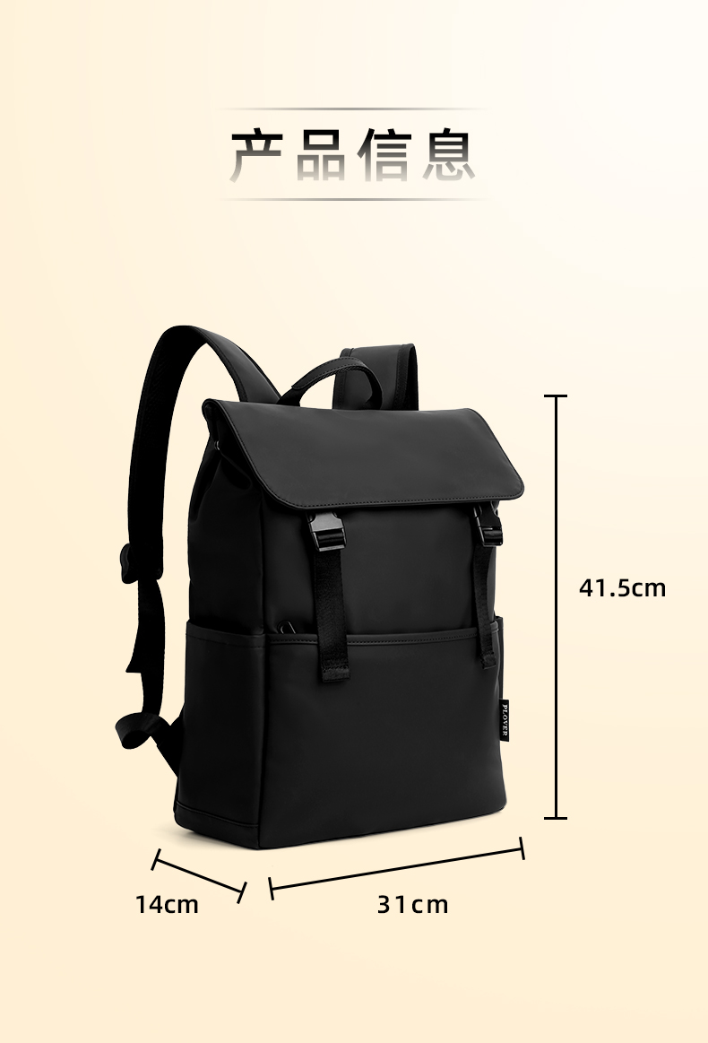 1.防水复合皮膜PU 2.侧袋【可放水杯/雨伞】 3.双插扣更安全 4.前置拉链袋 5.内电脑夹层袋 6.后置套拉杆固定带