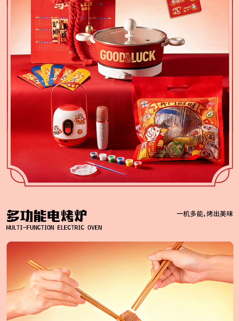 1.多功能料理锅电火锅 2.万字结*1 3.共绘美好 挂历 4.DIY颜料*1 5.旺旺礼包 6.财源滚滚 红包*6 7.蓝牙音响:7彩氛围灯、3档调节亮度、话筒*1、1800mAh