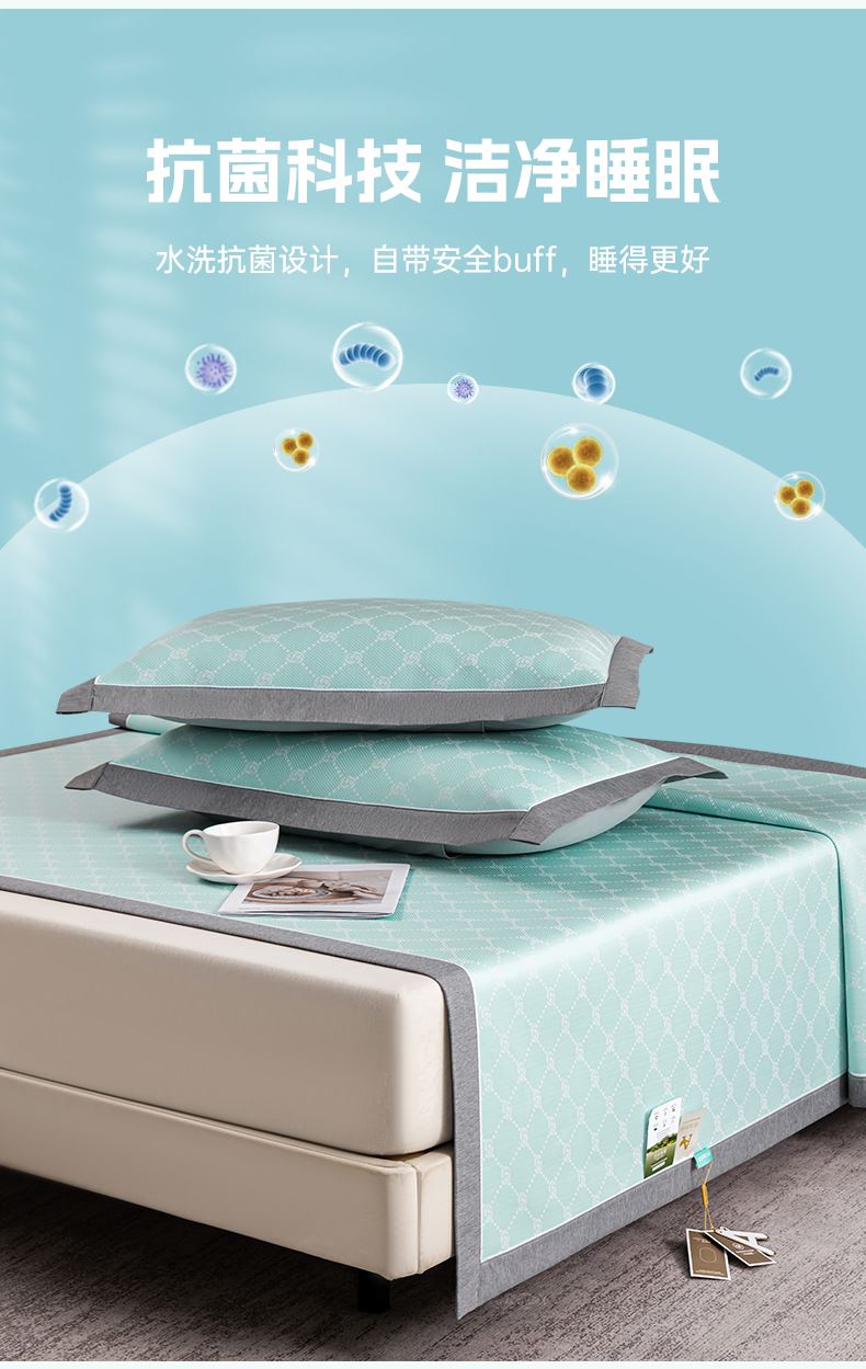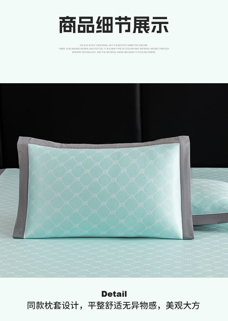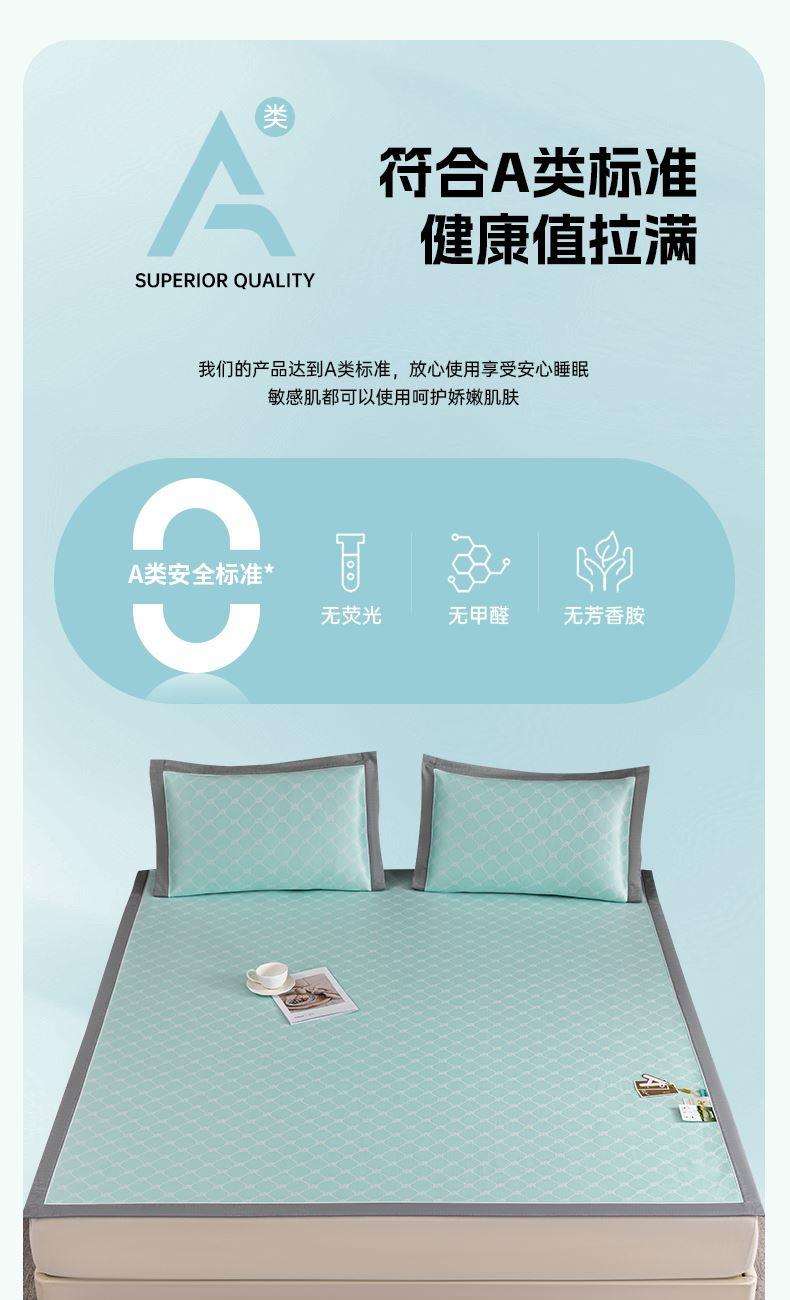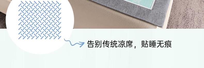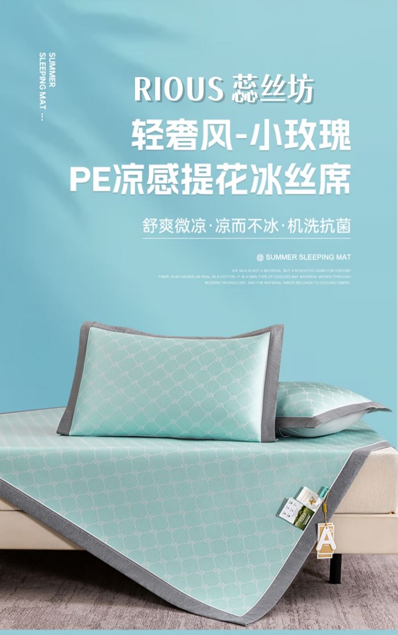 规 格:席子150*200cm 枕套48*74cm*2 花 型:灰色、绿色、香槟、湖蓝 材 质:51.4%乙纶 48.6%聚酯纤维 PE凉感提花冰丝席 舒爽微凉 凉而不冰 我们这产品达到A类标准 放心使用享受安心睡眠 敏感肌都可以使用 呵护娇嫩肌肤 全PE凉感提花冰丝面料 与众不同的丝滑手感和凉爽体验 散热性能好 凉感一触即发