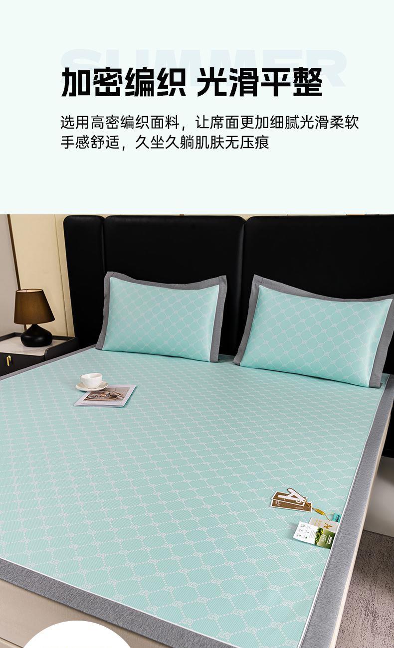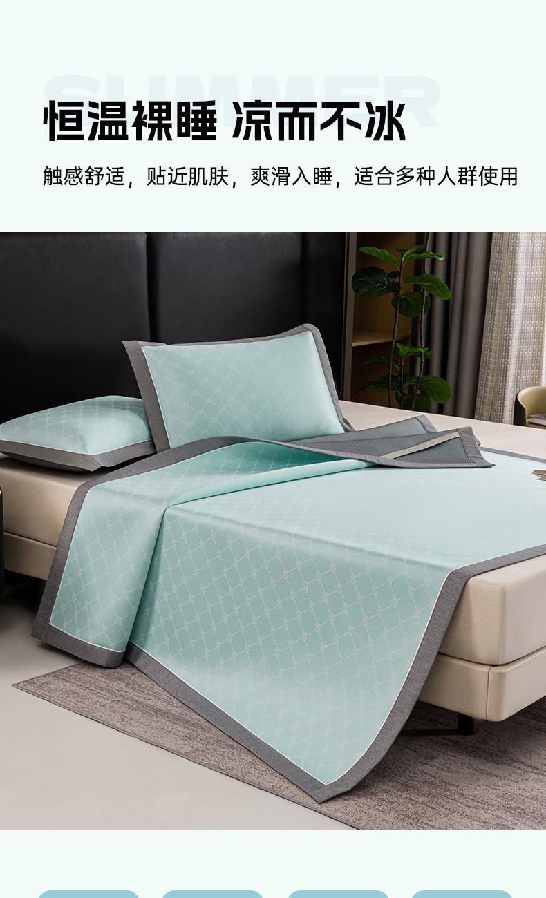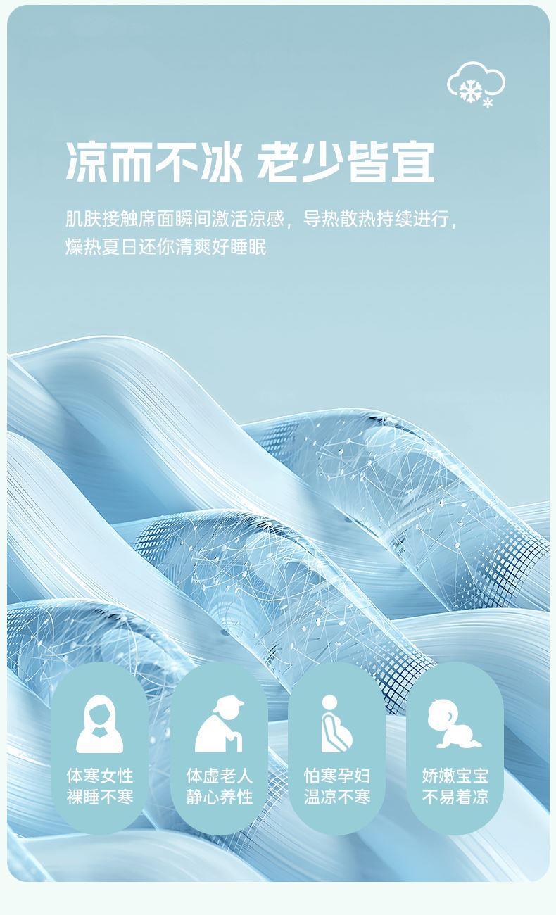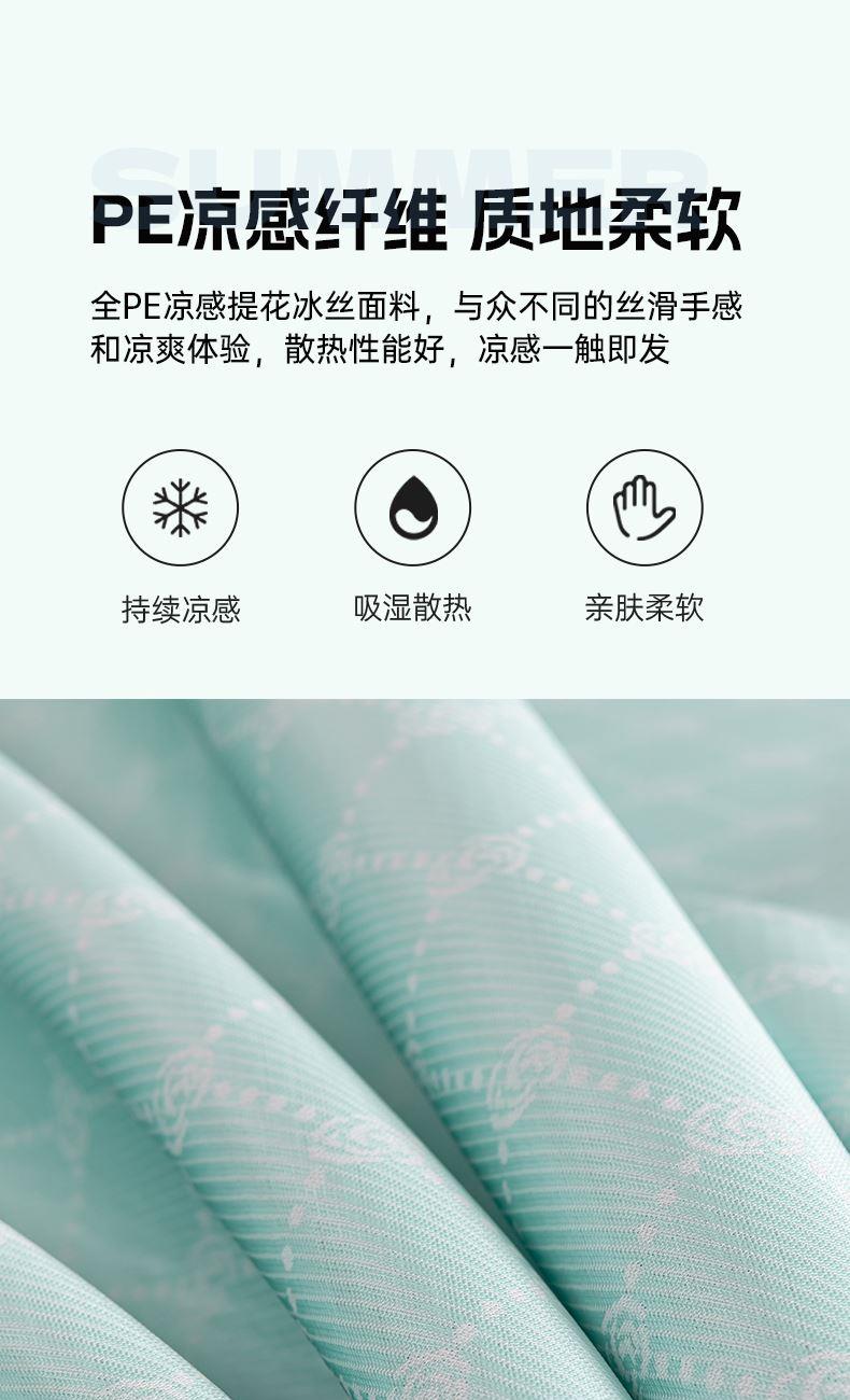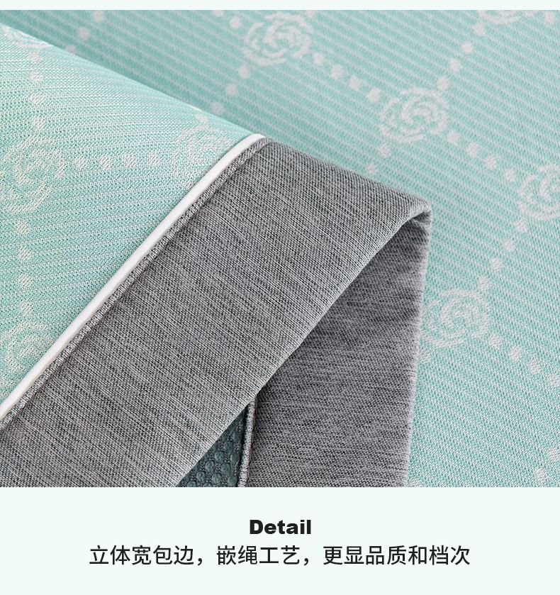 规 格:席子150*200cm 枕套48*74cm*2 花 型:灰色、绿色、香槟、湖蓝 材 质:51.4%乙纶 48.6%聚酯纤维 PE凉感提花冰丝席 舒爽微凉 凉而不冰 我们这产品达到A类标准 放心使用享受安心睡眠 敏感肌都可以使用 呵护娇嫩肌肤 全PE凉感提花冰丝面料 与众不同的丝滑手感和凉爽体验 散热性能好 凉感一触即发