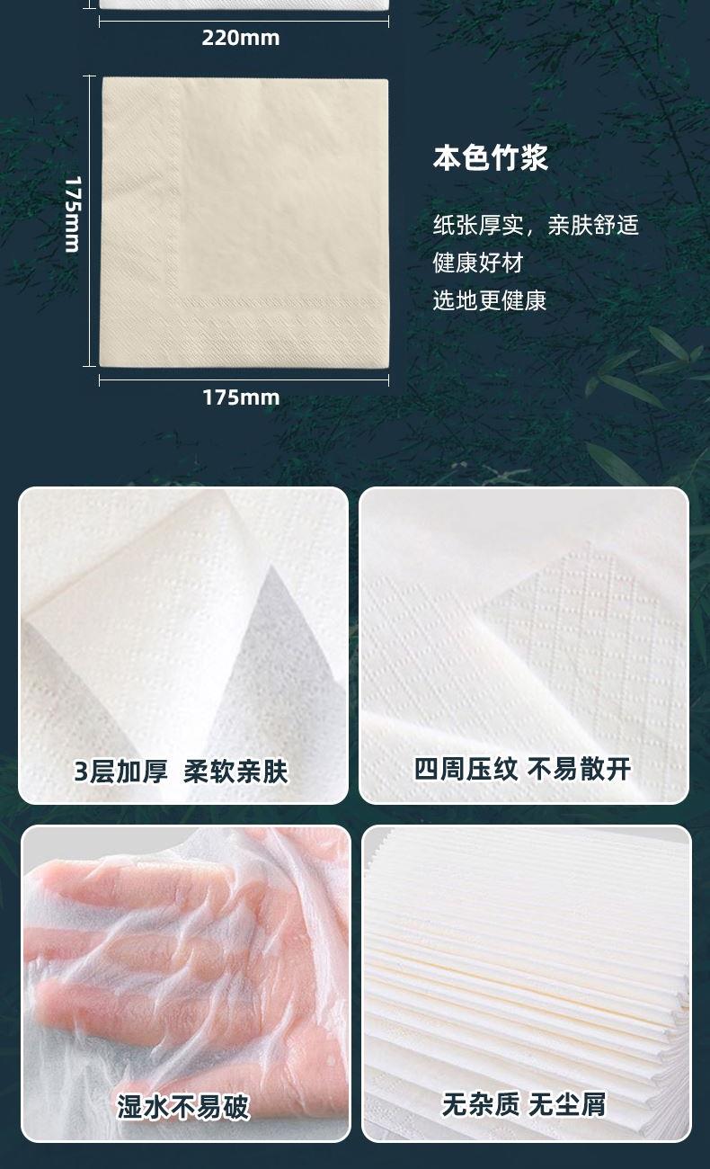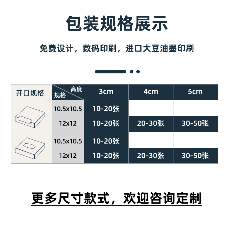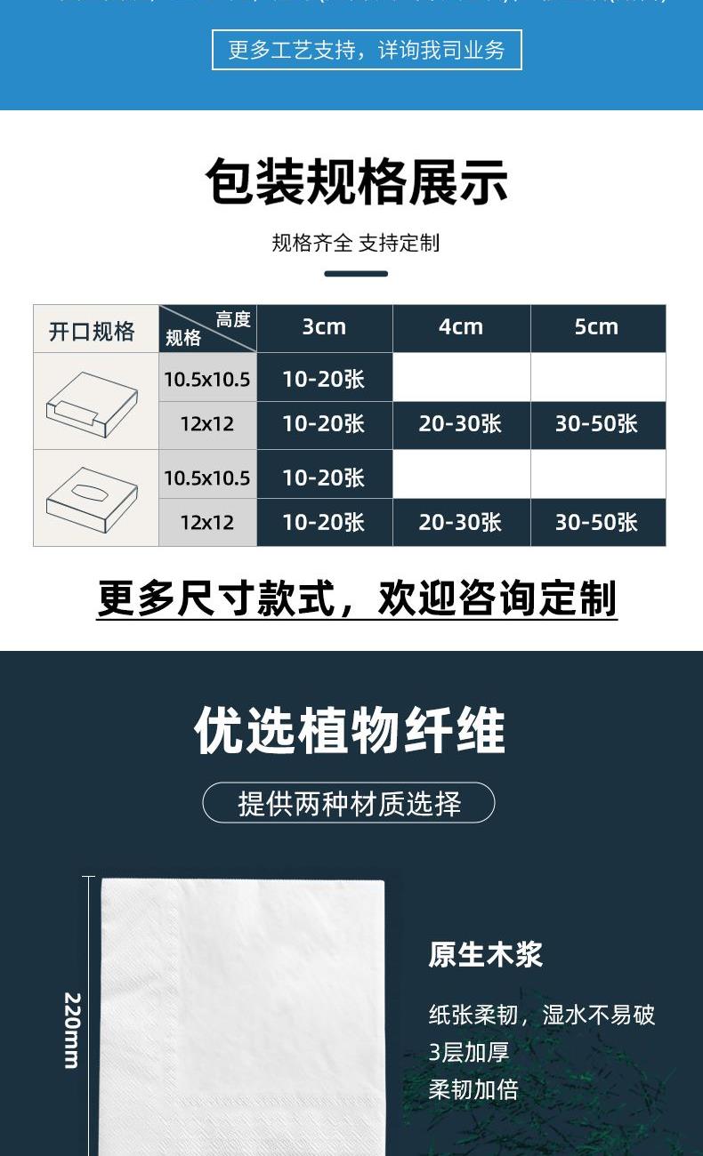 产品尺寸:120*120*40mm 内纸尺寸:220*220mm 净含量:20抽2层(40张) 外箱尺寸:64*50*65cm 主要成分:原生木浆 执行标准:GBT20808 卫生标准:GB15979 卫生许可证:(豫)卫消证字(2024)第0063号 产品等级:合格