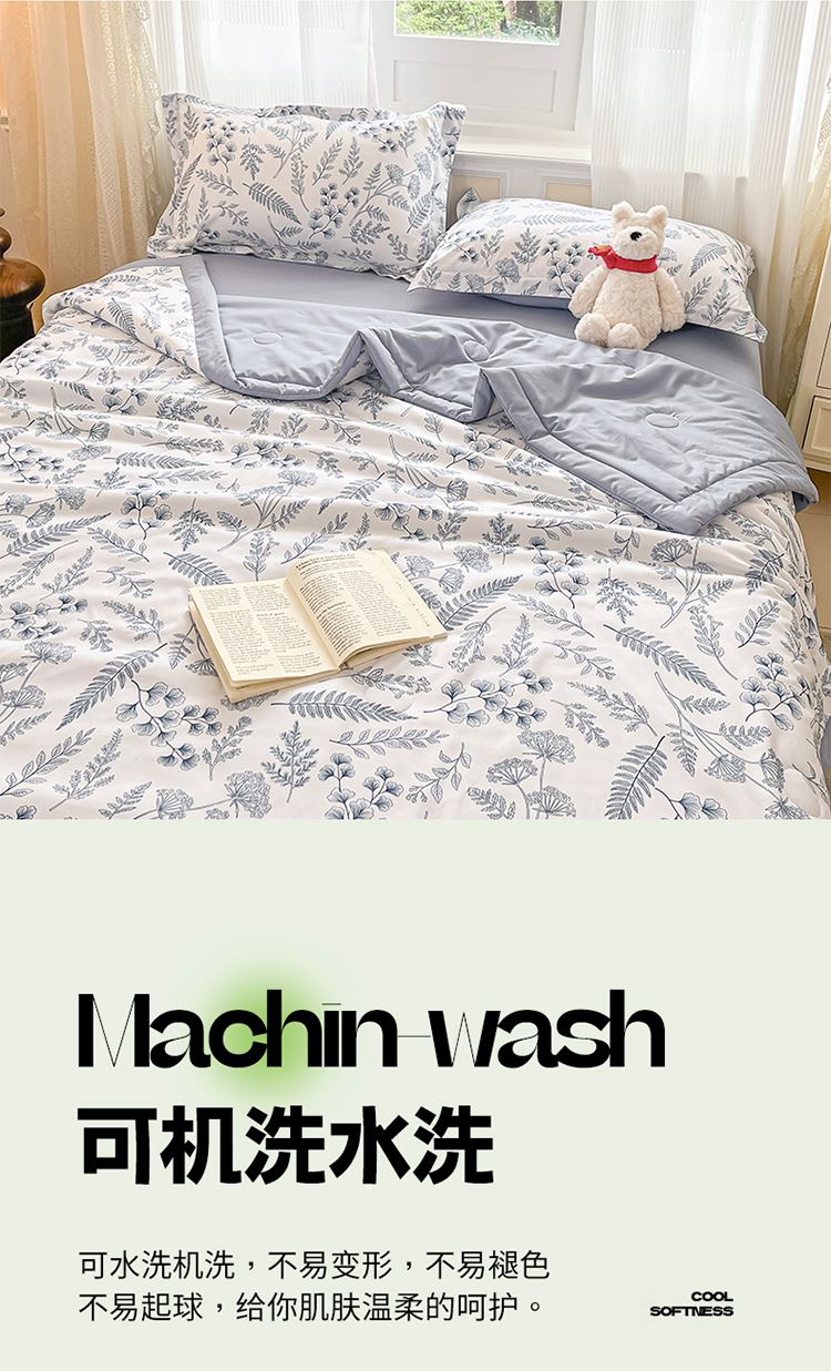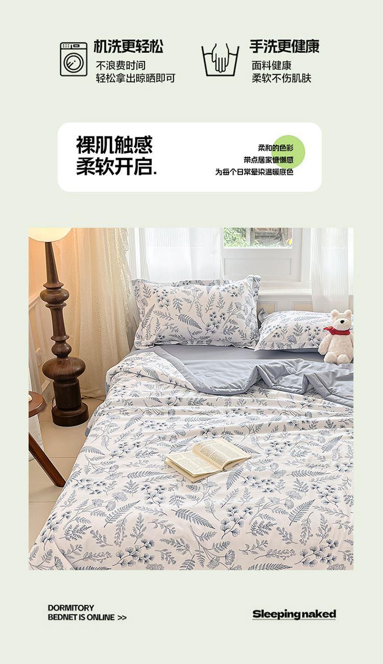 规格:150*200cm 面料:泡泡纱(聚酯纤维) 填充:羽丝棉(聚酯纤维) 重量:0.8kg 卖点: 1、云感柔软,贴身超亲肤,做工扎实,耐用好打理 2、透气不闷汗,夏天好眠,轻薄不压身,空调房必备 3、小清新颜值,卧室更清爽