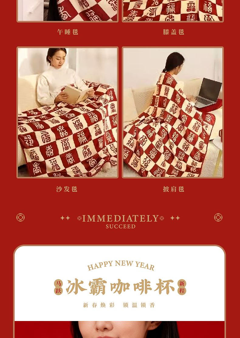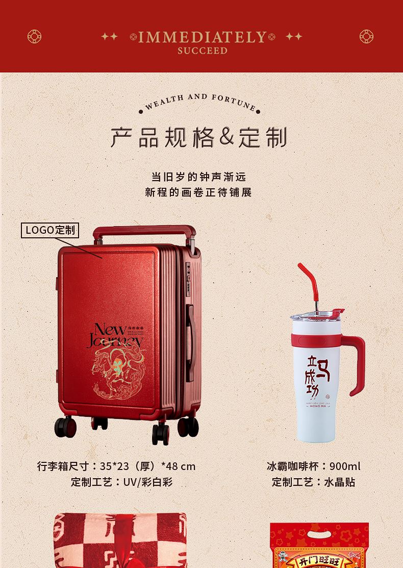 产品配置:20寸行李箱、咖啡杯*1(900ml)、法兰绒百福毯100*150、旺旺大礼包、马年大吉红包*6
