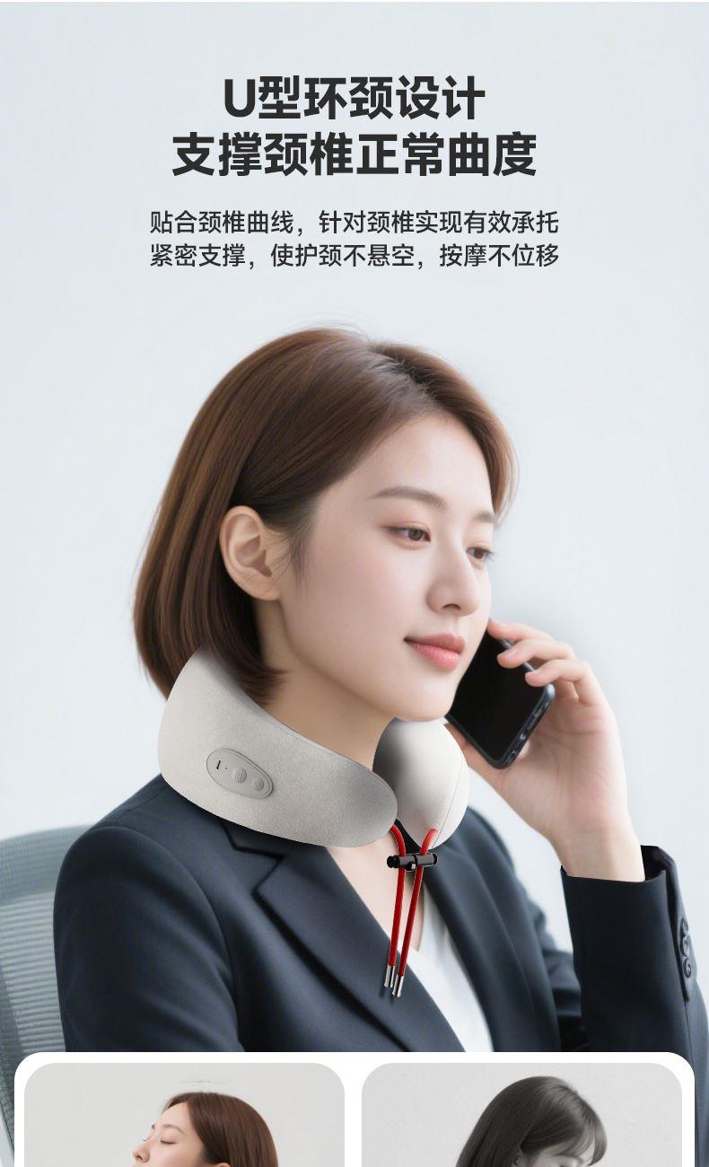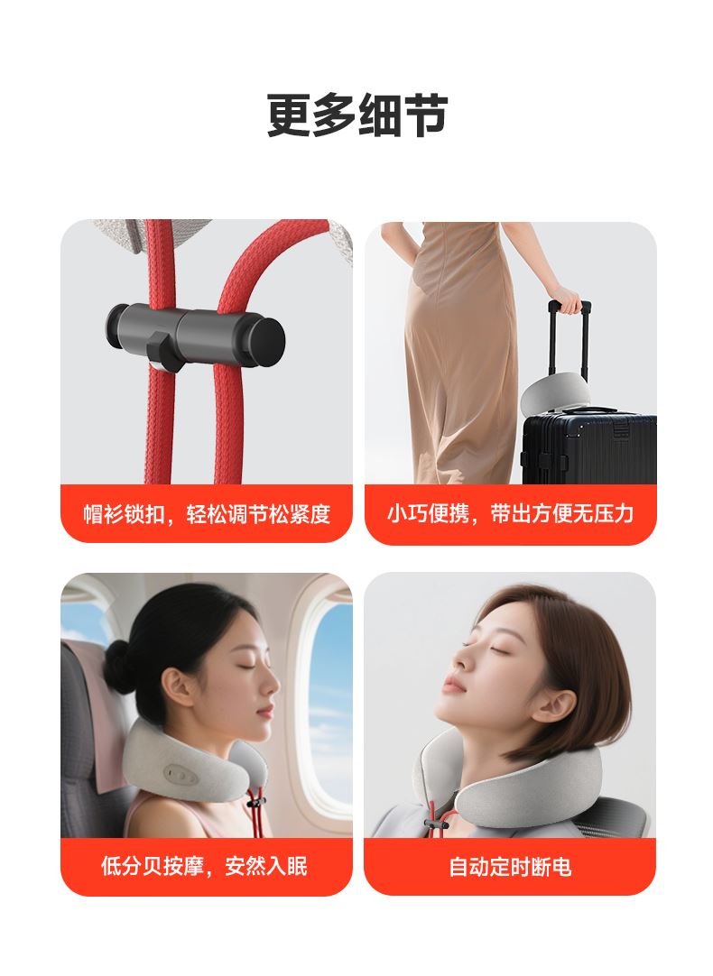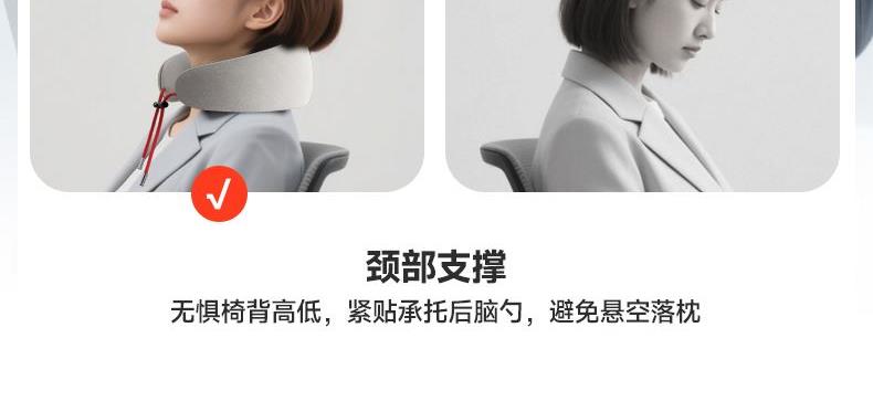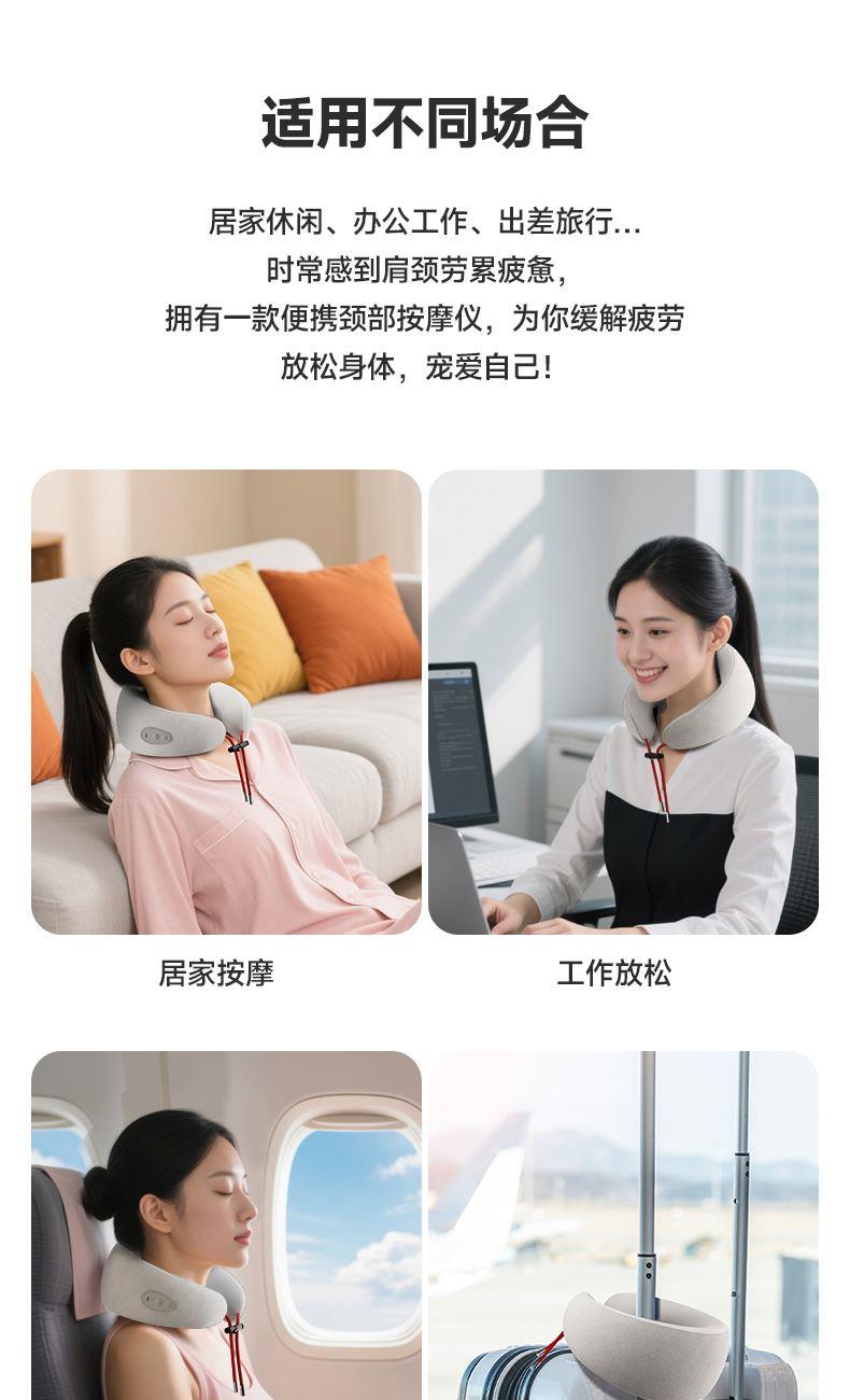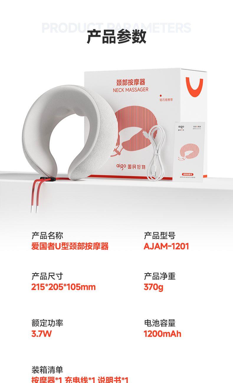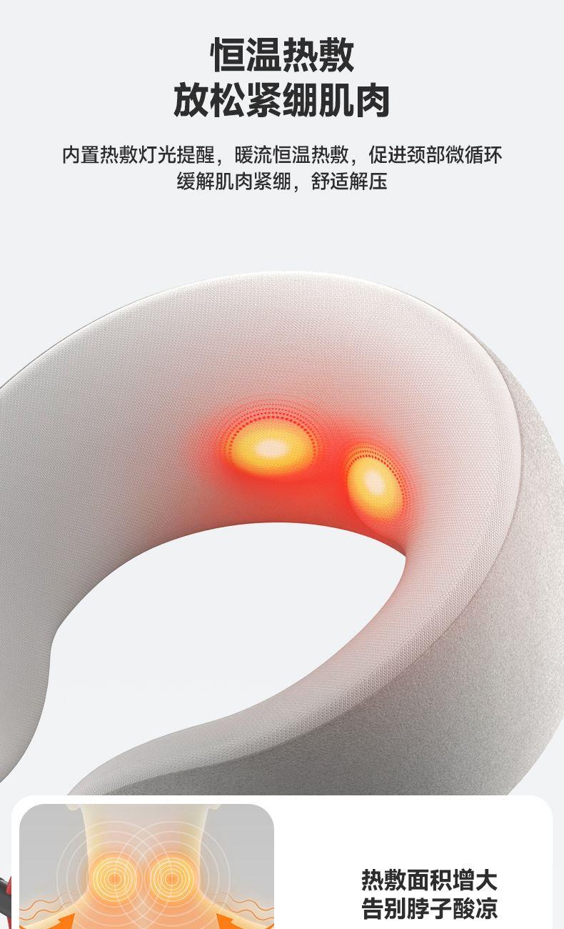 U型结构在出差午睡时支撑颈部,防止左右摇晃。 亲肤和柔软海绵,舒适感更强。 3D仿人手按摩头放松颈部肌肉,热敷促进颈部周围血液循环。 钟型拉链,可适配多种人群,出差时可方便携带。 多种按摩模式可选。 输入电压:5V/1A,额定功率:3.7W 净重/毛重:370g/520g,电池容量:1200mAh 充电方式:Type-C,产品尺寸:220*115*210mm 包装方式:彩邮外