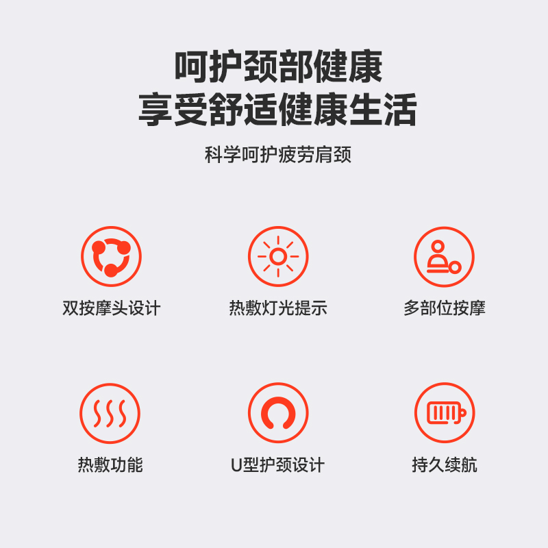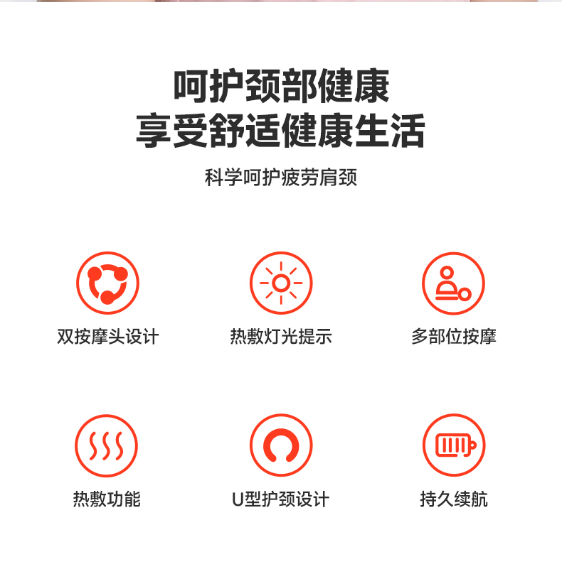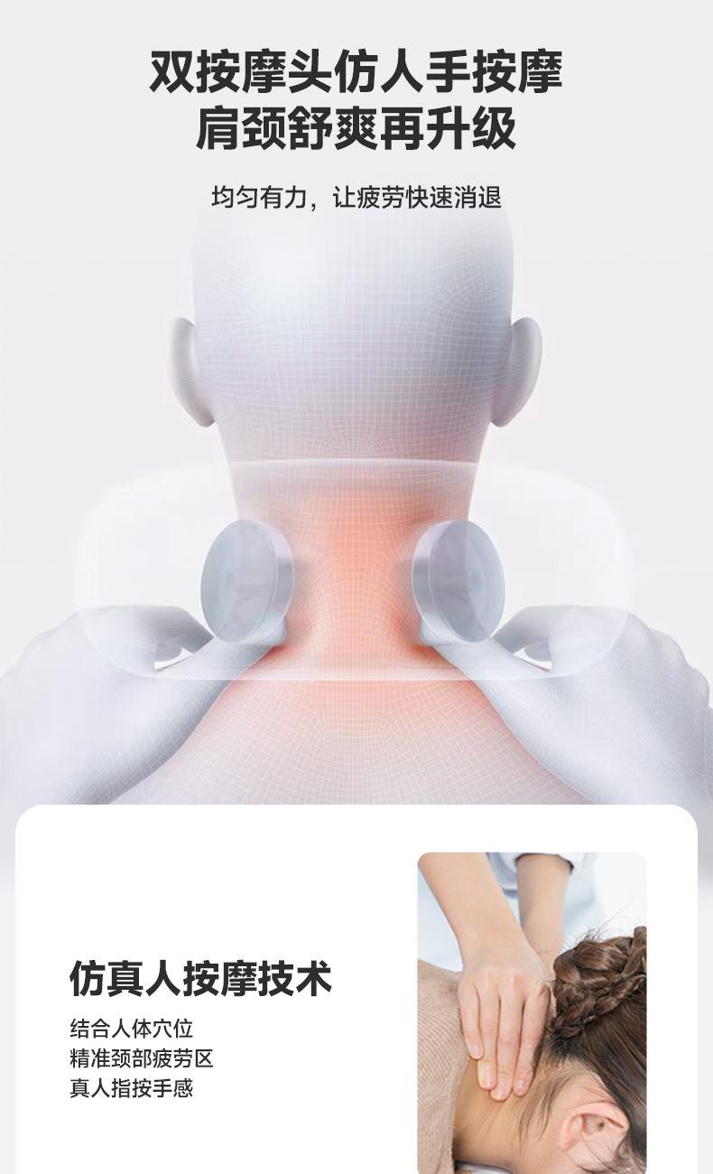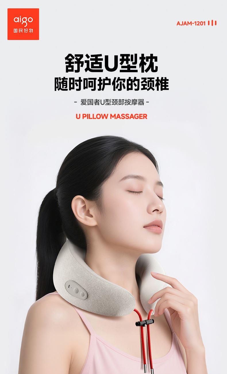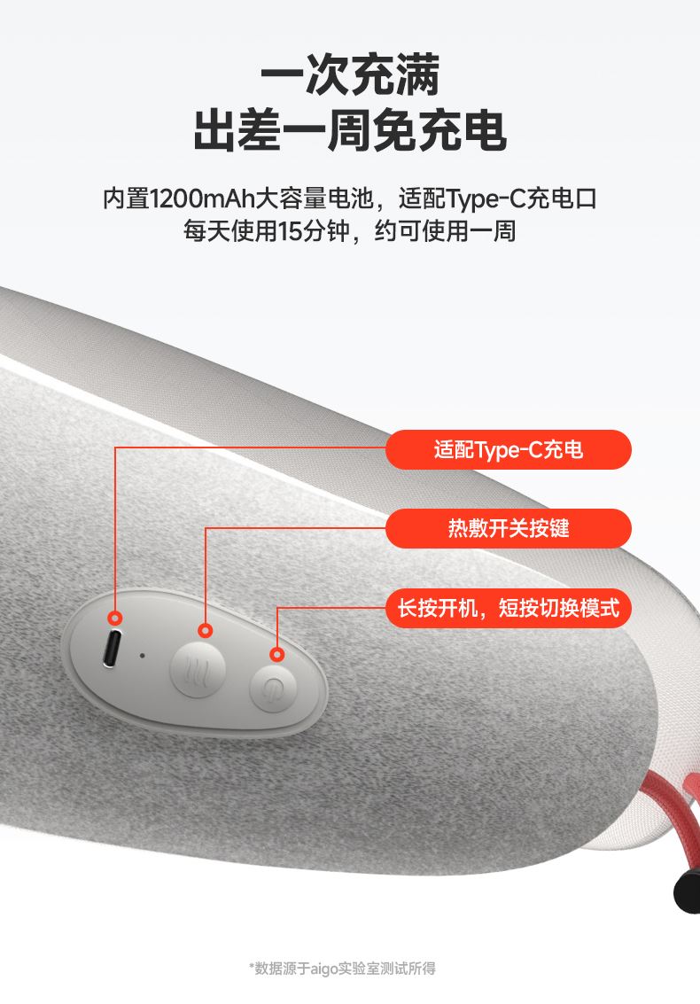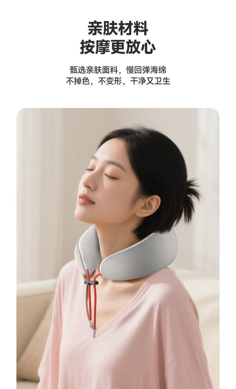 U型结构在出差午睡时支撑颈部,防止左右摇晃。 亲肤和柔软海绵,舒适感更强。 3D仿人手按摩头放松颈部肌肉,热敷促进颈部周围血液循环。 钟型拉链,可适配多种人群,出差时可方便携带。 多种按摩模式可选。 输入电压:5V/1A,额定功率:3.7W 净重/毛重:370g/520g,电池容量:1200mAh 充电方式:Type-C,产品尺寸:220*115*210mm 包装方式:彩邮外