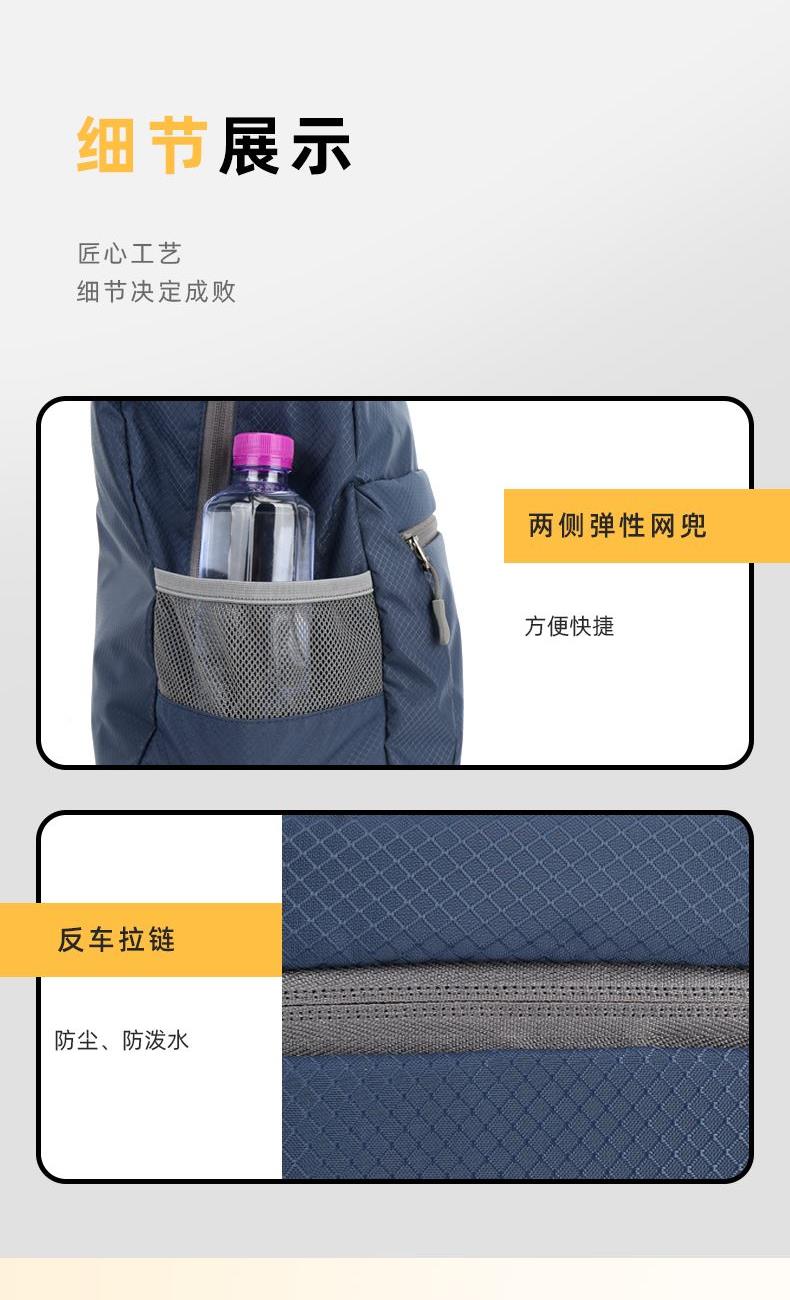 1.尼龙防水料 2.松紧调节侧袋【可放水杯/雨伞】 3.可以折叠 4.前置拉链袋 5.内吊袋/插袋