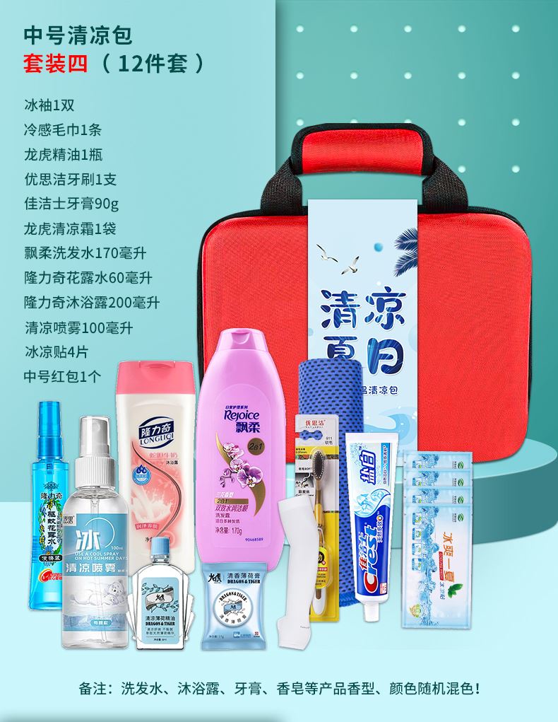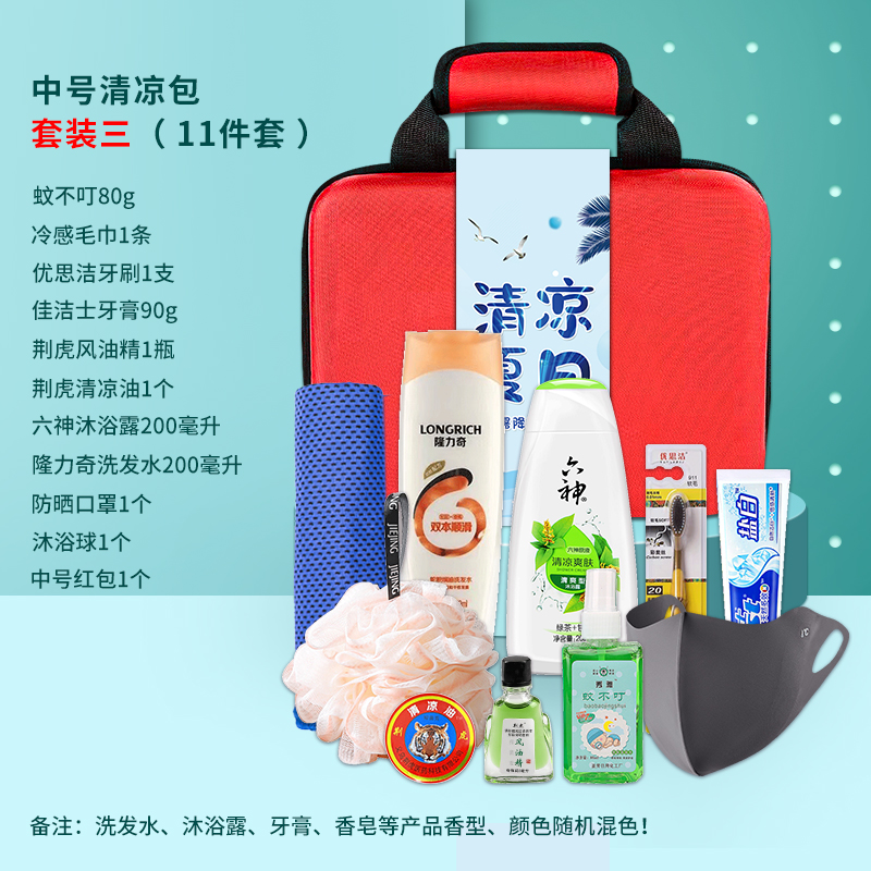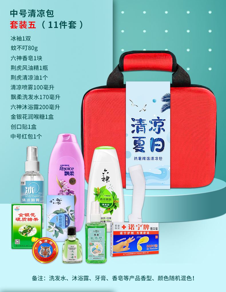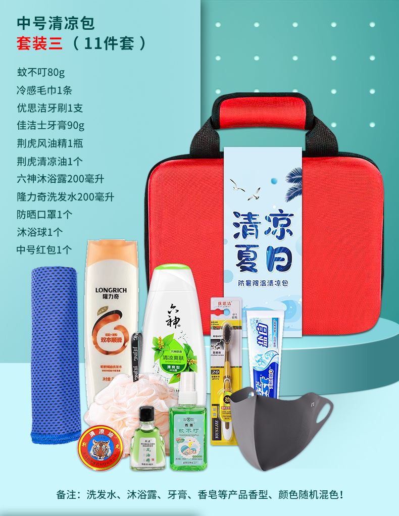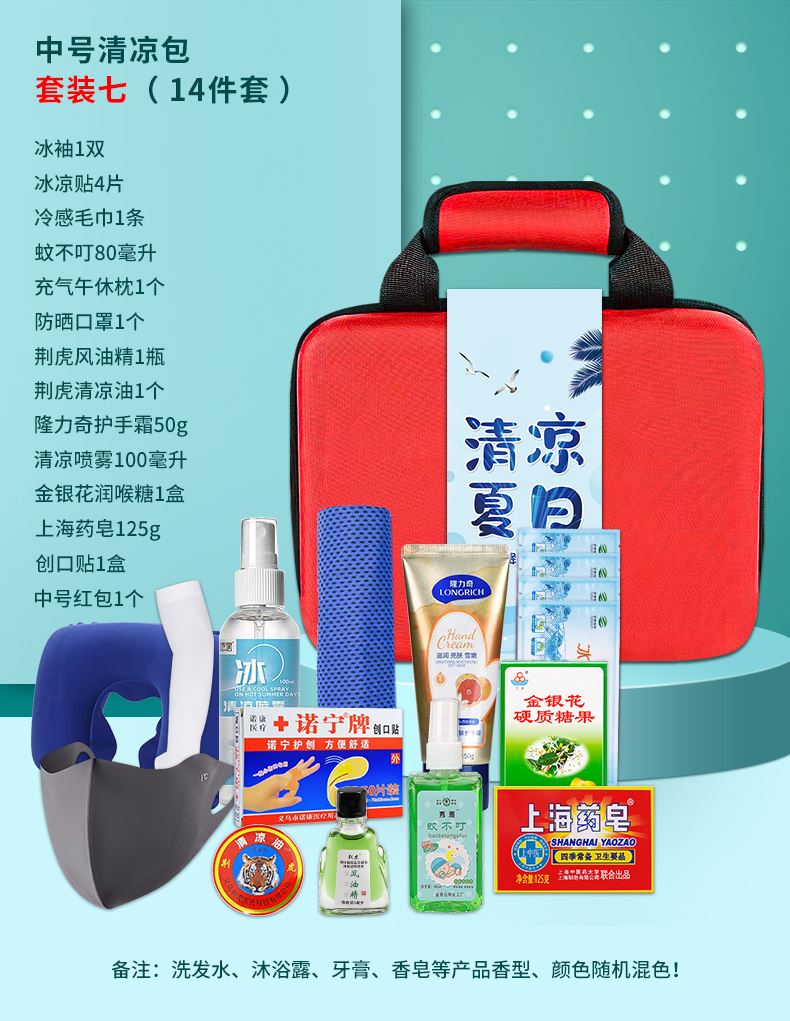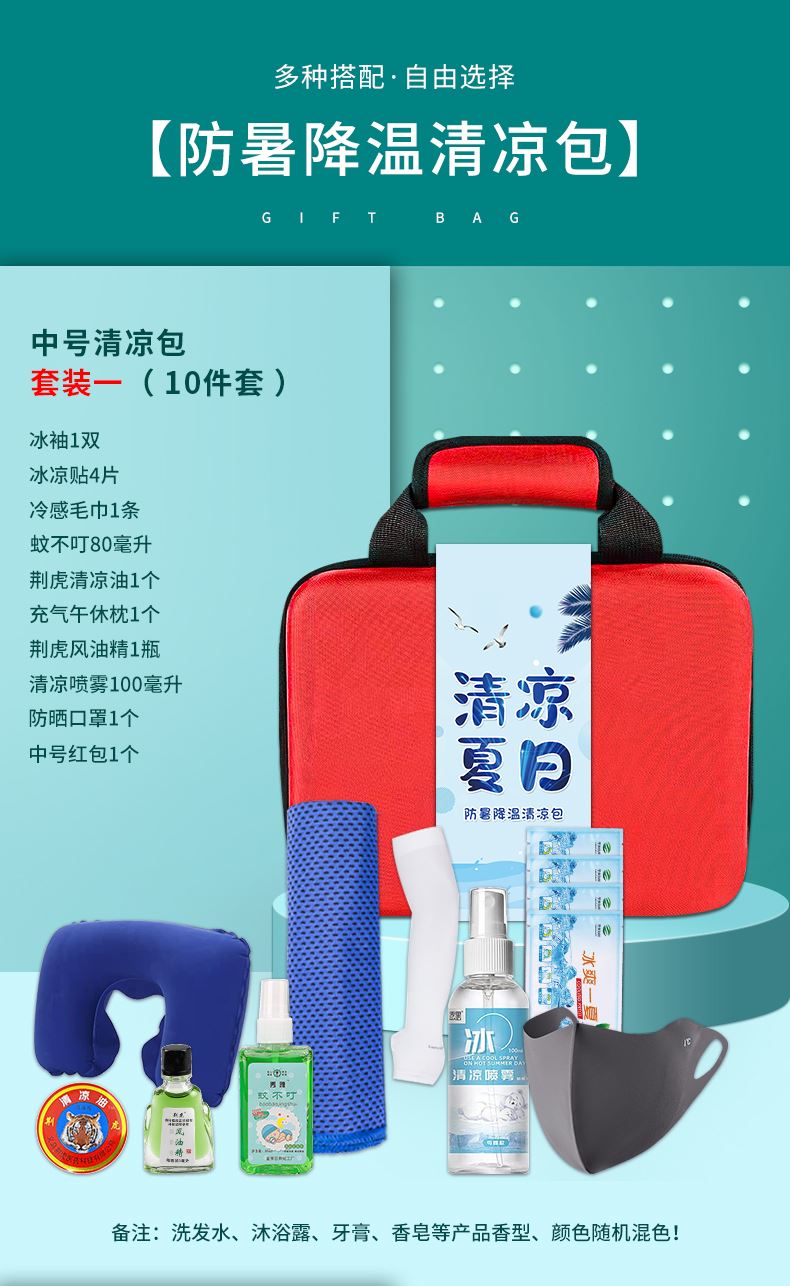 1.注:商城报价对应首张主图款式! 其他套装参考细节图,费用另计! 2. 咨询下单请备注好产品信息! 3.首图款式产品明细:中号清凉包套装一(10件套):冰袖1双 ,冰凉贴4片,冷感毛巾1条,蚊不叮80毫升,荆虎清凉油1个,充气午休枕1个,荆虎风油精1瓶,防晒口罩1个,清凉喷雾100毫升,中号红包1个