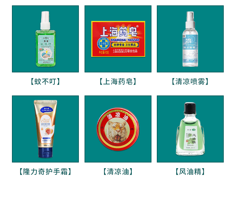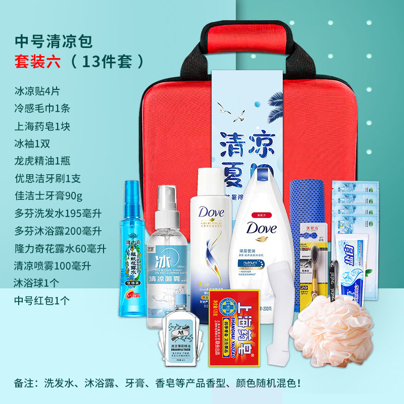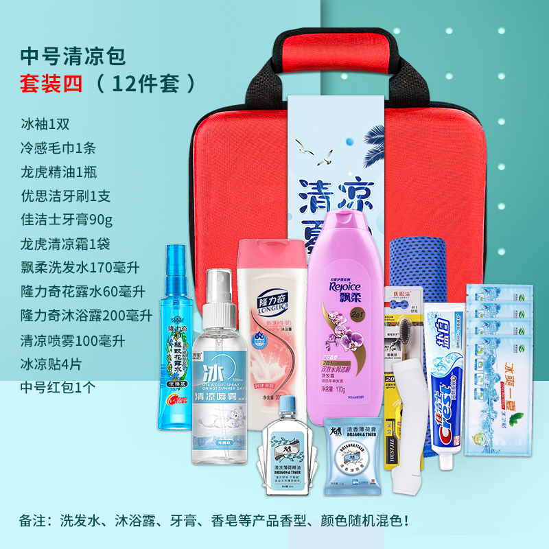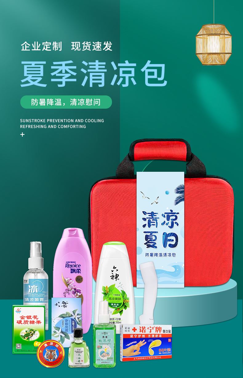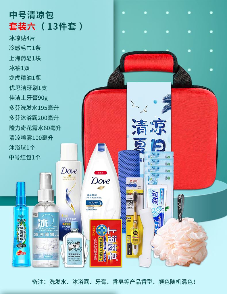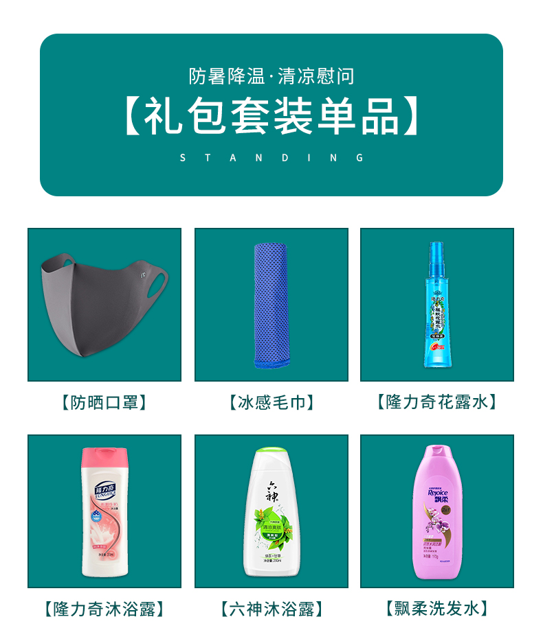 1.注:商城报价对应首张主图款式! 其他套装参考细节图,费用另计! 2. 咨询下单请备注好产品信息! 3.首图款式产品明细:中号清凉包套装一(10件套):冰袖1双 ,冰凉贴4片,冷感毛巾1条,蚊不叮80毫升,荆虎清凉油1个,充气午休枕1个,荆虎风油精1瓶,防晒口罩1个,清凉喷雾100毫升,中号红包1个