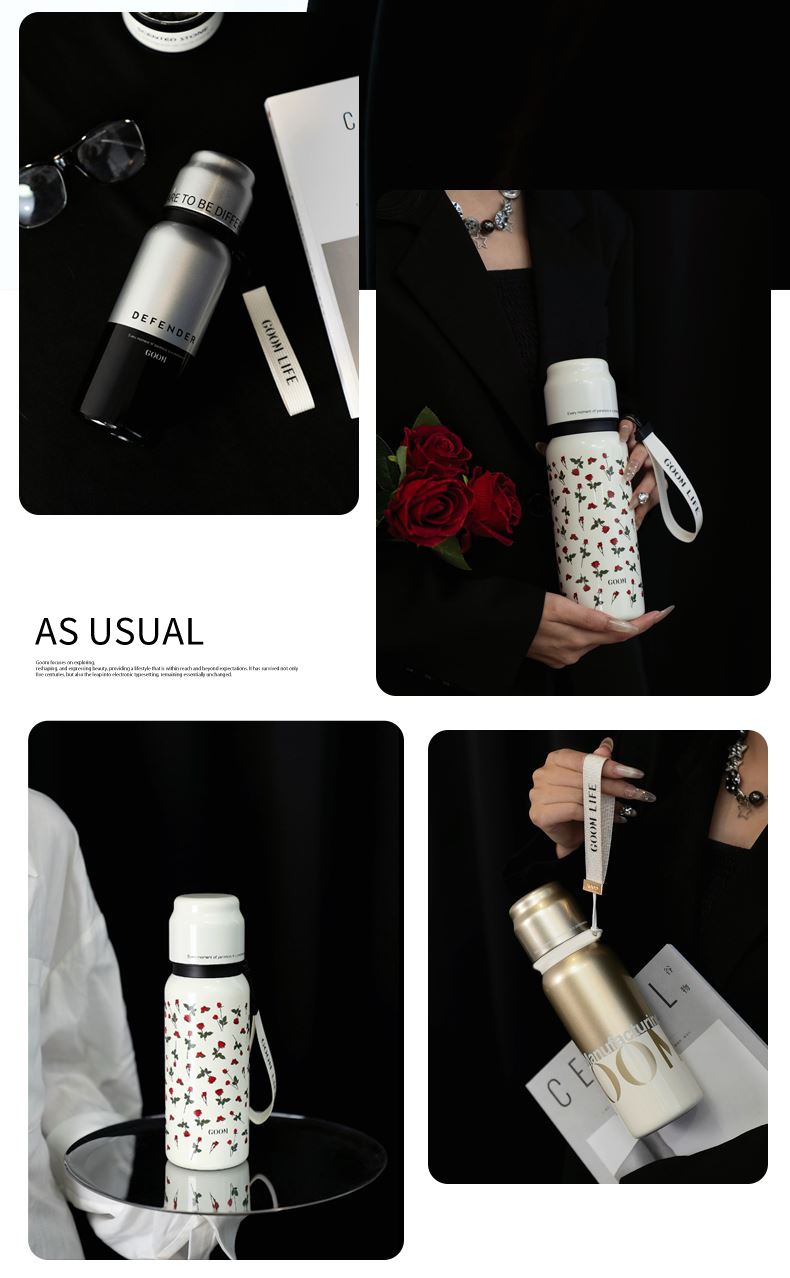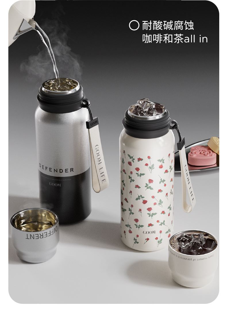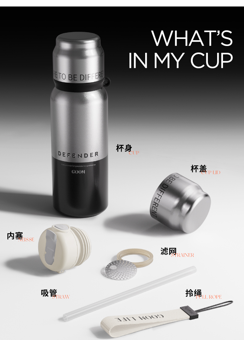 材 质:内胆—奥氏体不锈钢S31603,外壳/杯盖/滤网—奥氏体不锈钢S30408,内塞/吸管—PP聚丙烯(丙烯均聚物),密封件-硅橡胶,手提绳-蜡绳、锌合金、涤纶