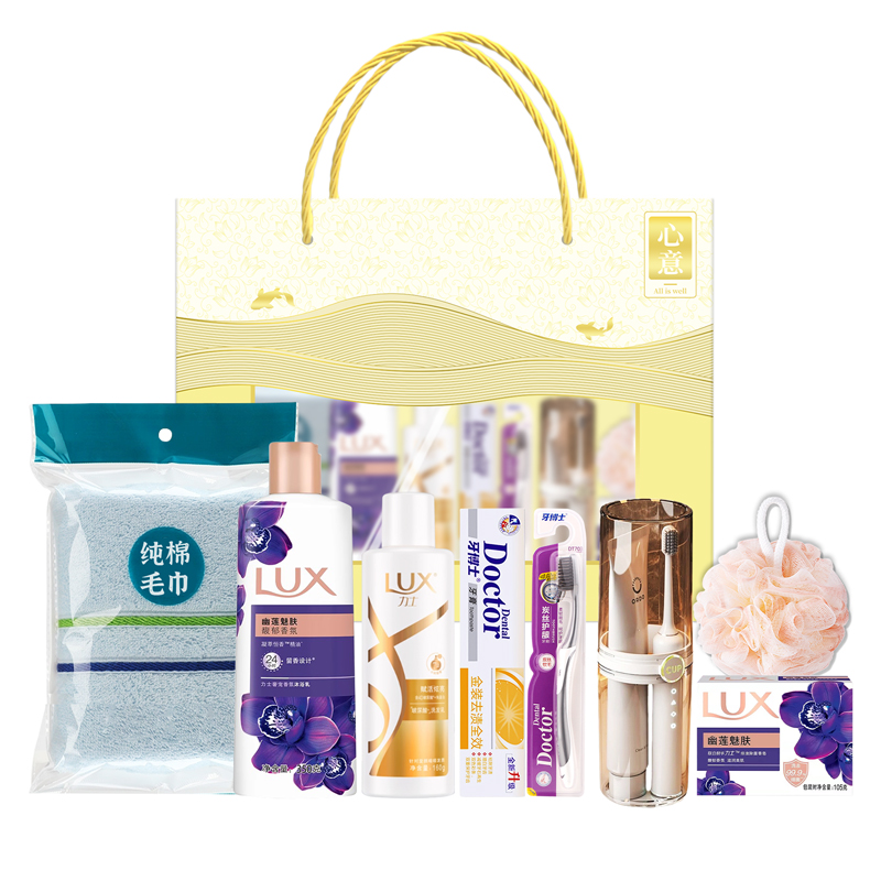礼盒尺寸:40*13*28cm 包装尺寸:42*80*30cm 产品配置:(香型随机) 力士洗发水160ml 力士沐浴露350ml 牙博士牙膏105g 牙博士牙刷炭丝护龈 透明洗漱杯旅行便携式 沐浴球 力士香皂105g 纯棉毛巾73*33cm