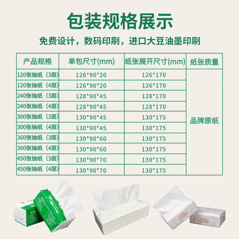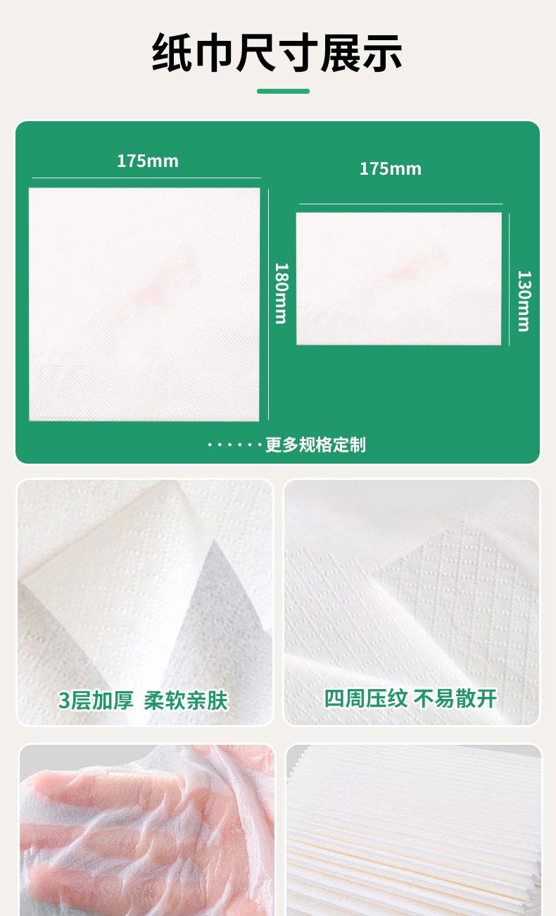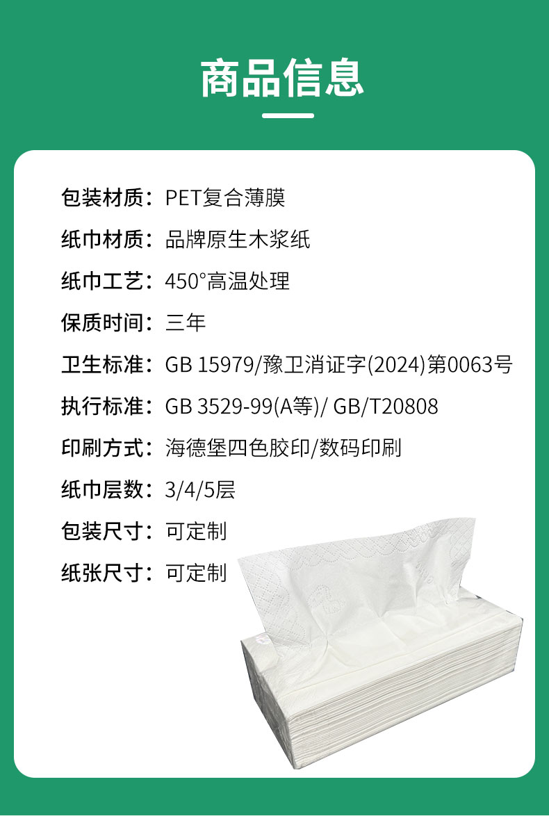 产品尺寸:142*90*52mm 内纸尺寸:142*175mm 净含量:120抽3层(360张) 外箱尺寸:64*50*65cm 主要成分:原生木浆 执行标准:GBT20808 卫生标准:GB15979 卫生许可证:(豫)卫消证字(2024)第0063号 产品等级:合格
