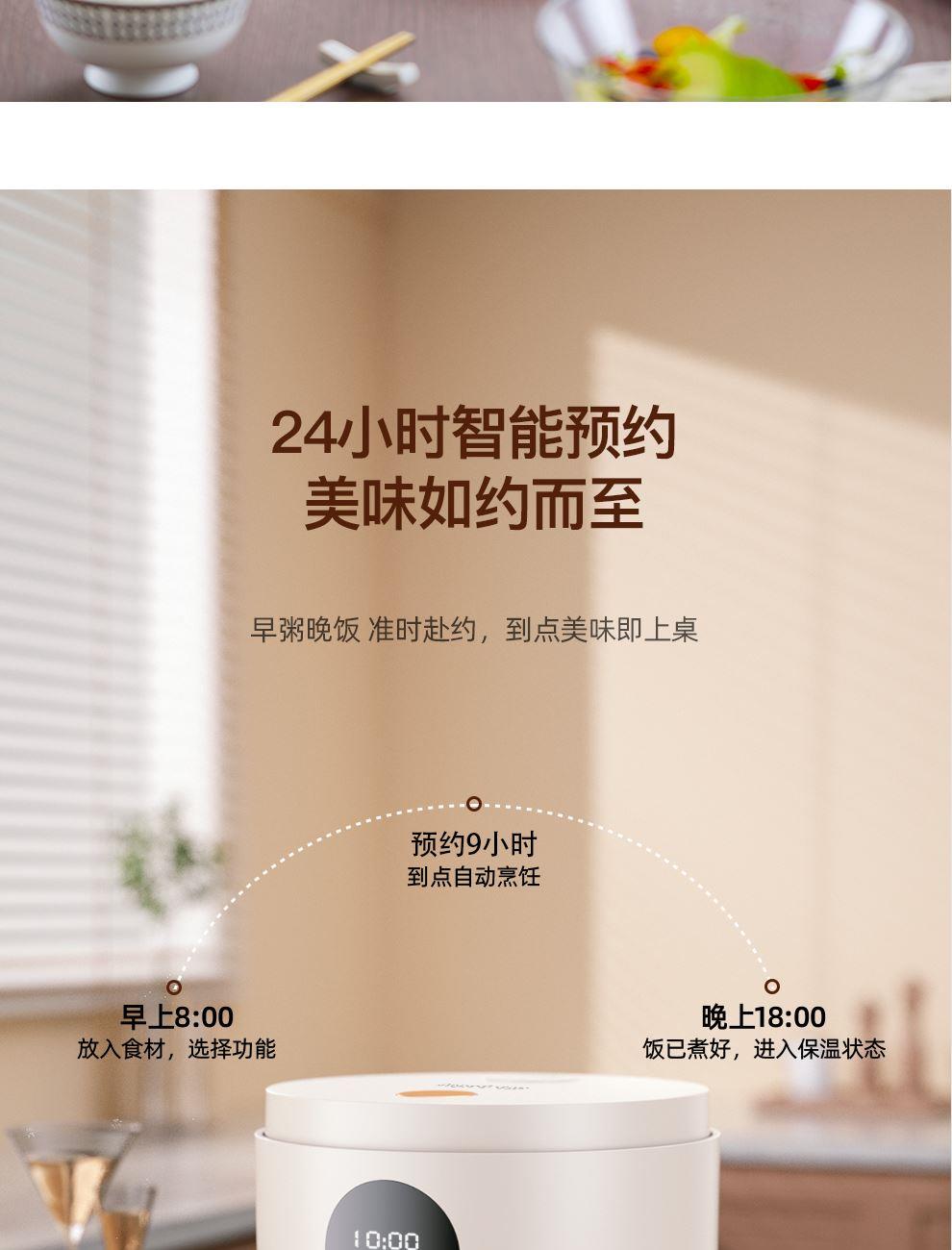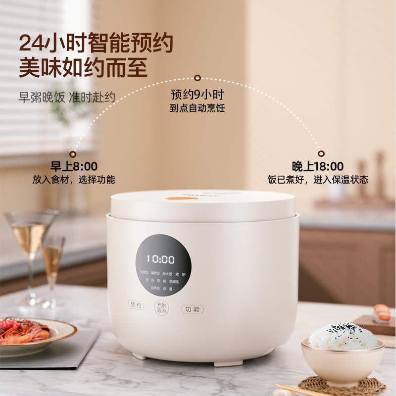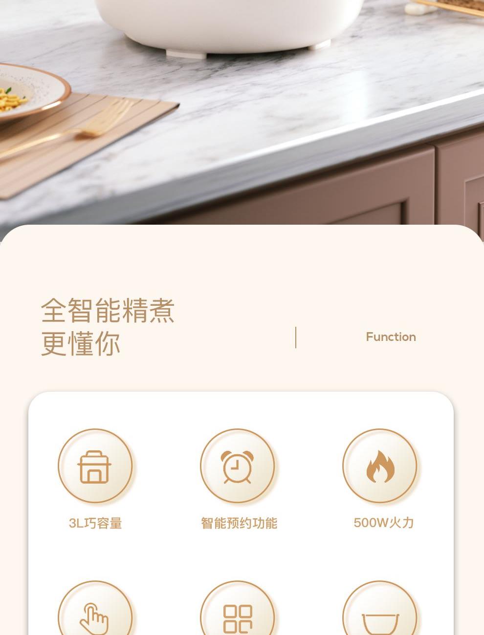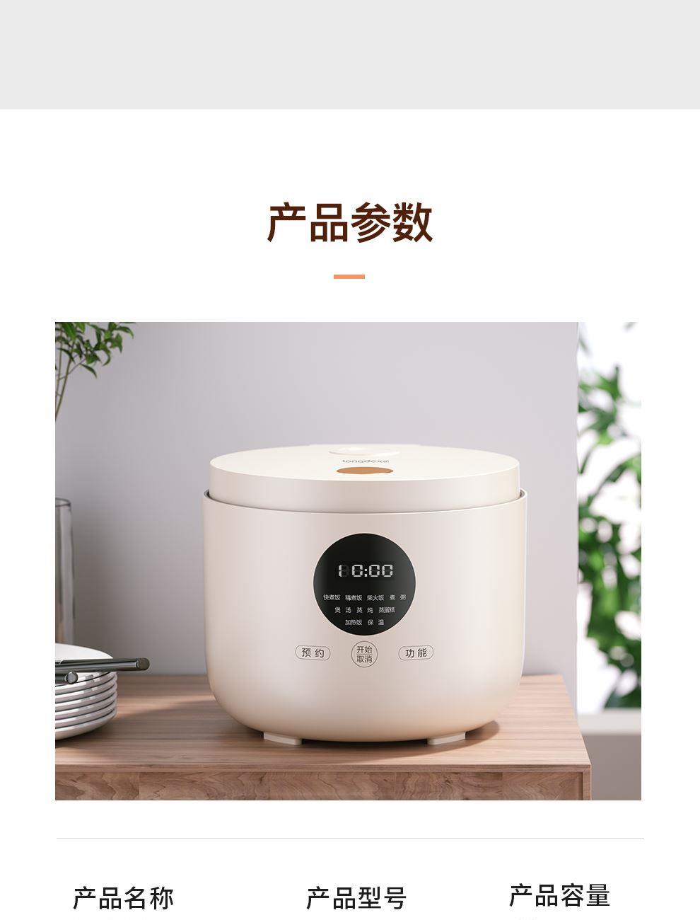 额定功率:500W 产品容量:3.0L 额定电压:220V~ 产品频率:50Hz 产品净重:2.0kg 产品毛重:2.4kg 整箱重量:15.6kg 装 箱 数:6台/箱 双层防烫双层防烫,食品级铝合金不粘内胆 触控菜单多功能触控菜单选择,数码显示 智能预约24小时智能预约、长效保温 铝合金发热盘波浪环形发热盘,聚能发热