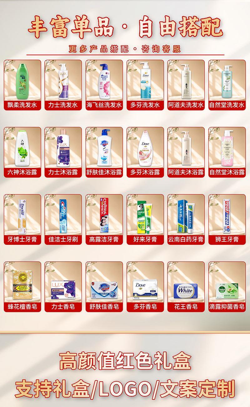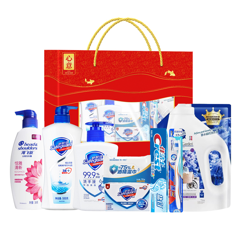 礼盒尺寸:32*8.5*24.5cm 包装尺寸:66*46.5*51CM 产品配置:(香型随机) 海飞丝洗发水-300ml 舒肤佳沐浴露-550ml 蔬果园洗衣液-500g 佳洁士牙膏-90g 三笑牙刷 舒肤佳洗手液-225ml 海氏海诺酒精湿巾-10抽/包 舒肤佳香皂-100g 精美礼盒