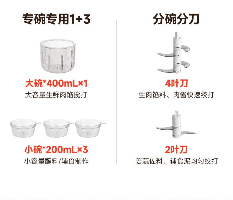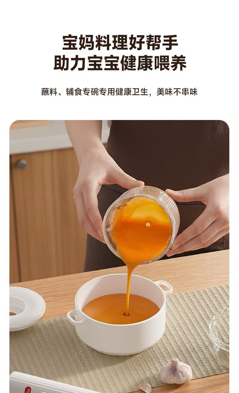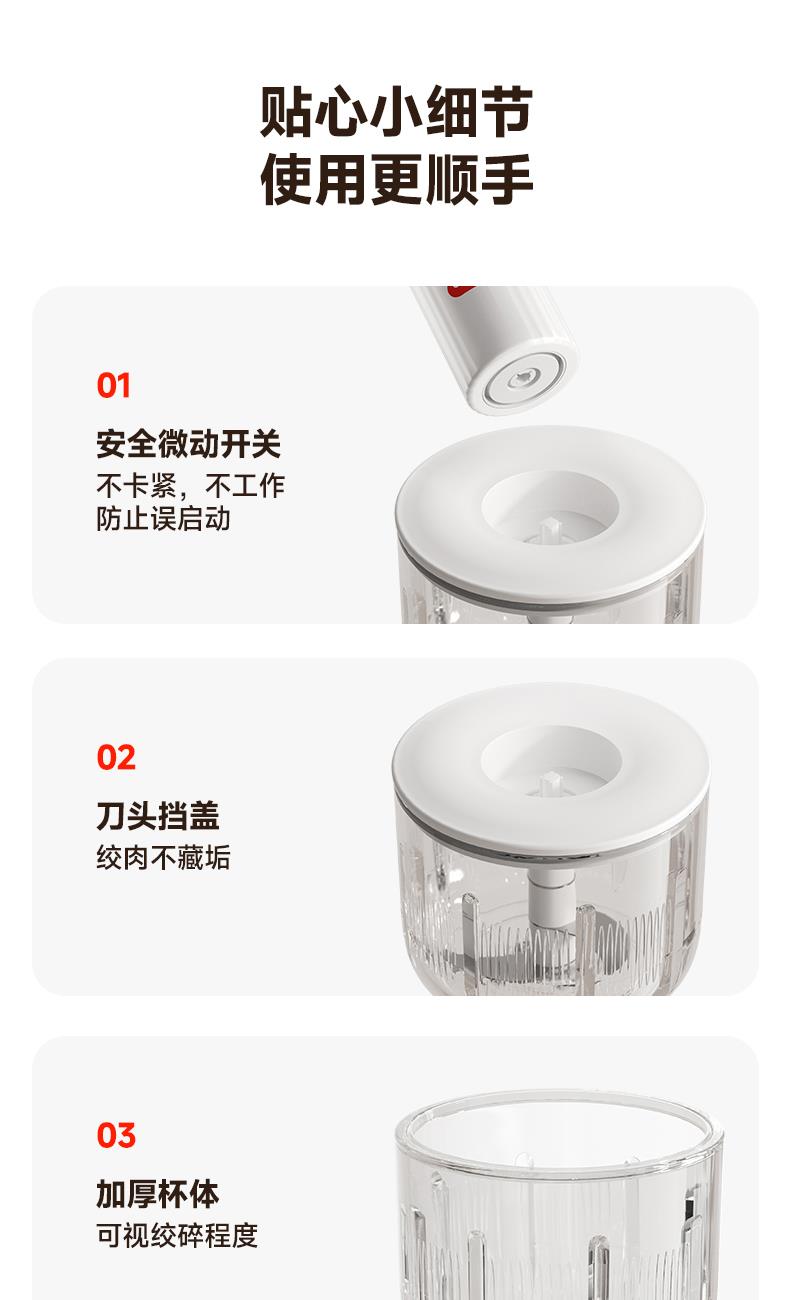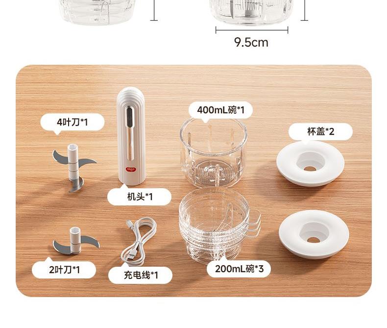 Type-C快充3-4小时,满电搅打20次; 大杯搅肉泥400mL,小杯200mL做果酱,四叶/两叶刀片按需切换; 卡刀自停+双重保护;食材过量自动断电,电压异常红灯预警,小白操作零风险; 极简料理逻辑30秒,点动开关一按即用,单手操作解放宝 妈。 功率:30W 电池容量:1300mAh 毛重:540g 包装方式:彩邮外 包装尺寸:125*125*175mm