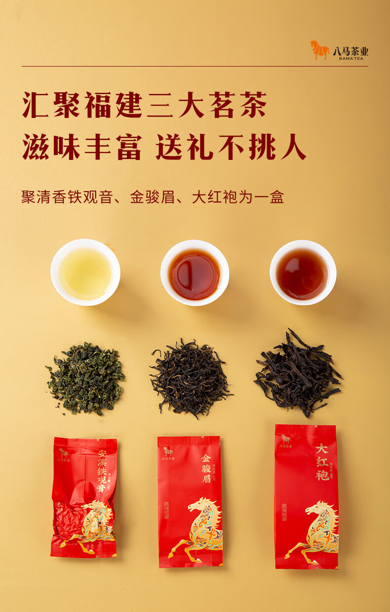 多品类覆盖:包含安溪铁观音、大红袍、金骏眉三大福建经典名茶,能同时满足清香(铁观音)、岩韵(大红袍)、蜜香(金骏眉)等不同口感偏好;