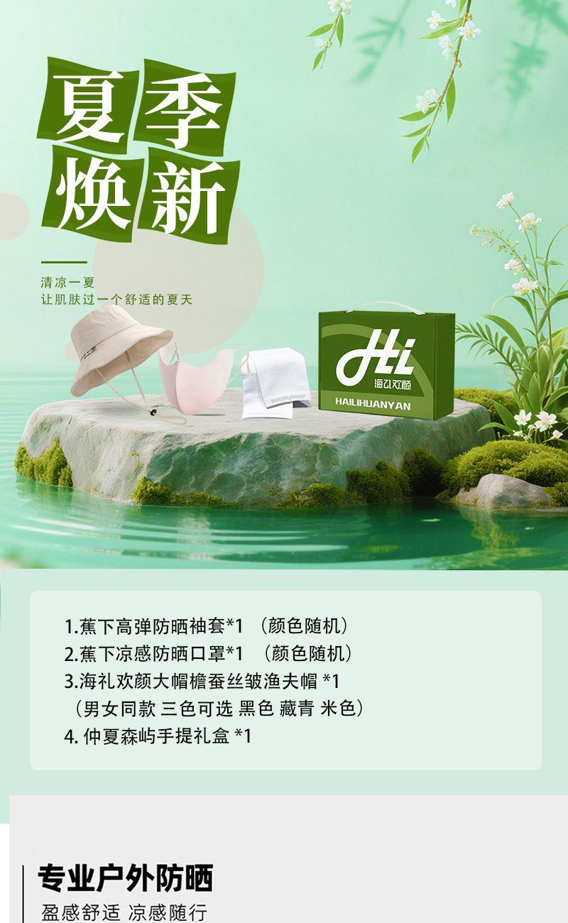 1.蕉下高弹防晒袖套*1 (颜色随机) 2.蕉下凉感防晒口罩*1 (颜色随机) 3.海礼欢颜大帽檐蚕丝皱渔夫帽 *1 (男女同款 三色可选 黑色 藏青 米色) 4. 仲夏森屿手提礼盒 *1 (如图)