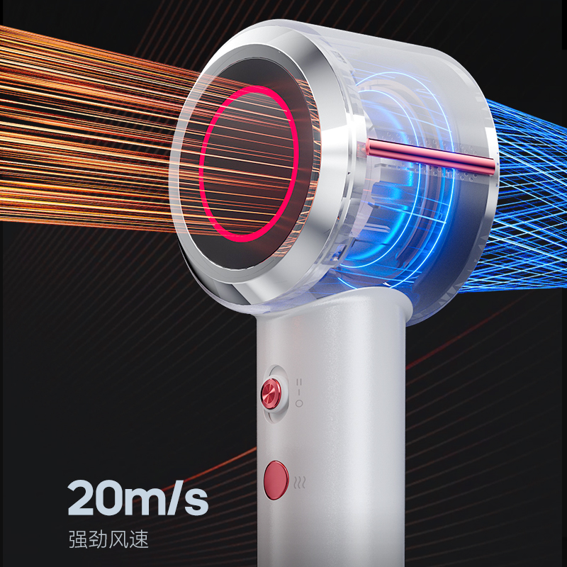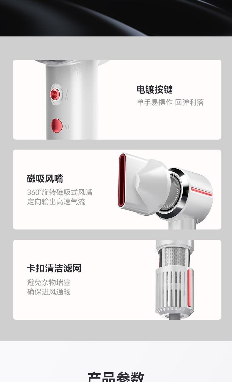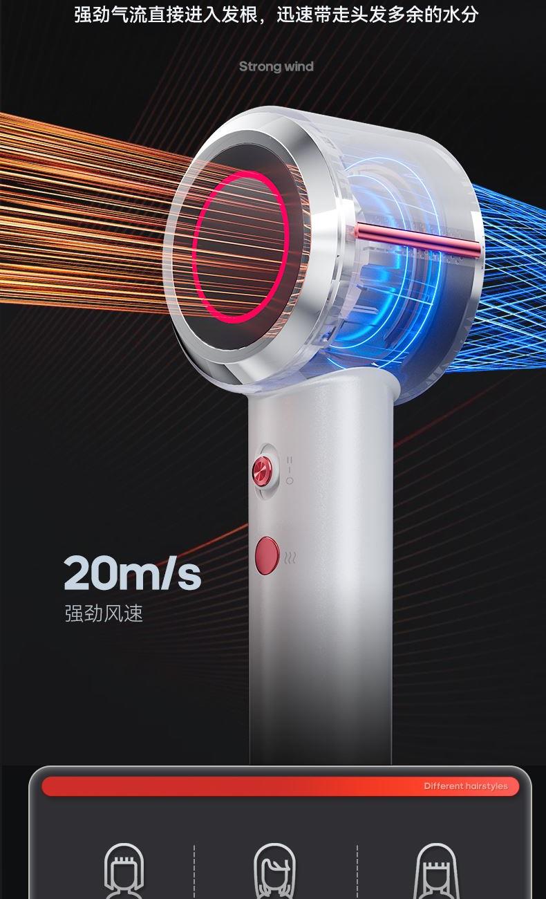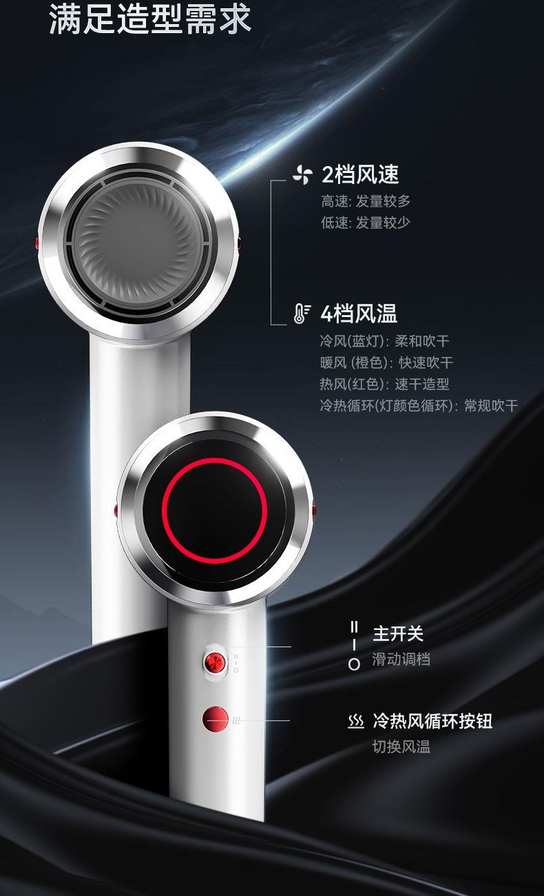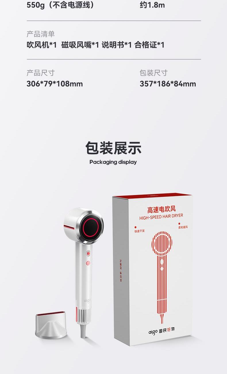 冷热风循环按钮:三色切换风温:蓝色-红色-橙色 360°磁吸风嘴 2重精滤进风网,8重科技降噪 110000转/分无刷电机 6亿负离子,65m/s劲风 8重降噪,体型小巧,1600W大功率 3档风速,3档温度 383g便携机身 功率:1600W 包装尺寸:351*181*79mm 包装方式:彩邮外 毛重:0.54Kg