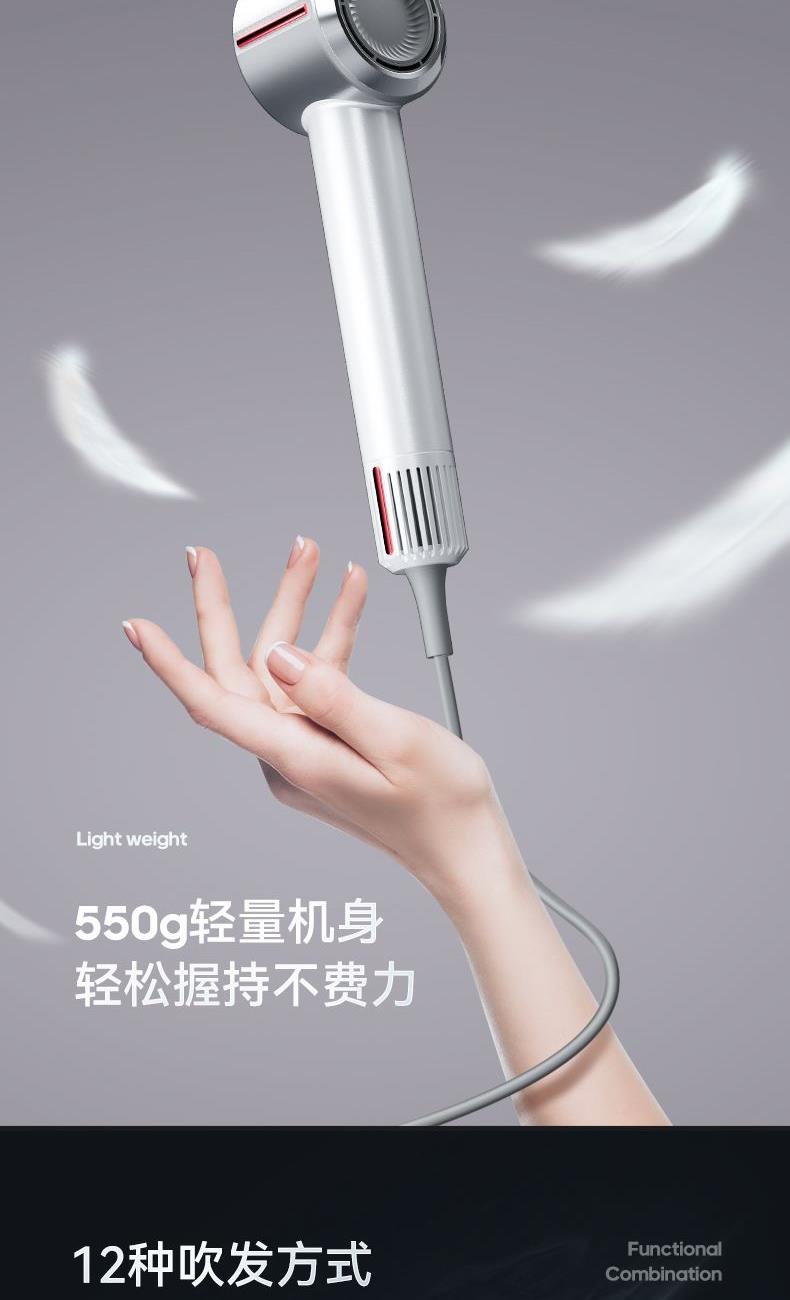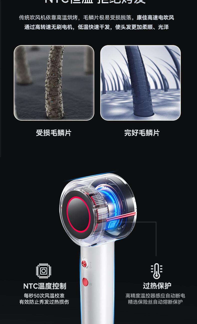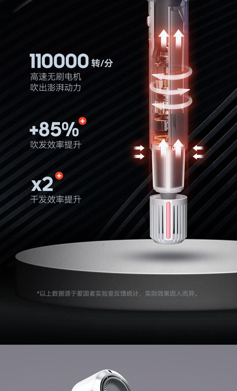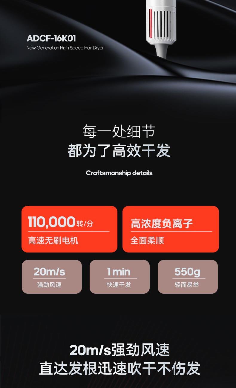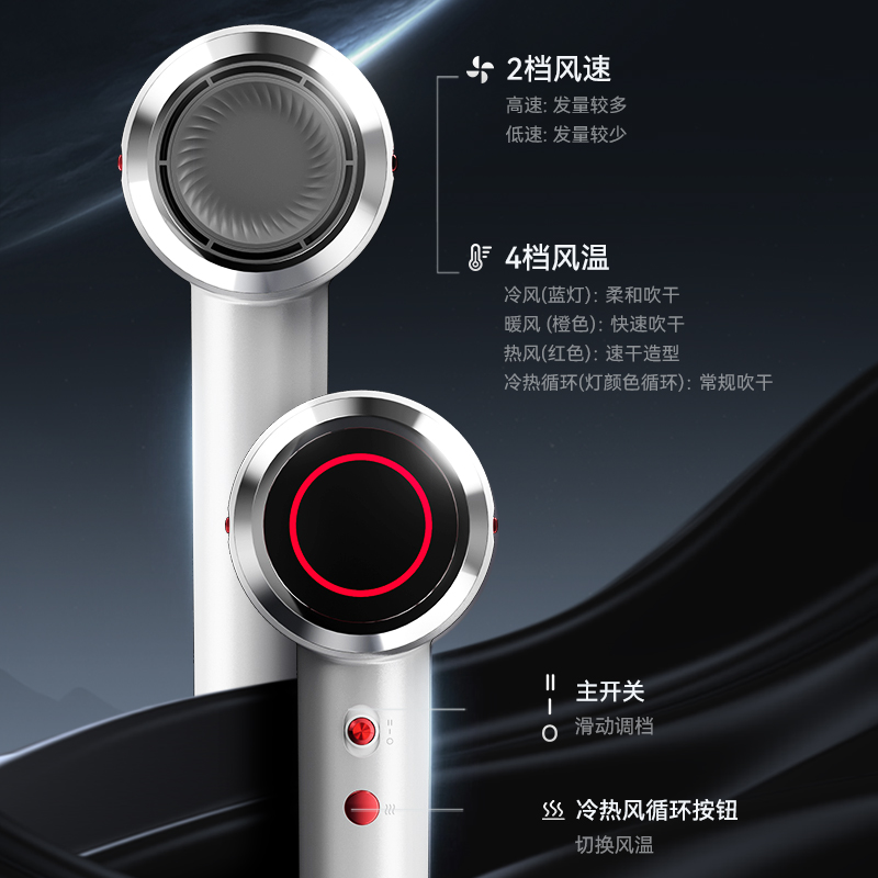 冷热风循环按钮:三色切换风温:蓝色-红色-橙色 360°磁吸风嘴 2重精滤进风网,8重科技降噪 110000转/分无刷电机 6亿负离子,65m/s劲风 8重降噪,体型小巧,1600W大功率 3档风速,3档温度 383g便携机身 功率:1600W 包装尺寸:351*181*79mm 包装方式:彩邮外 毛重:0.54Kg