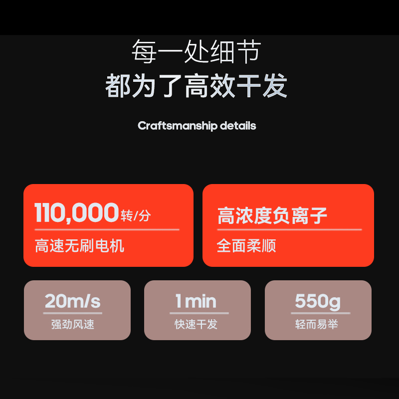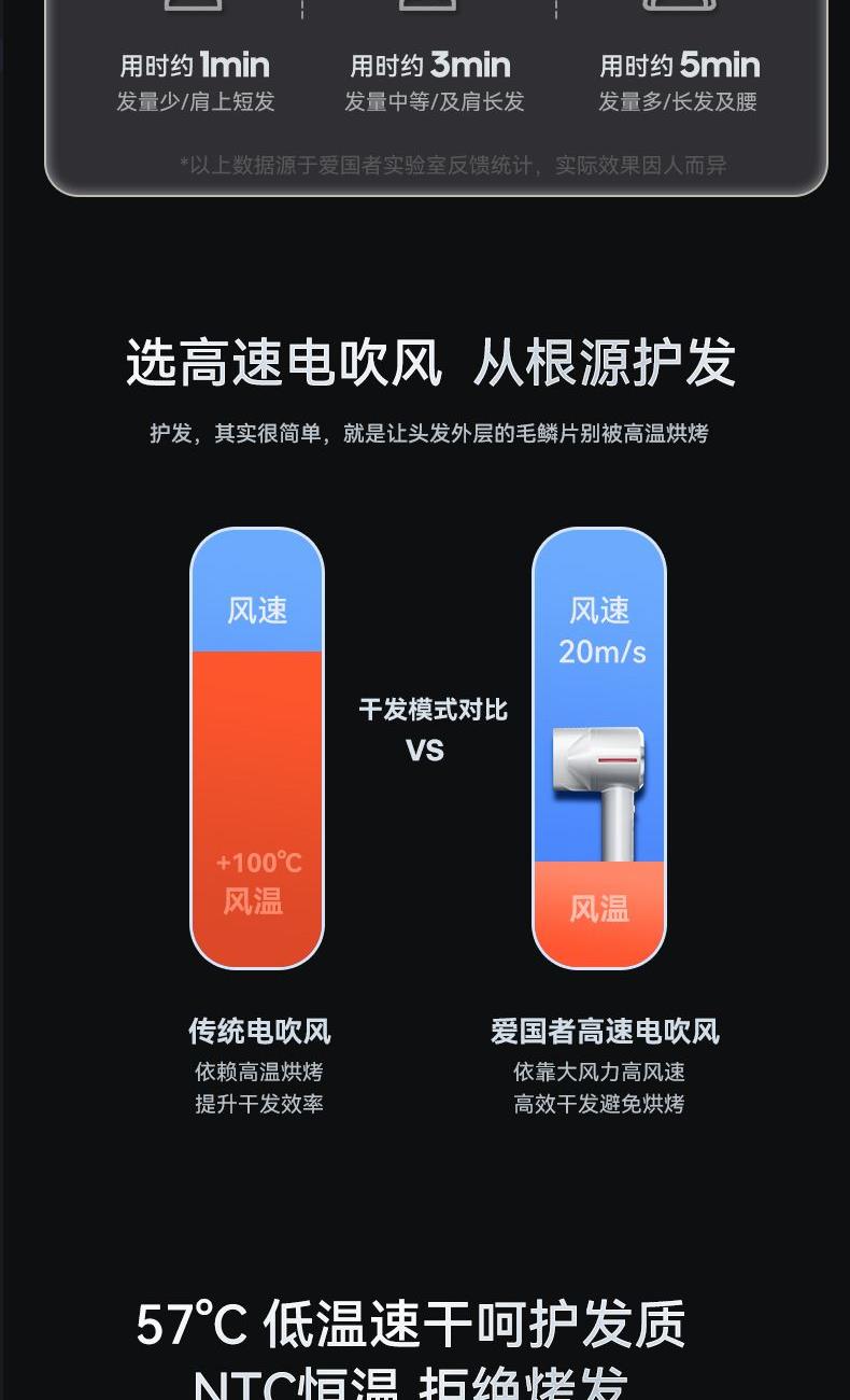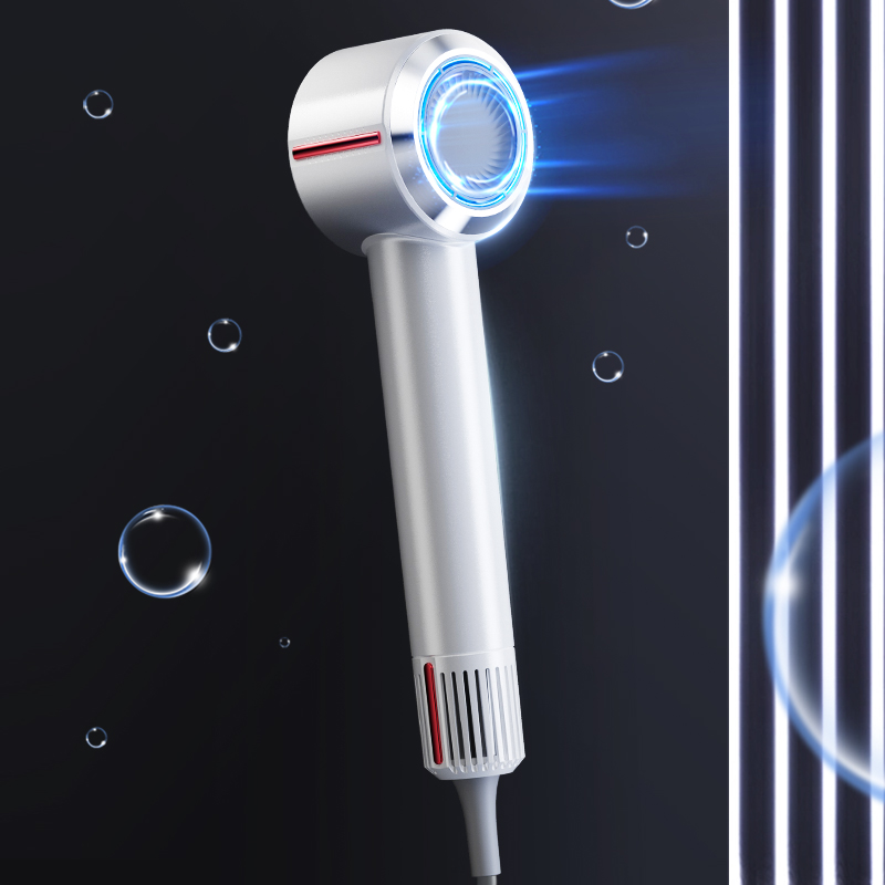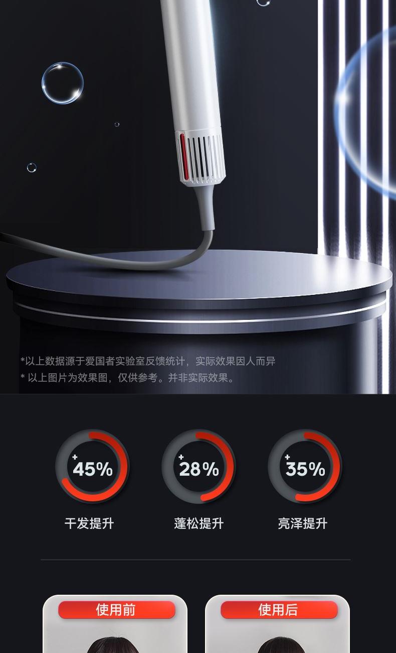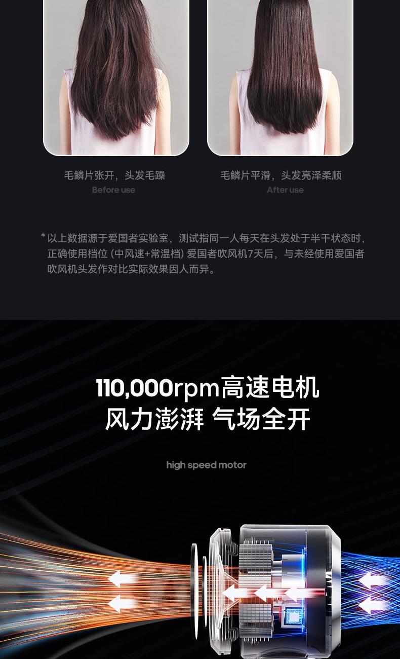 冷热风循环按钮:三色切换风温:蓝色-红色-橙色 360°磁吸风嘴 2重精滤进风网,8重科技降噪 110000转/分无刷电机 6亿负离子,65m/s劲风 8重降噪,体型小巧,1600W大功率 3档风速,3档温度 383g便携机身 功率:1600W 包装尺寸:351*181*79mm 包装方式:彩邮外 毛重:0.54Kg