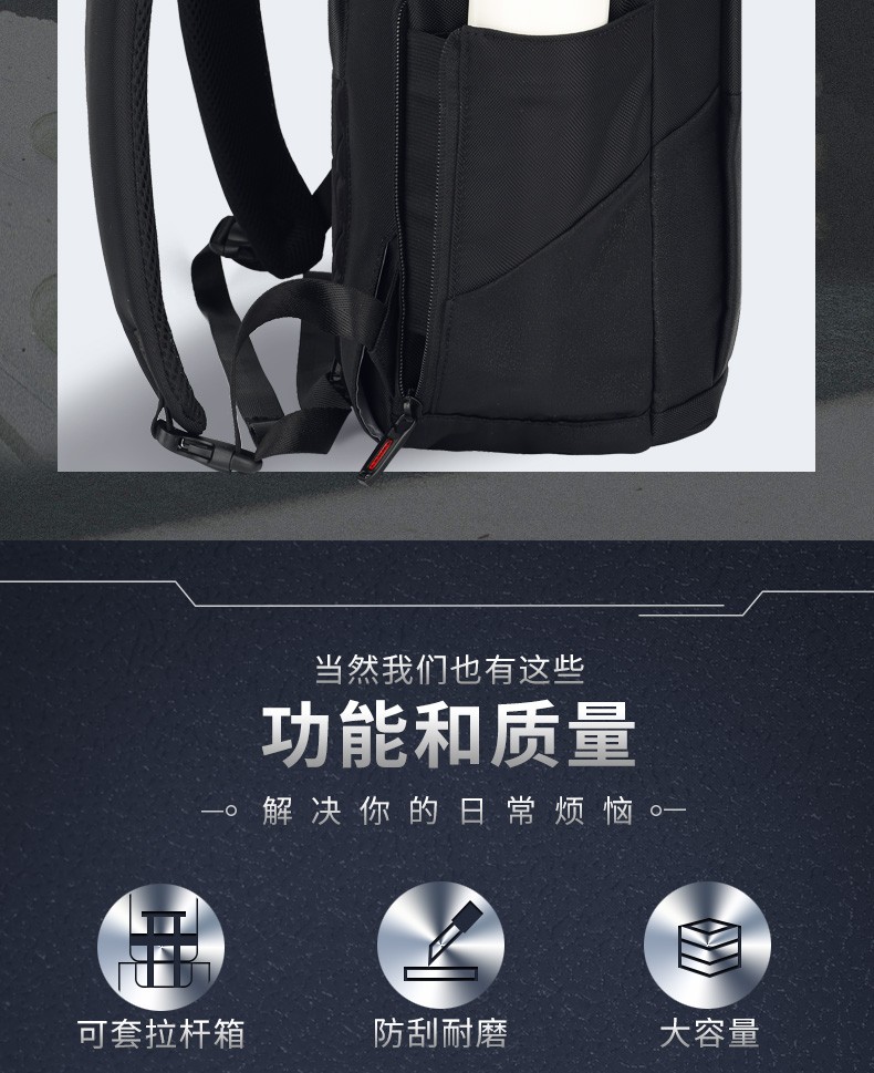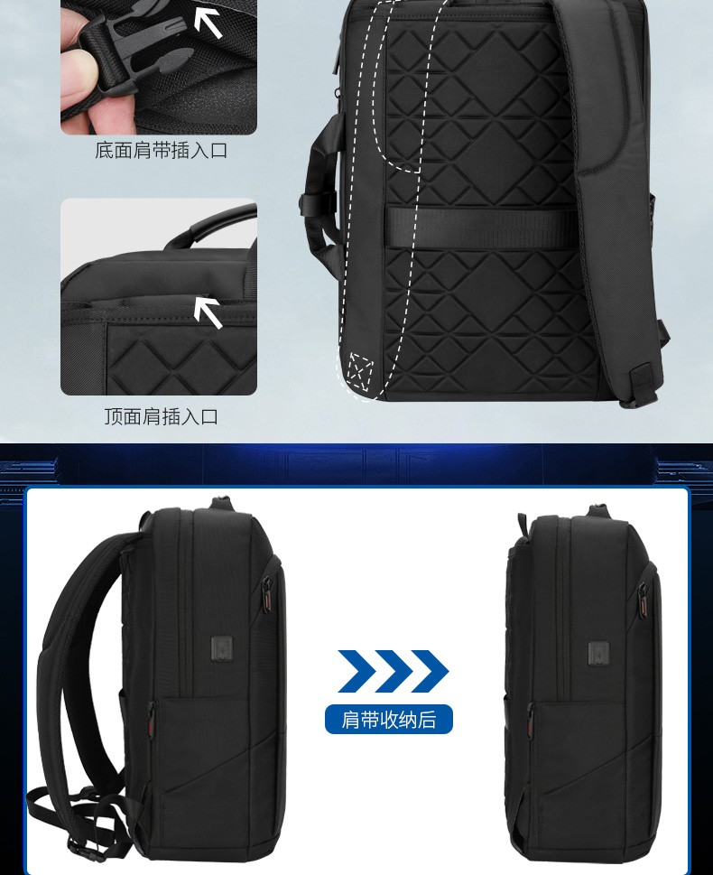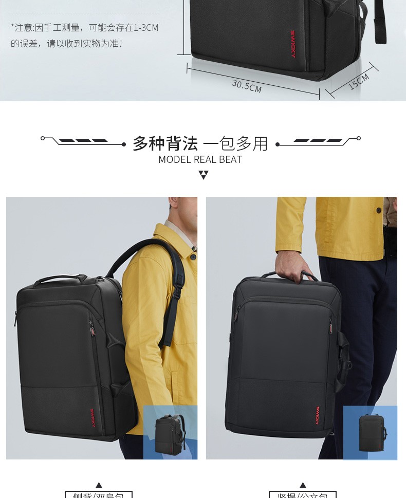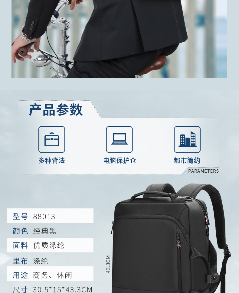 型 号:88013 尺 寸:305*150*433(MM) 材 质:织物 颜 色:黑色 重 量:0.866kg 2.高密度尼龙面料,防波水,防刮耐磨,防尘设计! 3.加厚独立电子仓,电脑/IPAD双收纳; 4.多功能背负设计,可侧背/双肩包,竖提/公文包,横提/手提包,斜挎/单肩包,适合多种生活,工作场景. 5.弹力背板、透气、缓压、减震 6.加宽加厚透气肩带,扩大受力面积,减轻压力. 7.容量:A4课本、手机、平板、服装、15.6英寸电脑结构: 8.三层架构:独立电脑仓+大容量主仓+便携前袋;