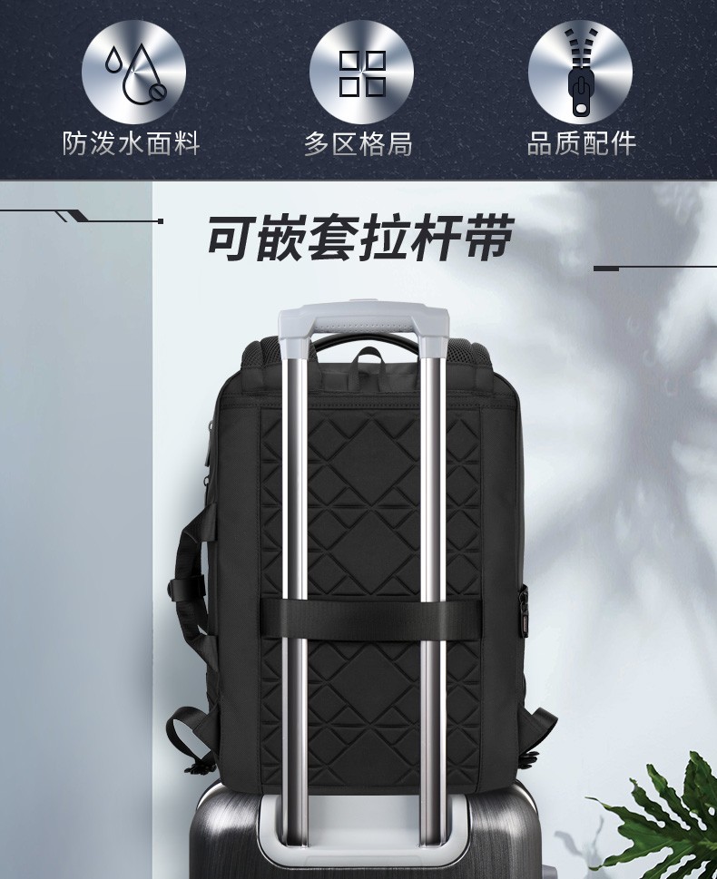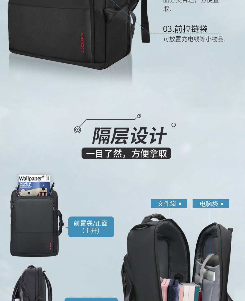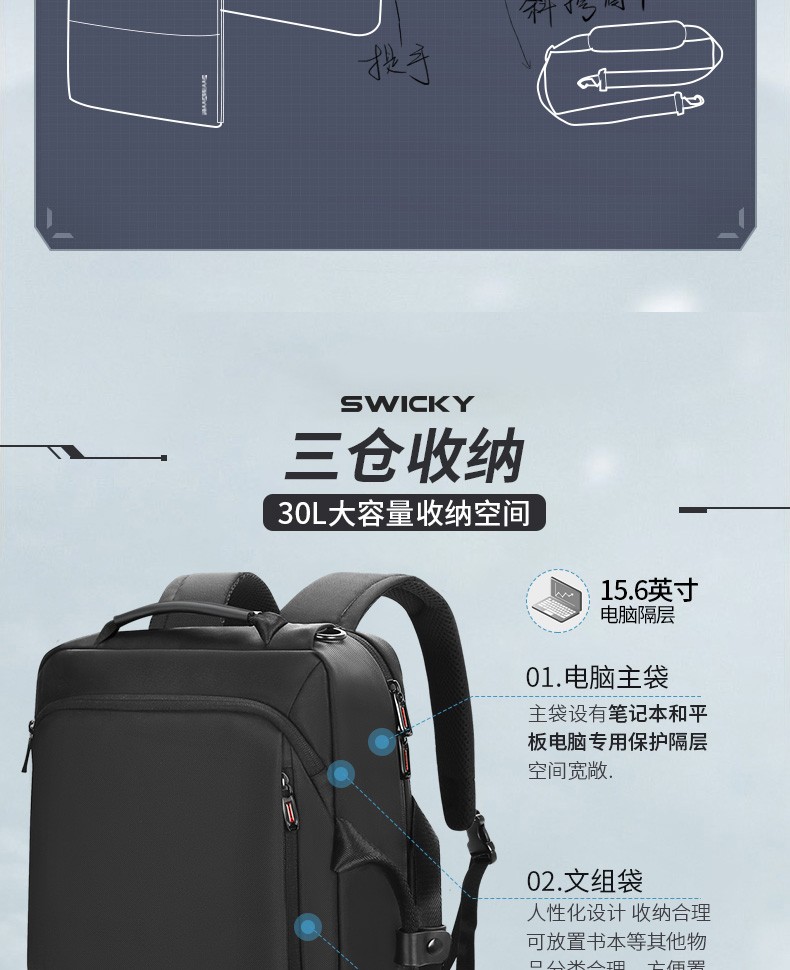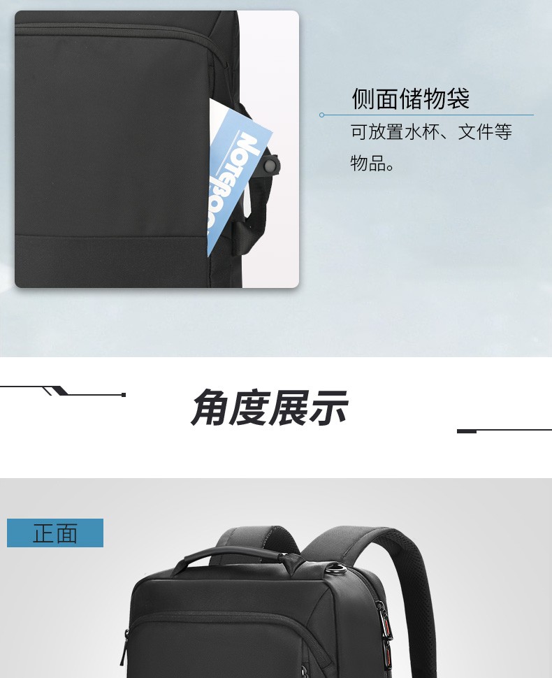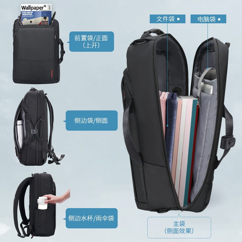 型 号:88013 尺 寸:305*150*433(MM) 材 质:织物 颜 色:黑色 重 量:0.866kg 2.高密度尼龙面料,防波水,防刮耐磨,防尘设计! 3.加厚独立电子仓,电脑/IPAD双收纳; 4.多功能背负设计,可侧背/双肩包,竖提/公文包,横提/手提包,斜挎/单肩包,适合多种生活,工作场景. 5.弹力背板、透气、缓压、减震 6.加宽加厚透气肩带,扩大受力面积,减轻压力. 7.容量:A4课本、手机、平板、服装、15.6英寸电脑结构: 8.三层架构:独立电脑仓+大容量主仓+便携前袋;