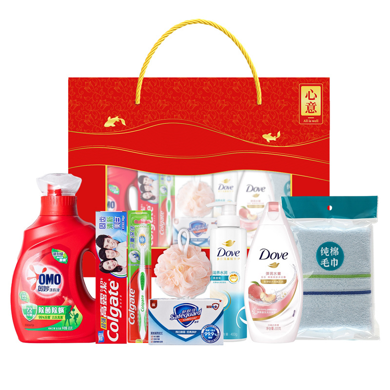 礼盒尺寸:32*8.5*24.5cm 包装尺寸:66*46.5*51CM 产品配置:(香型随机) 多芬洗发水-400ml 多芬沐浴露-300ml 奥妙洗衣液-950g 高露洁牙膏-90g 高露洁牙刷 舒肤佳香皂-100g 沐浴球 纯棉毛巾-73*33cm 精美礼盒