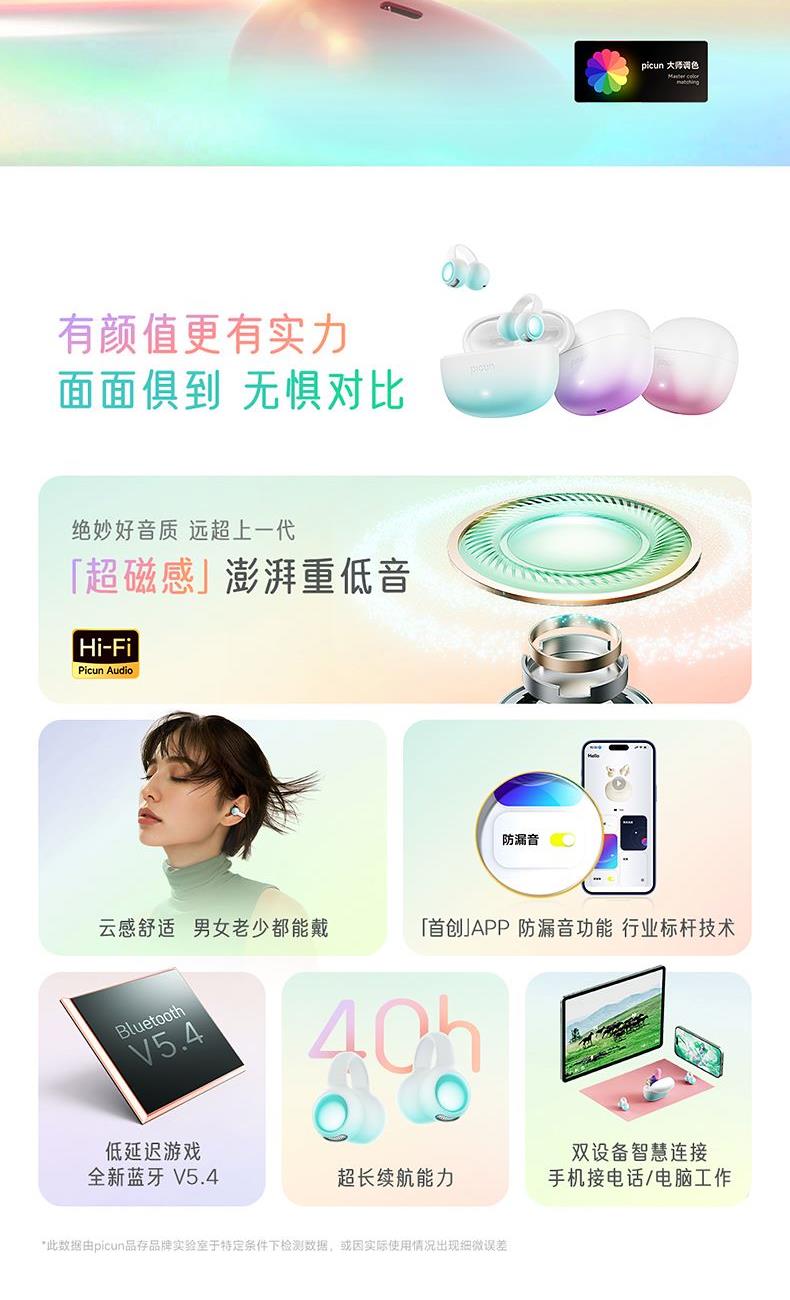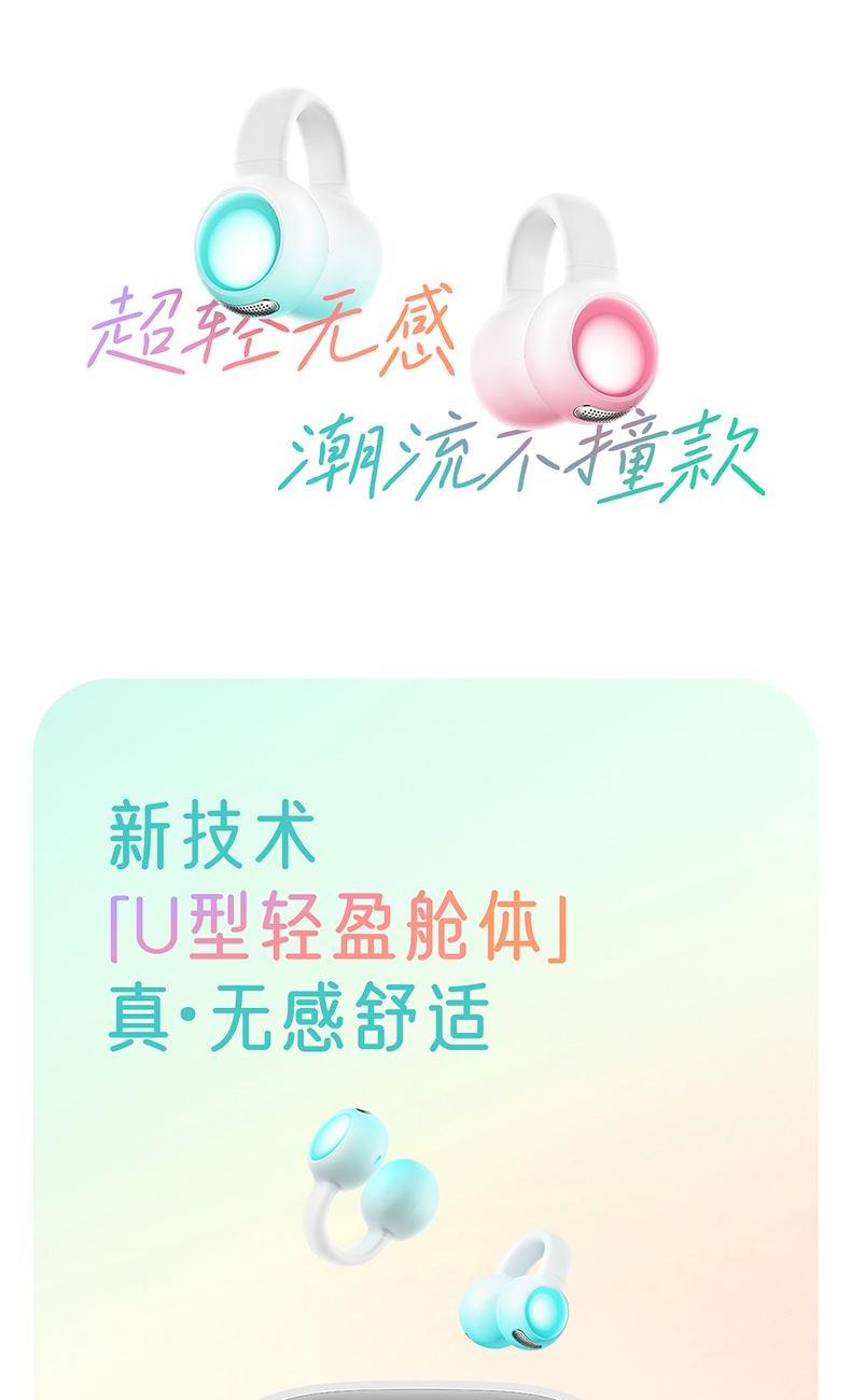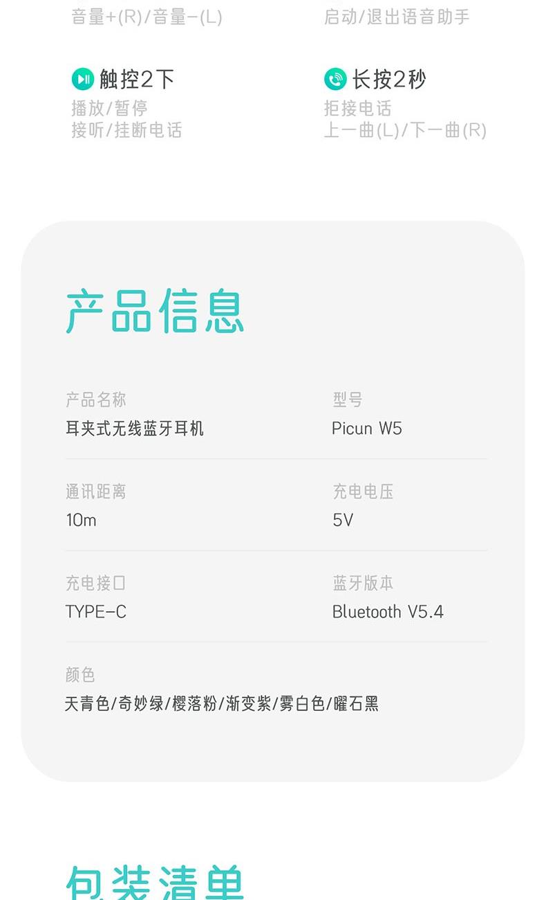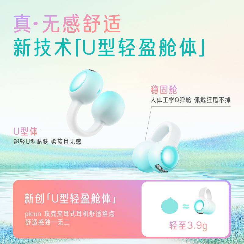 蓝牙方案 : JL6973 蓝牙版本 : V6.0 接受距离 : 10m 频响范围 : 20HZ- 20KHZ 电池容量: 28mA /250mA 使用时间(70%音量:≈4h 喇叭尺寸 : 13mm 喇叭灵敏度: 100±3db 1、支持【picun品存】APP智能互联控制 2、轻盈小巧,单只 3.9 克 3、软弹耳夹,久戴也舒适 4、澎湃音质,重低音出色