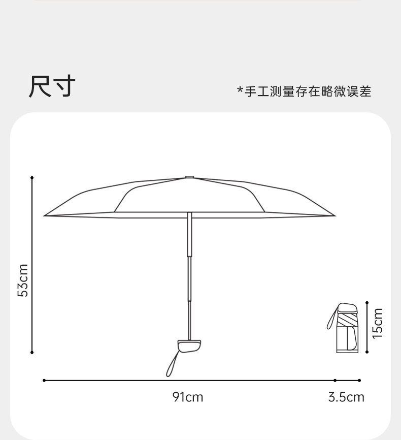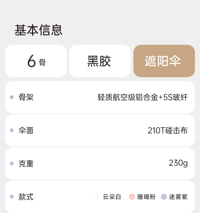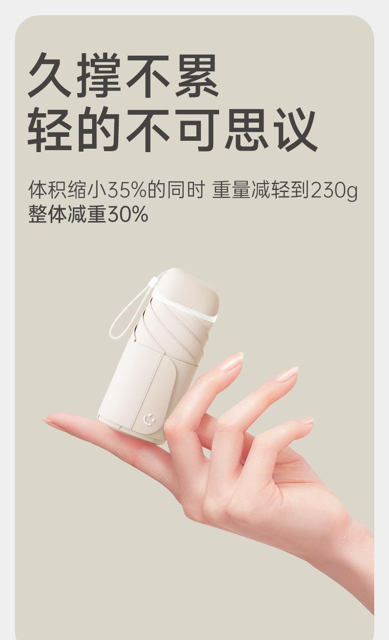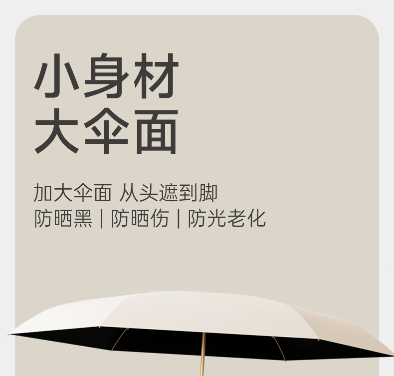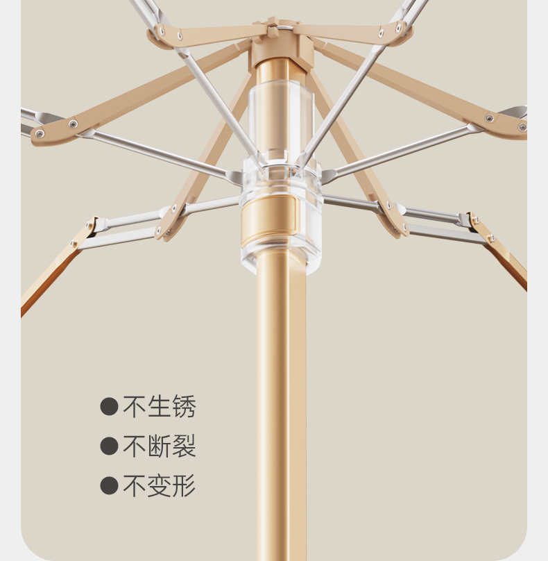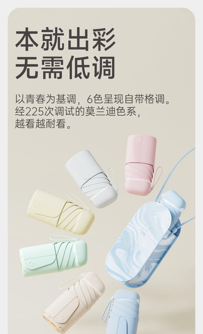 商品货号:ZD208 伞架材质:铝合金,不锈钢,玻纤 伞面材质:210T覆膜全遮光黑胶 款式:手动六折 商品参数:直径:90cm 高度:54cm 收拢宽度径:6.5cm 收拢高度:15cm 商品毛重:0.25 商品颜色: ZD208-降樱粉 ZD208-沁心蓝 ZD208-锦帆黄 ZD208-杜鹃米 ZD208-迷蝶绿 ZD208-奶茶灰