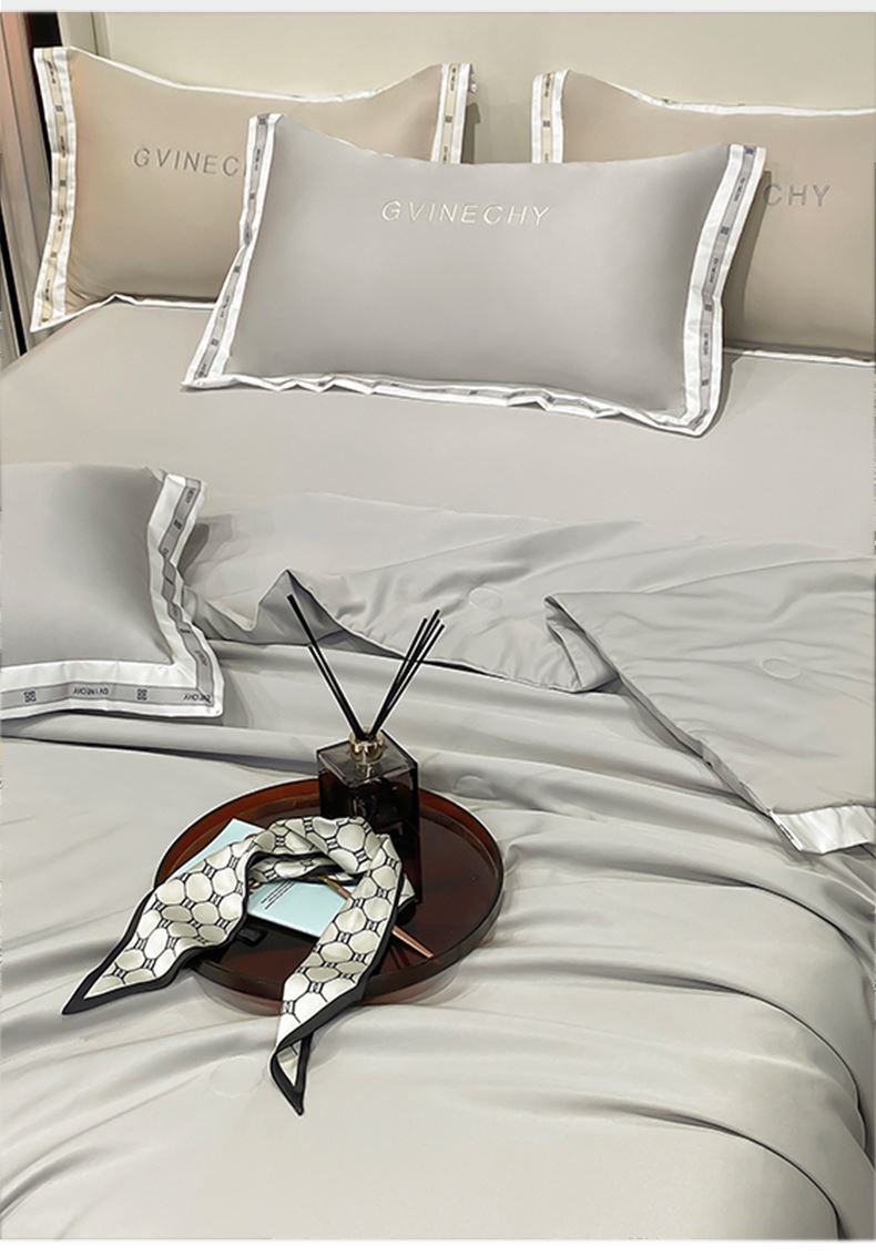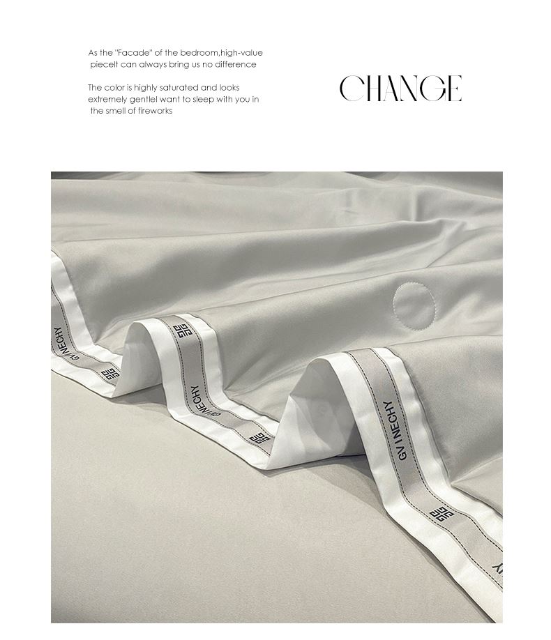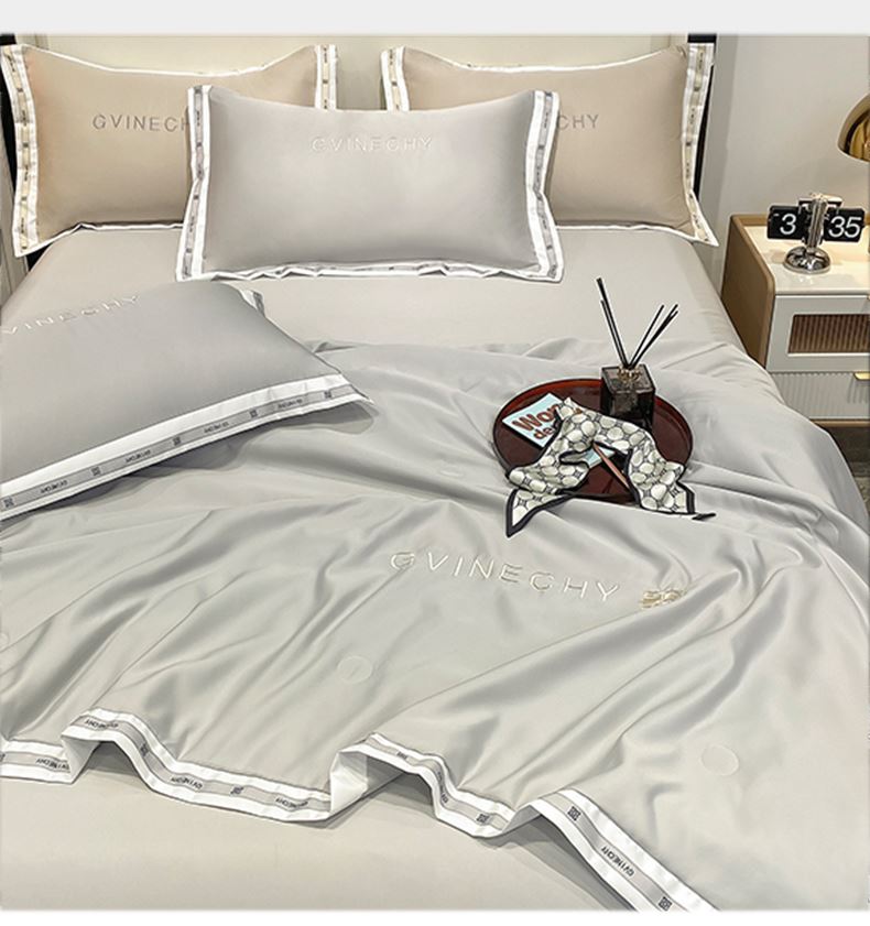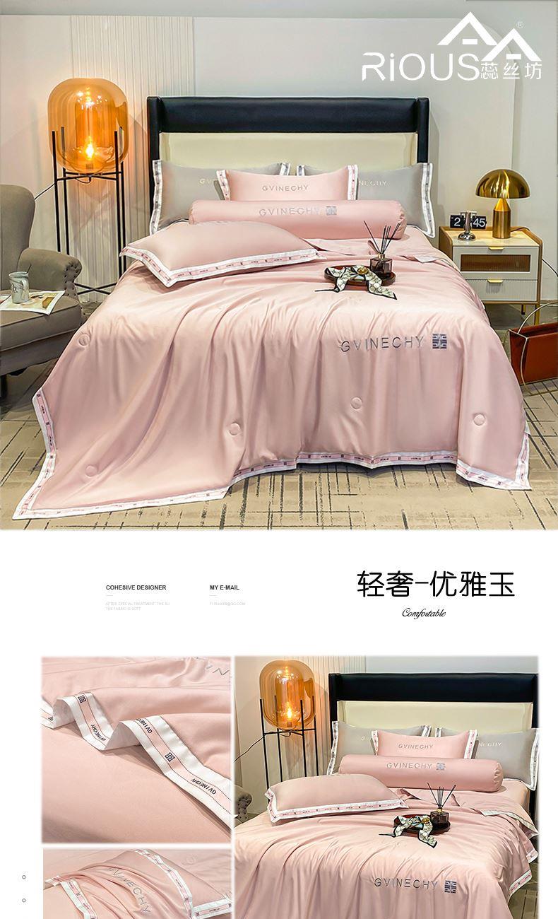 规格:夏被200*230cm 床单245*250cm 枕套48*74cm 面料:冰丝棉/聚酯纤维 花色:极光灰 / 优雅玉 / 香槟金 / 香草绿 / 樱花粉 / 松石绿 选用水洗冰丝面料,手感舒适光泽感强,爽滑舒适,整张羽丝棉填充,不结板蓬松透气,采用定位绗缝,防止跑棉,填充物更加均匀,精美刺绣,搭配宽边印花设计,可水洗机洗,活性印染,色彩靓丽,久用如新。