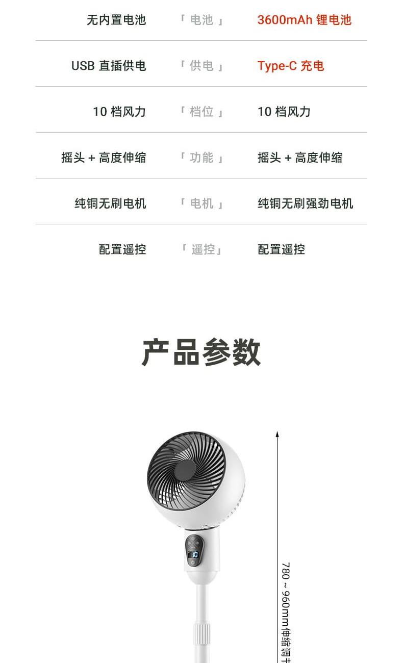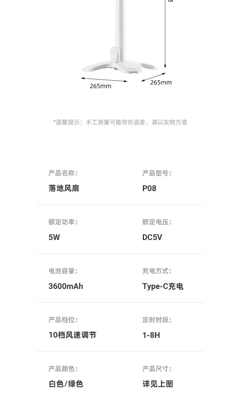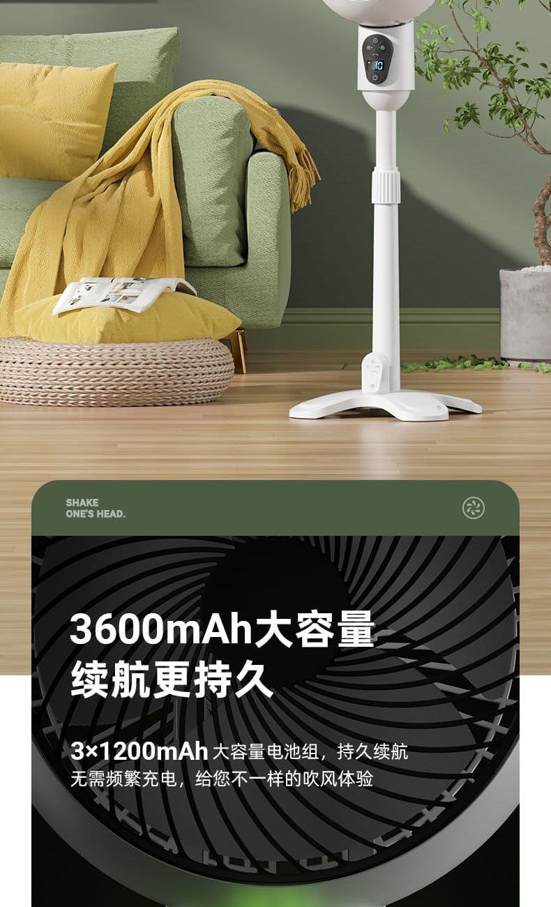 电池容量:3600mAh 产品尺寸:96*26.5*26.5cm 产品尺寸:39.5*26*24cm 外箱尺寸:55.5*41*52.5cm/4pcs 产品重量:2200g 整箱重量:10kg 产品颜色:白色、绿色 3600mAh大电池,持久续航 10档风速,左右自动摇头 8小时定时,带小夜灯 带远程遥控 78-96cm伸缩可调