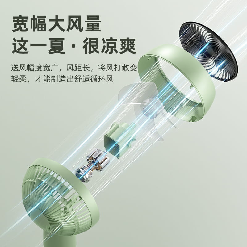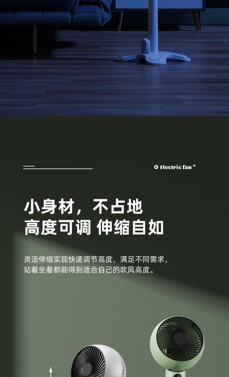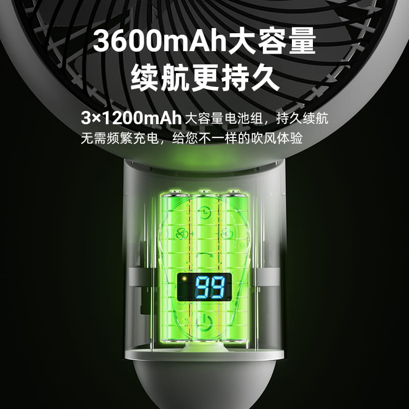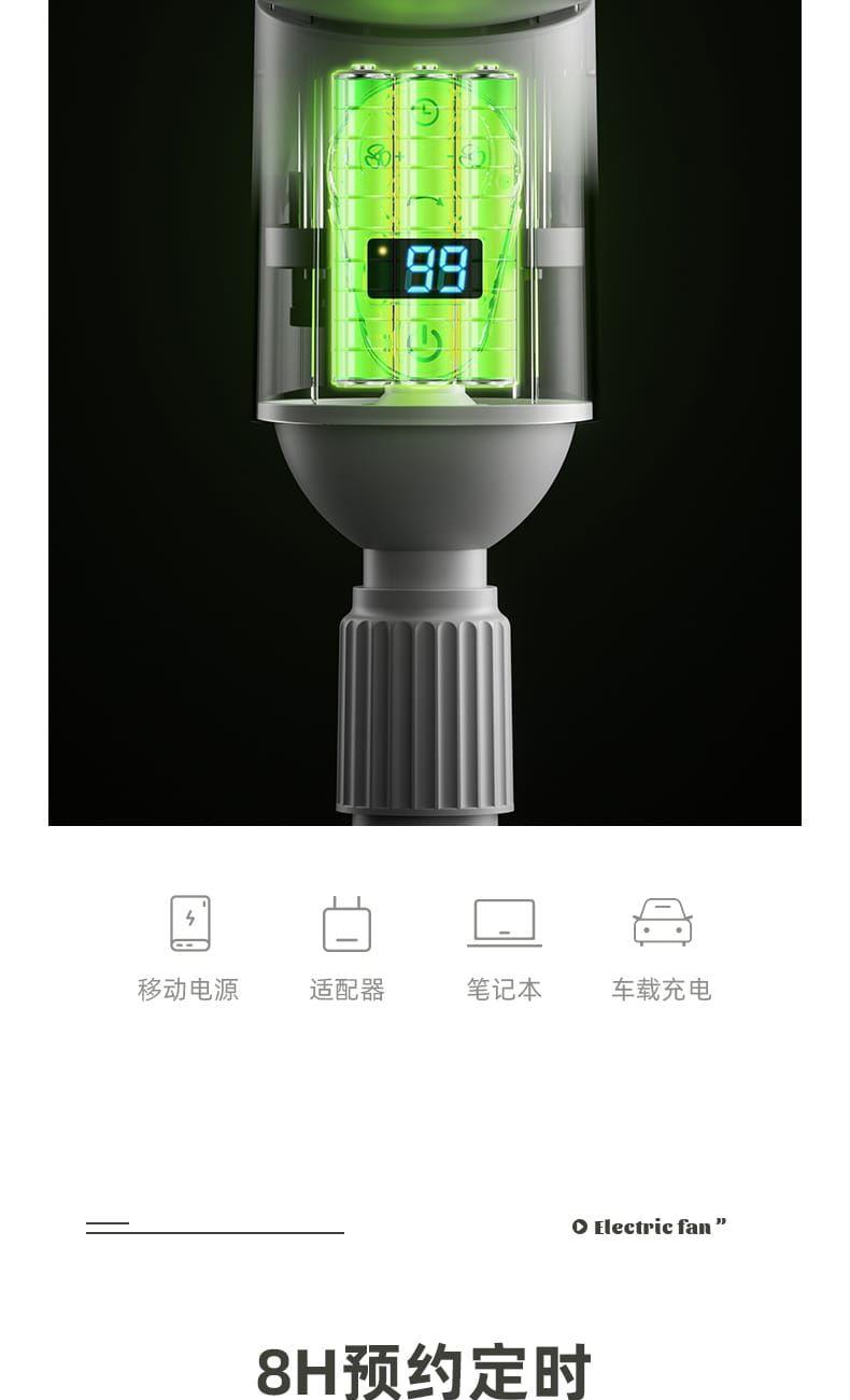 电池容量:3600mAh 产品尺寸:96*26.5*26.5cm 产品尺寸:39.5*26*24cm 外箱尺寸:55.5*41*52.5cm/4pcs 产品重量:2200g 整箱重量:10kg 产品颜色:白色、绿色 3600mAh大电池,持久续航 10档风速,左右自动摇头 8小时定时,带小夜灯 带远程遥控 78-96cm伸缩可调