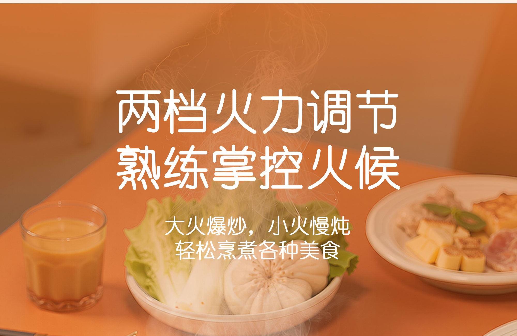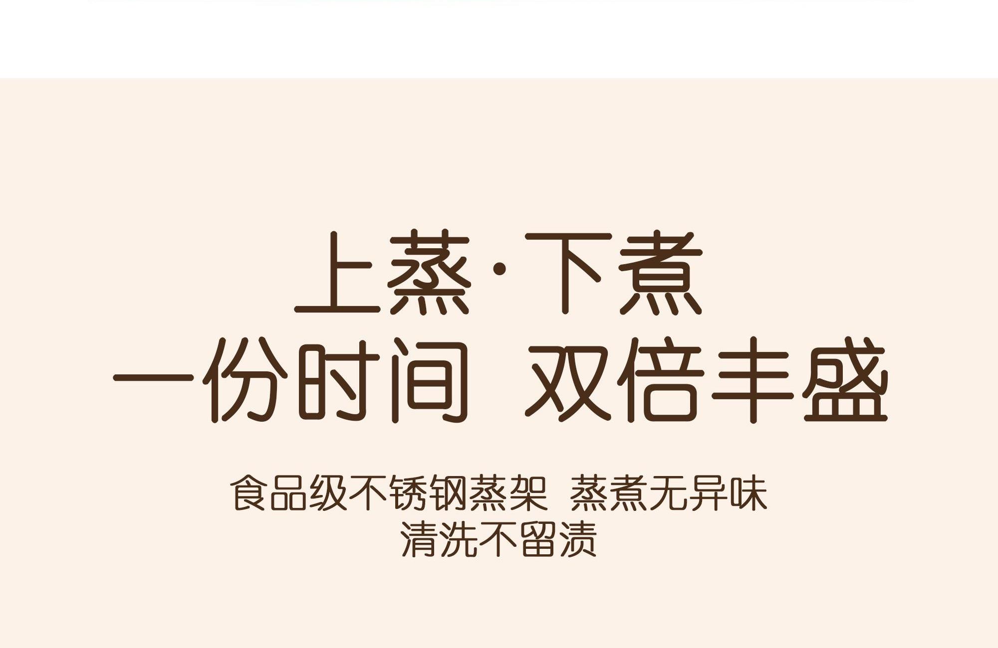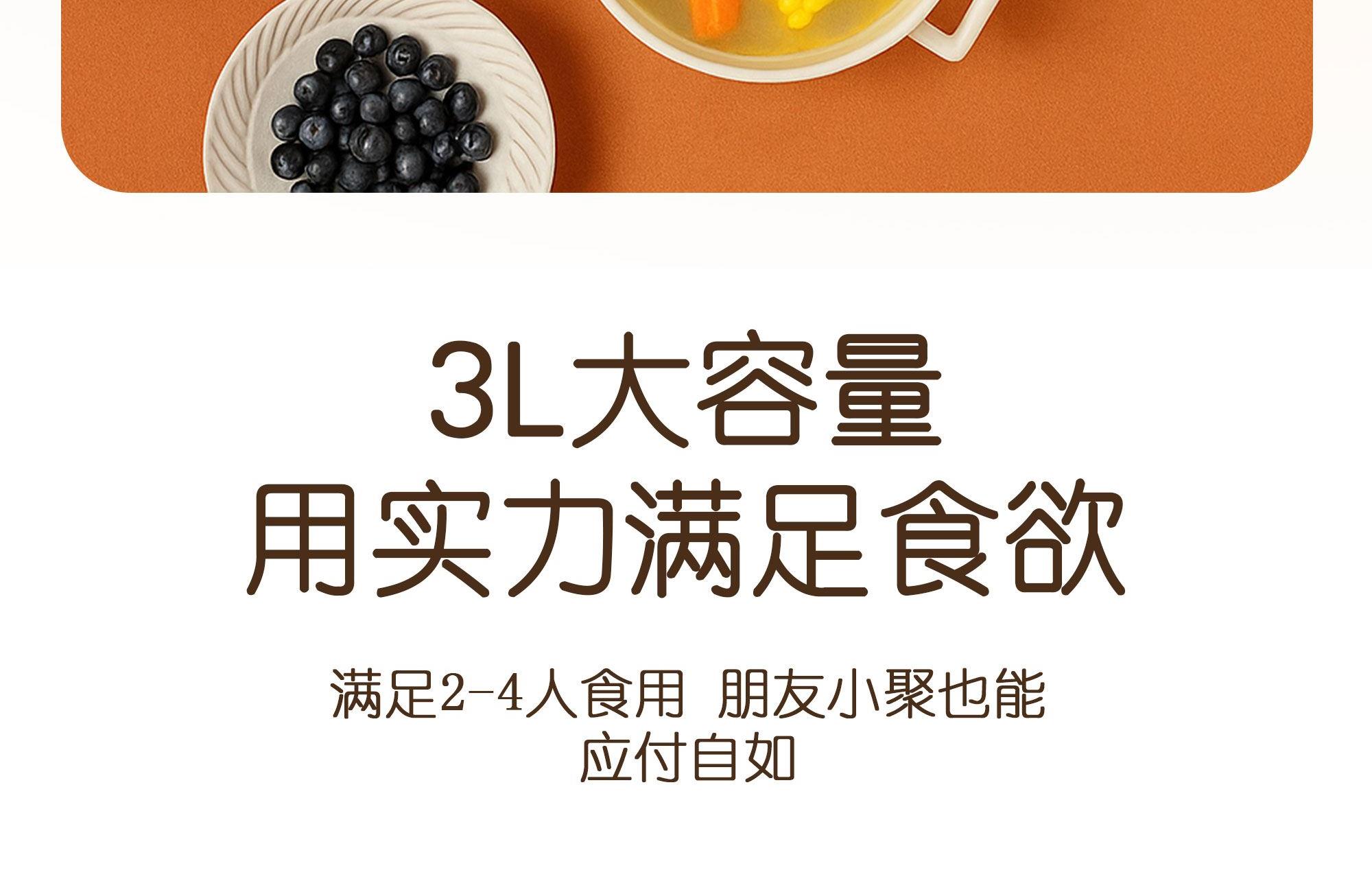 本产品适用于熬、炖、焖、煮、蒸大火力烹饪食物 采用食品级不粘锅涂层材质,卫生无毒,易清洗 两档火力调节,操作简单方便 1000W发热,快速均匀加热 耐高温不锈钢蒸笼,蒸煮耐用无异味 分体式设计,餐后清洗更便捷" 功率:1000W 容量:3L 包装尺寸:305*305*292mm 包装方式:彩邮 毛重:2.1kg