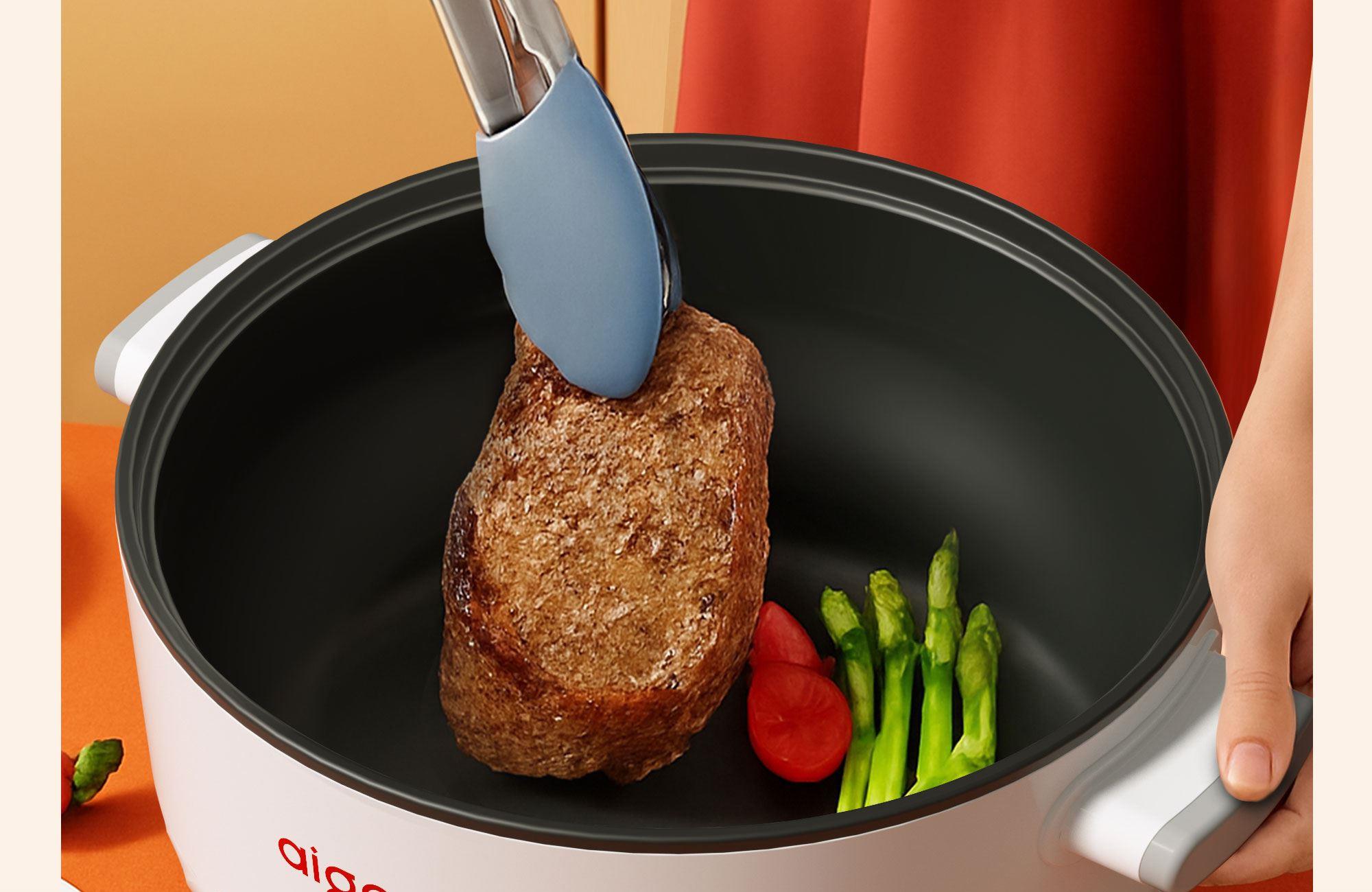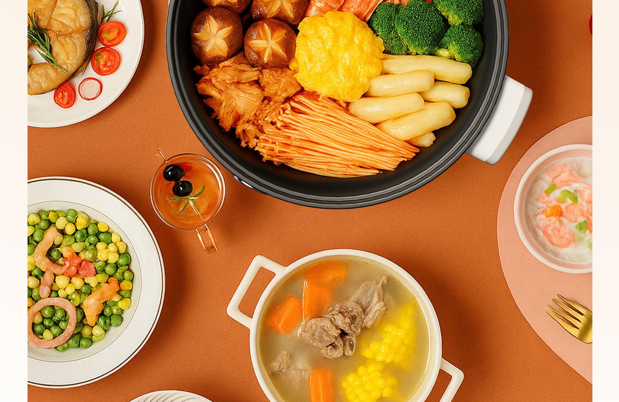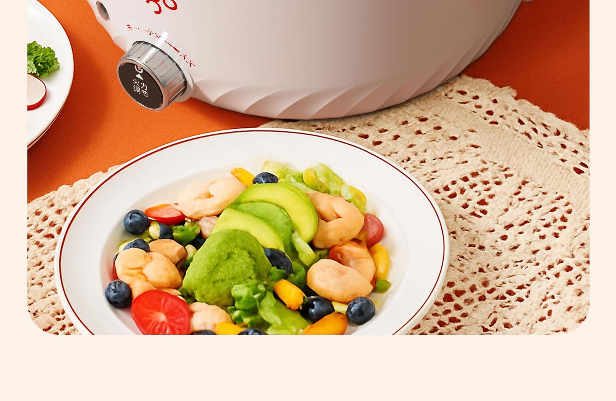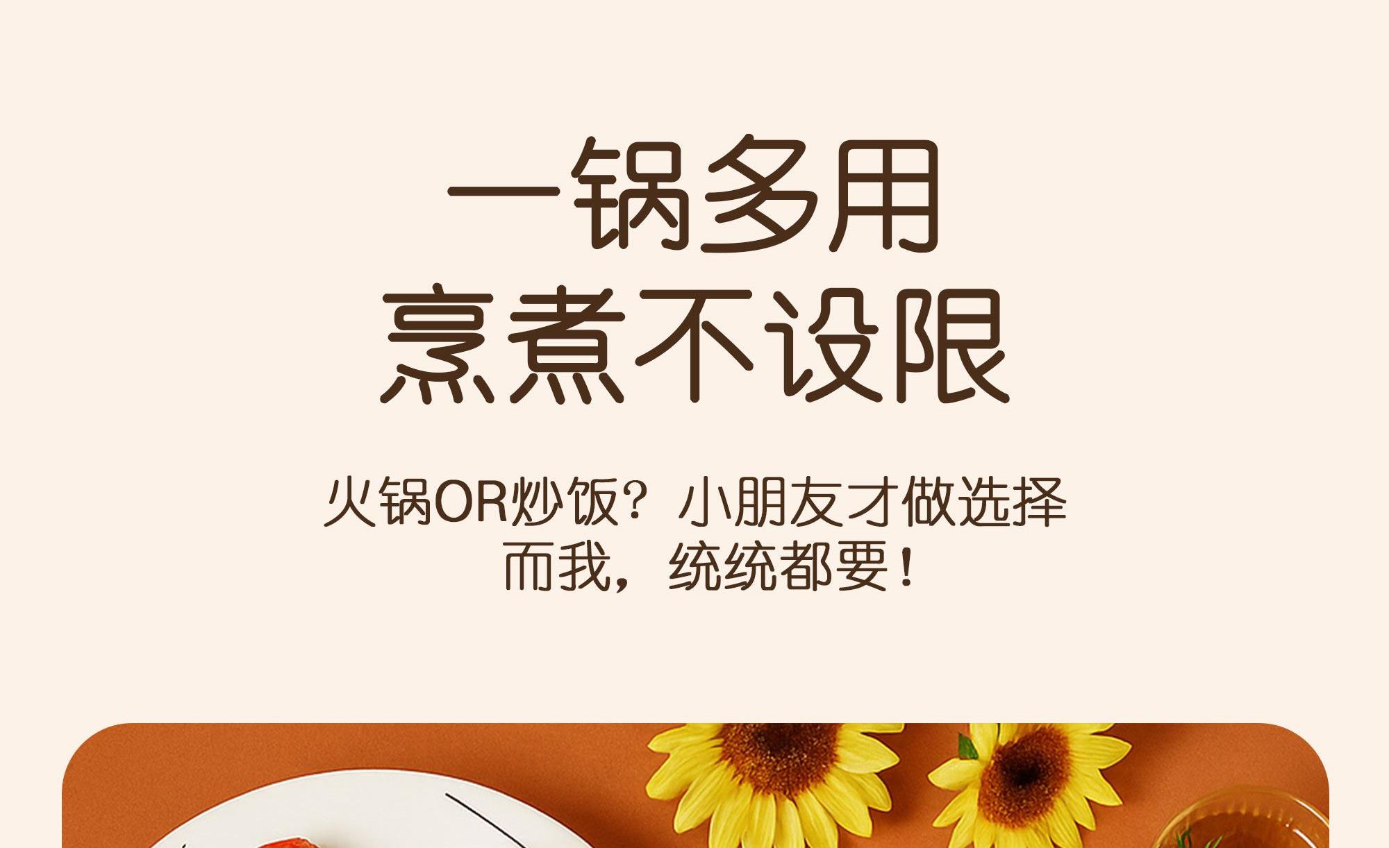 本产品适用于熬、炖、焖、煮、蒸大火力烹饪食物 采用食品级不粘锅涂层材质,卫生无毒,易清洗 两档火力调节,操作简单方便 1000W发热,快速均匀加热 耐高温不锈钢蒸笼,蒸煮耐用无异味 分体式设计,餐后清洗更便捷" 功率:1000W 容量:3L 包装尺寸:305*305*292mm 包装方式:彩邮 毛重:2.1kg