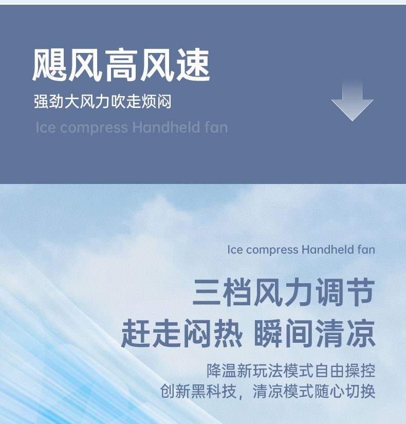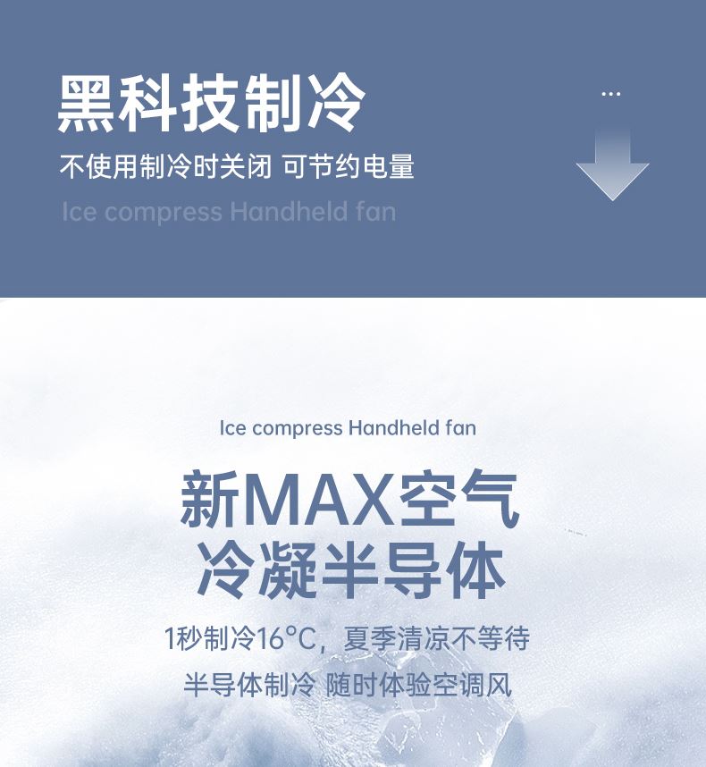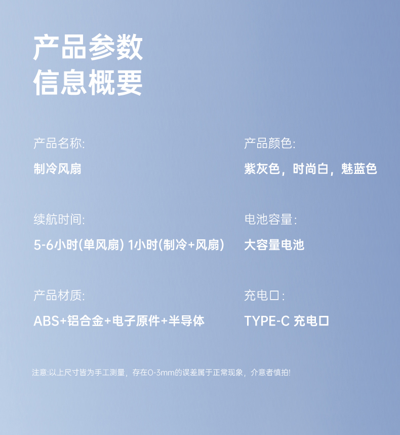 电池容量:1500mAh 产品尺寸:6*6*15.5cm 产品尺寸:6*6*15.8cm/200g 外箱尺寸:51*33.5*52.5cm/90台/18kg 产品颜色:灰色、白色、蓝色 产品标配:彩盒、主机、说明书、数据线 3档大风力,超导冰瓷制冷,极速降温 带登山扣,可手持、可桌面、可挂吊 1500mAh大电池,长续航