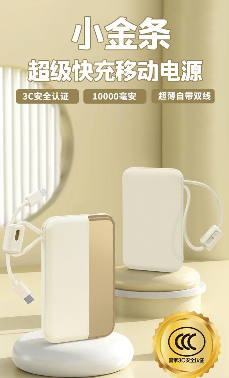 1、小金条一万毫安22.5W超薄快充移动电源 22.5W超级快充超薄机身 双线快充提绳设计,小金条设计 3C符合民航局标准,可随身携带 2、66W铝合金超级快充一拖三伸缩数据线 兼容苹果15系列 五档伸缩调节 1.2米长度设计 铝合金面盖 三种充电接口满足各种手机