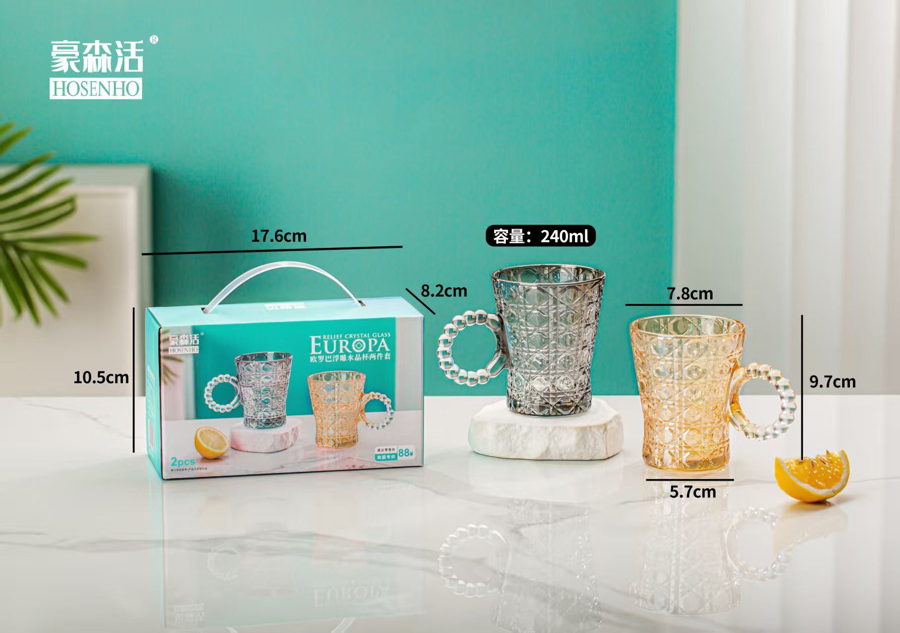 货号:OLB-L2 规格:1*36套 容量:杯:240ml*2 彩盒尺寸:17.2*8.2*10.5cm 外箱尺寸:50.4*27.6*41.6cm 条 码:6976254570559 产品卖点 欧式棱格高透质感,杯身外壁浮雕效果,尽享高贵加厚环保材质,防潮,不变色无异味。细致打磨圆润杯口如珍珠般触感,尽享舒适体验创意珍珠链手柄,拿握更舒适。一杯多用满足各种需求。实用方便,是促销、商务、会议和福利礼品之优选。