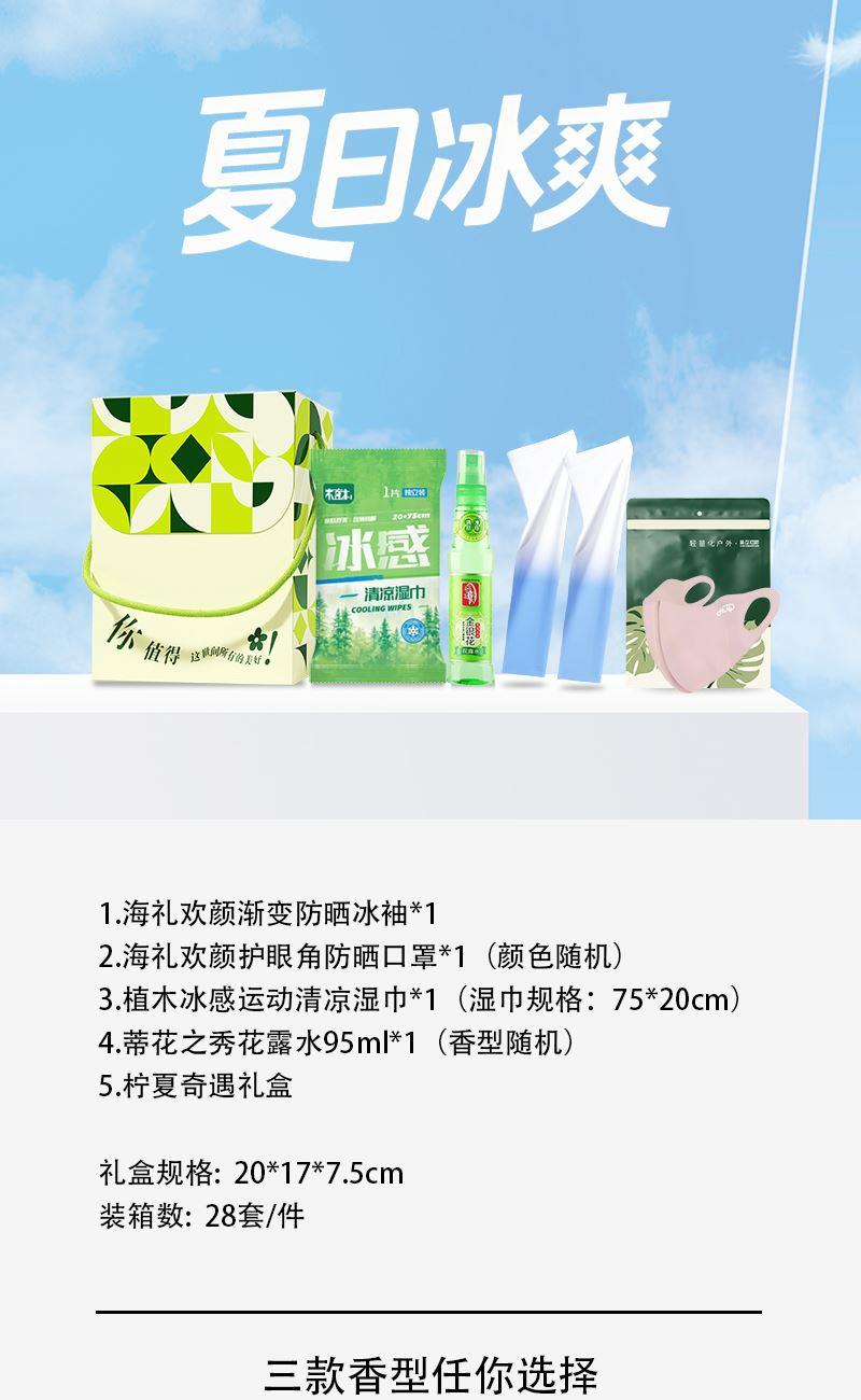 1.海礼欢颜渐变防晒冰袖*1 2.海礼欢颜玻尿酸凉感防晒口罩*1(颜色随机) 3植木冰感运动清凉湿巾*1(湿巾规格:75*20cm) 4.蒂花之秀花露水95ml*1(香型随机) 5.柠夏奇遇礼盒