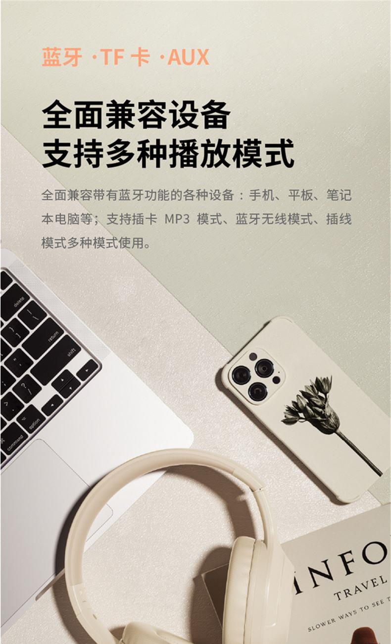 颜色:黑色、卡其白、白灰色 蓝牙方案:JL7006 蓝牙版本:V5.3 蓝牙距离:10m 频响范围:20HZ-20KHZ 电池容量:300mAh 使用时间(70%音量):≈30h 喇叭尺寸:40mm 喇叭灵敏度:98±3DB 充电接口:TYPE-C 1、可拉伸折叠 2、音乐游戏低延迟 3、支持插TF卡 4、支持AUX有线连接