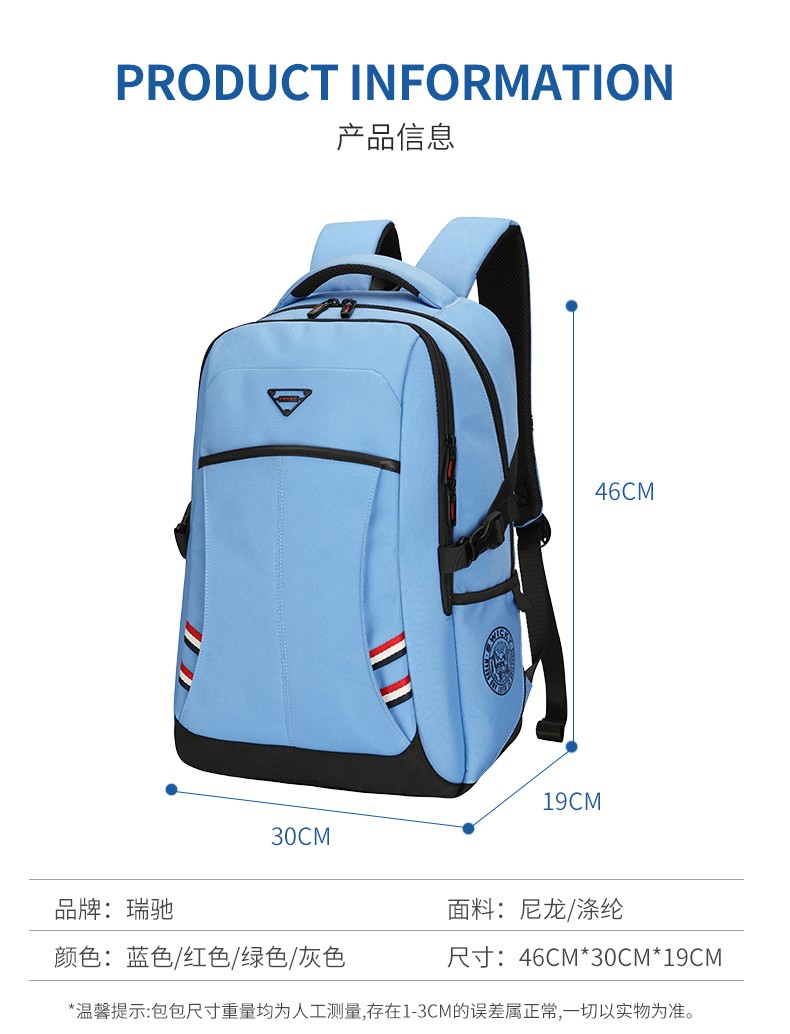 型 号:88115 尺 寸: 46*30*19CM(大号) 颜 色:黑色/蓝色/灰色 重 量:0.5kg 双肩背包:当代的青年人,正站在人生梦想的入口,期待属于新生力量的跨越式未来 愿你披荆斩棘,乘风破浪,到达梦想的彼岸追梦少年,永远在路上
