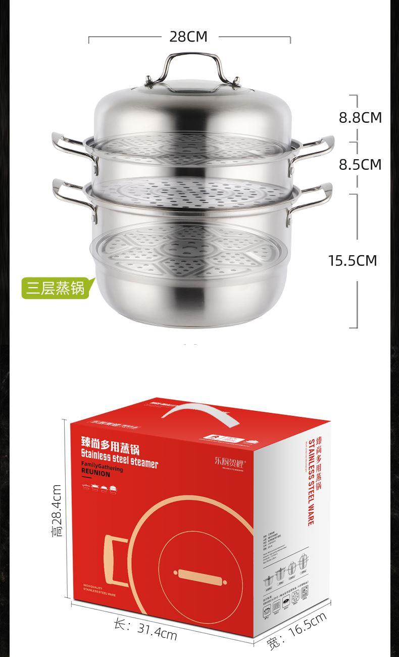产品规格:28cm 产品材质:410不锈钢 包装方式:opp透明袋+手提彩盒 彩盒尺寸:31.5cm*17.0cm*27.0cm 创造高业绩,送礼心坎里,好产品,助您开门红事半功倍。 加深底锅,容量超大,通体砂光拉丝工艺,外观尊贵。 蒸片自由拆卸,满足家族使用可蒸可煮, 搭配玻璃上盖,掌握烹饪进度, 红礼盒包装,时尚大气,是您引流拓客,宣传必备礼品。