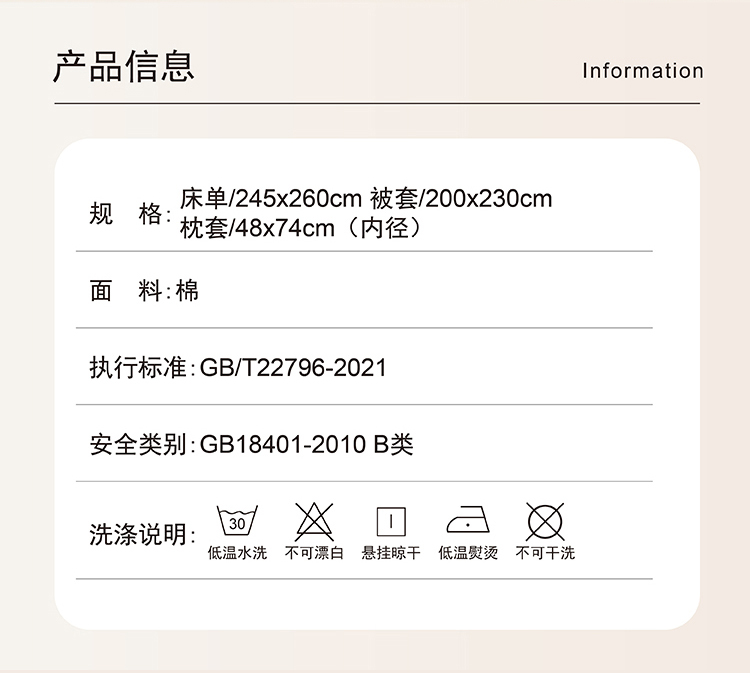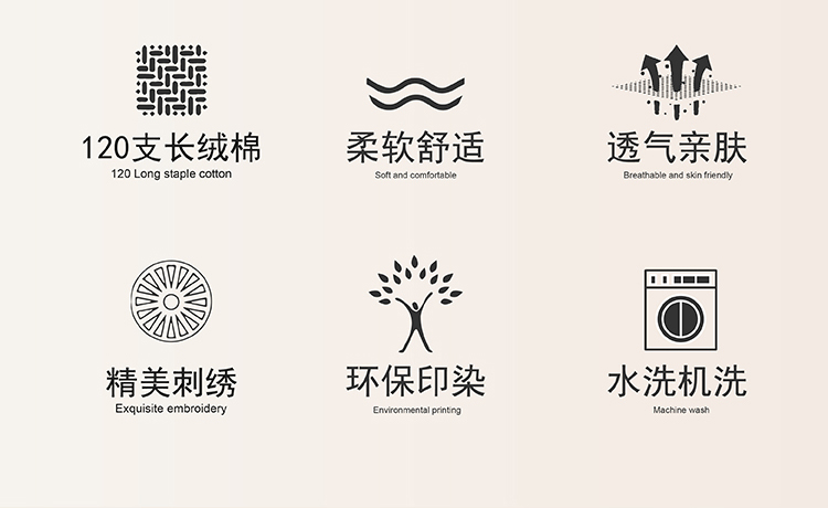 床单:245x260cm 被套:200x230cm 枕套:48x74cm 【面 料】新疆长绒棉 (120支长绒棉) 产品特点: 1. 面料选用120支新疆长绒棉,棉中奢品,高支高密,细腻丝滑,柔软舒适; 2.精致绣花工艺,美观时尚,充满现代轻奢风; 3.活性印染,不添加劣质涂料,不易褪色; 4.床单飞边设计,品质。