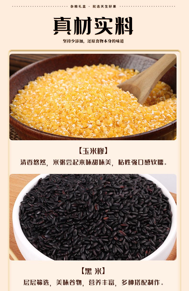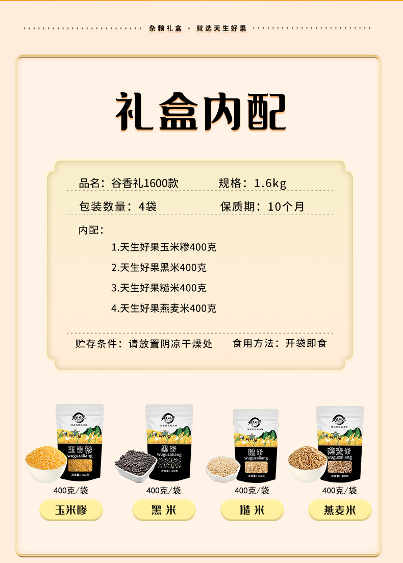 天生好果杂粮组合! 礼盒尺寸:300*115*220mm 天生好果玉米糁400克 天生好果黑米400克 天生好果糙米400克 天生好果燕麦米400克