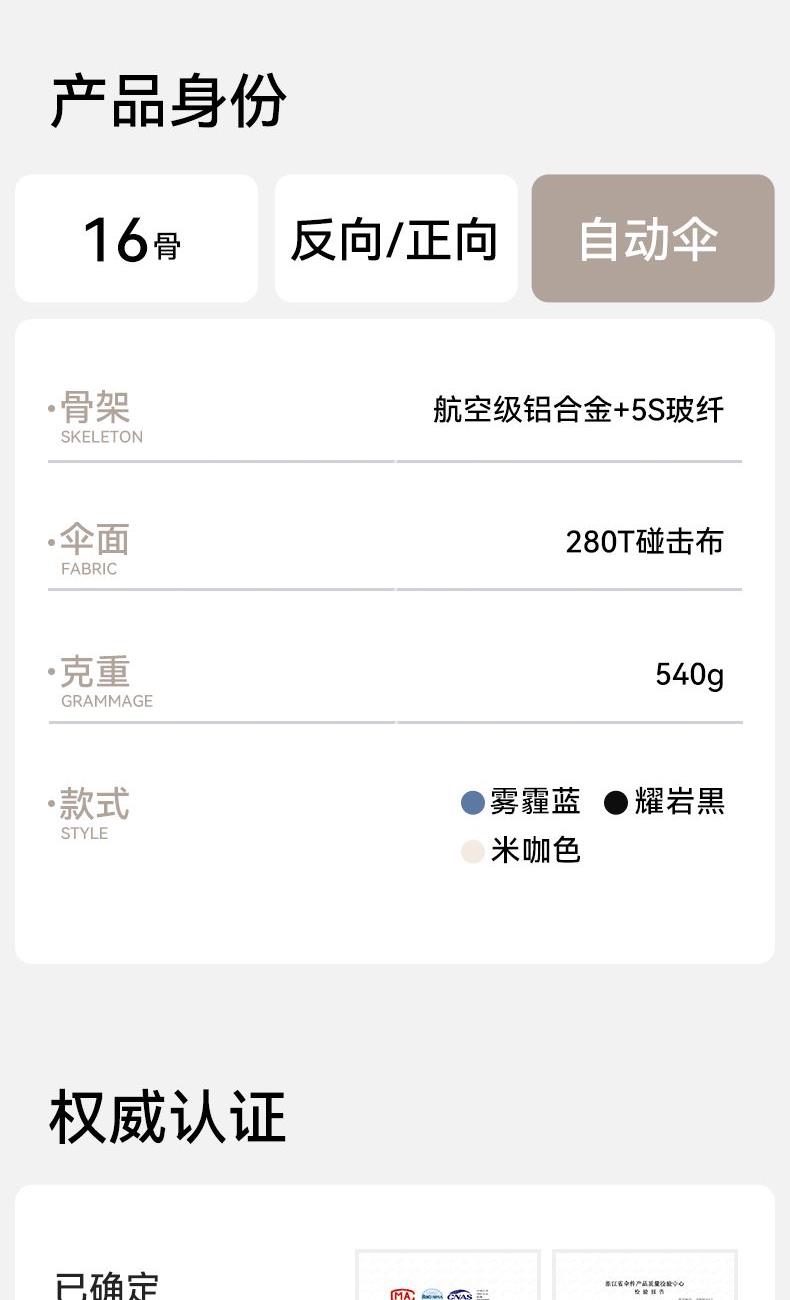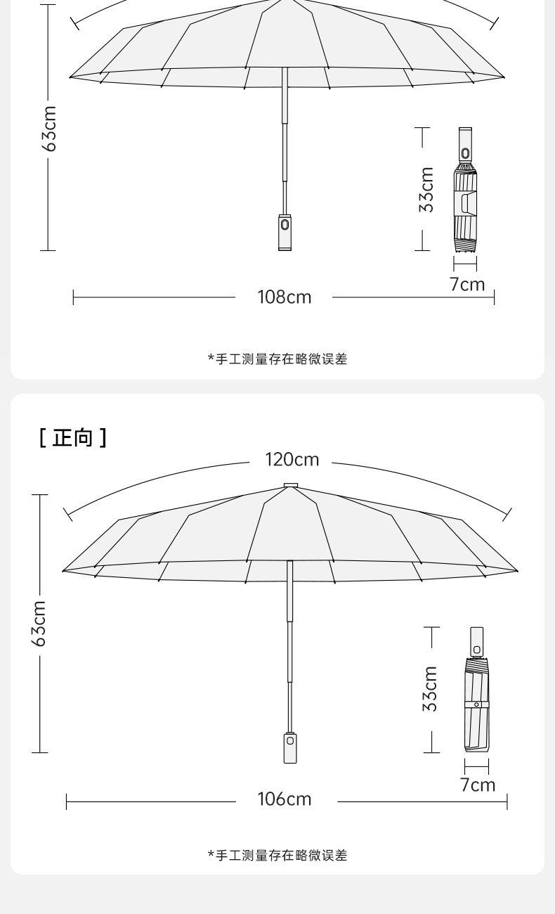 商品货号:ZD2589 伞架材质:不锈钢,玻纤 伞面材质:280T碰击布 款式:自动三折 商品参数:伞下直径:110cm 高度:63cm 收拢直径:6cm 收拢高度:33cm 商品毛重:0.49 商品颜色: ZD2589-Z316F-黑色 ZD2589-Z316F-蓝色 ZD2589-Z316F-米色