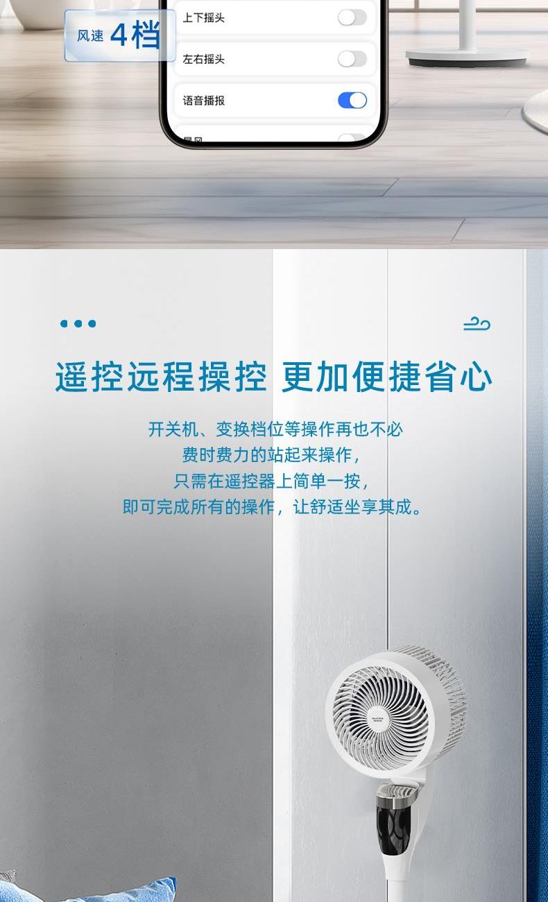 人性化设计:智能语音,8档风速,遥控器带暴风档位。