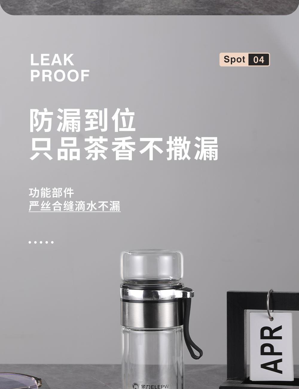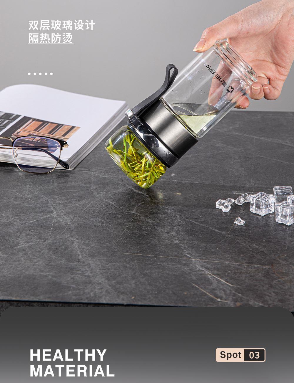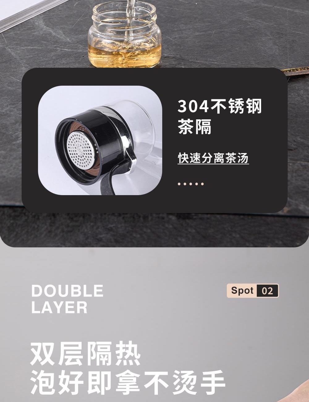 颜色:黑色 本色 材质:304不锈钢滤网,喝茶不吐叶。 不锈钢杯盖,商务外观,更适合定制。 圆润加厚一体成型烧制底,高硼硅茶仓设计,硅胶提绳,出行方便。 包装:单瓦盒