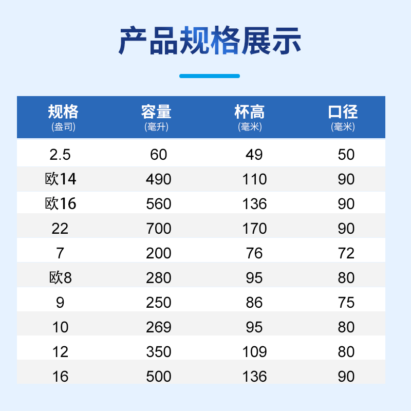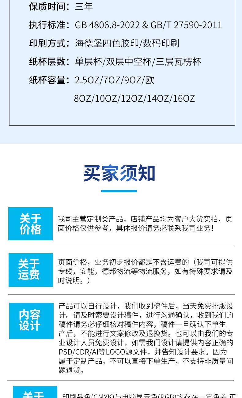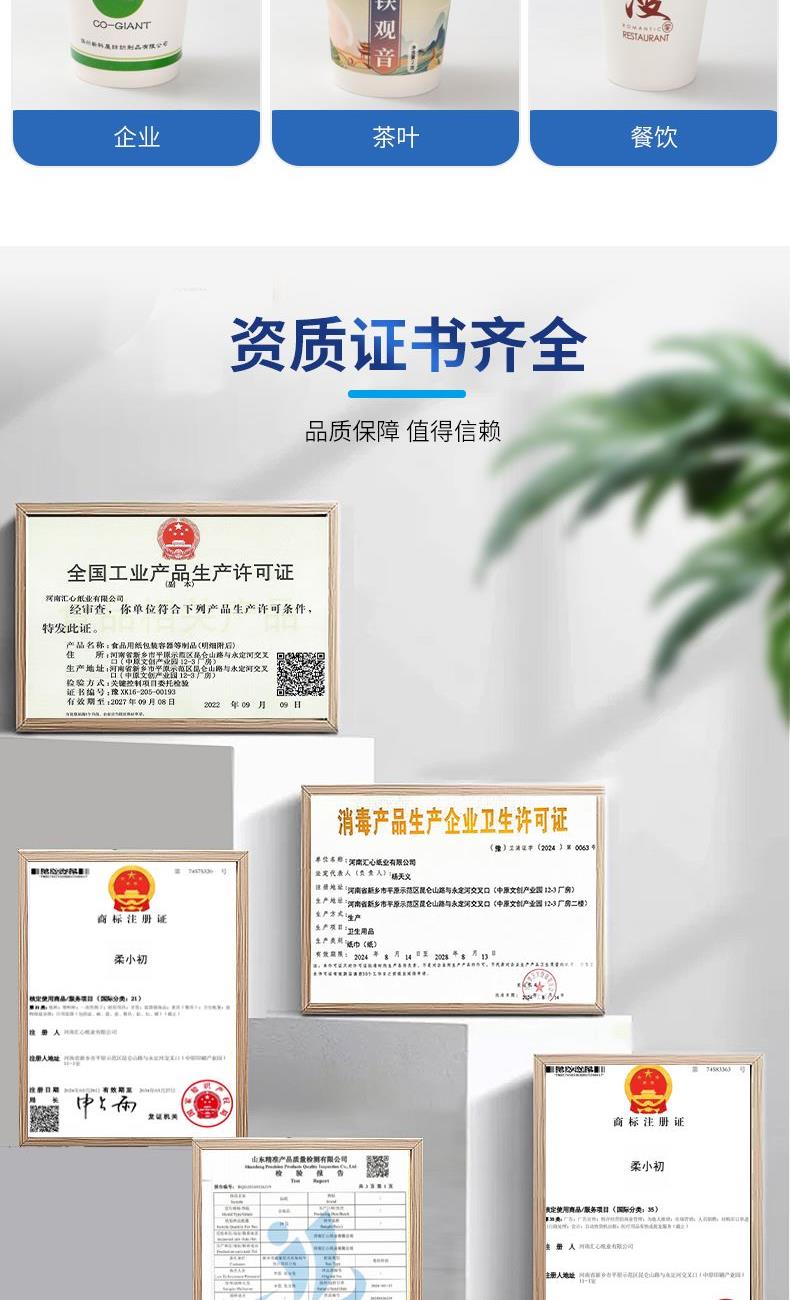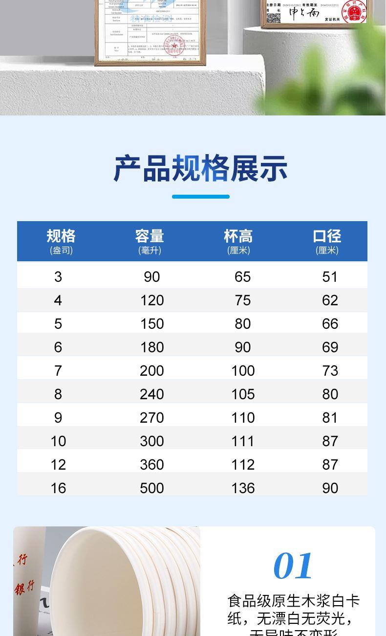 产品尺寸:上口径80mm下口径57mm高度95mm 内纸克重:280g 外箱尺寸:64*50*65cm 主要成分:原生木浆 执行标准:GBT20808 卫生标准:GB15979 卫生许可证:(豫)卫消证字(2024)第0063号 产品等级:合格