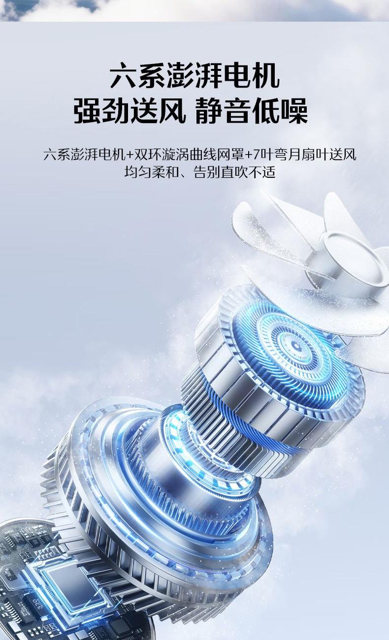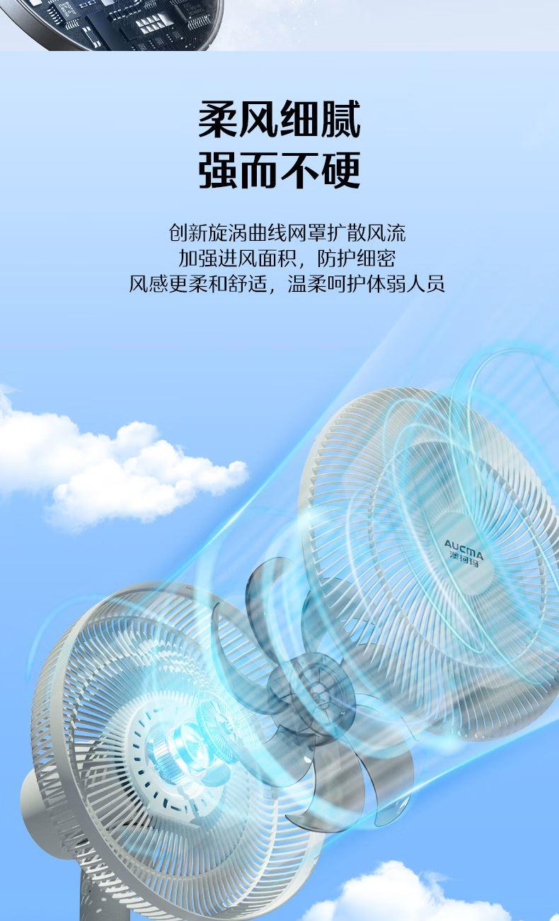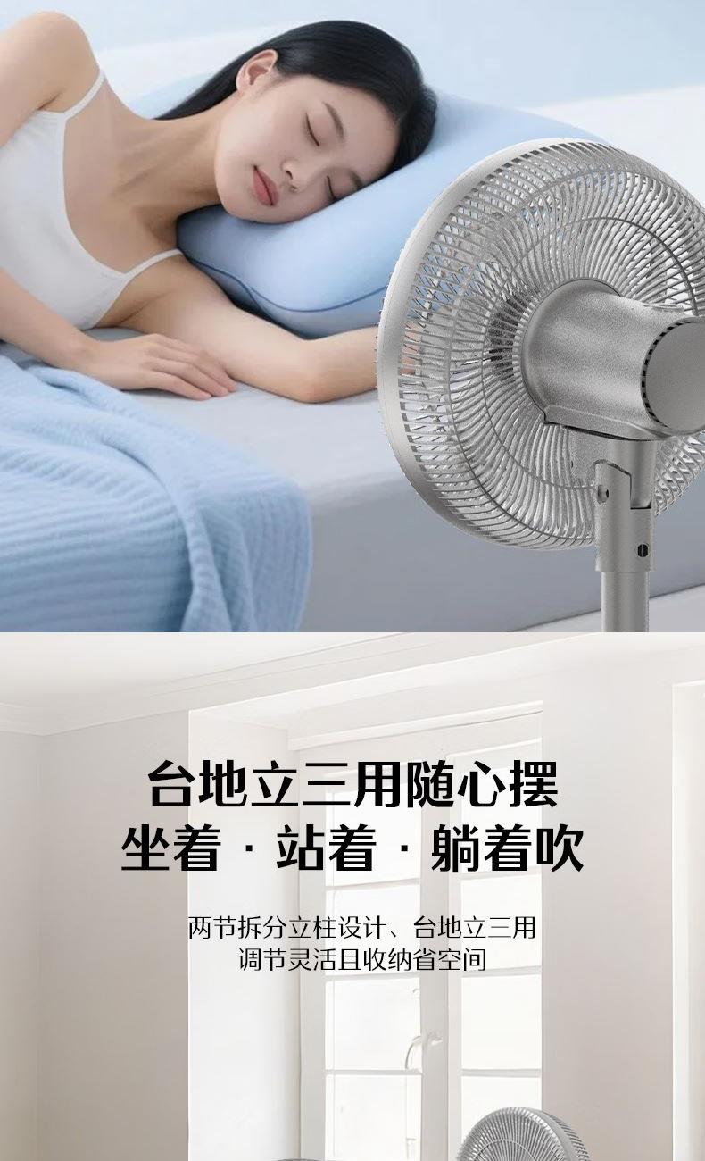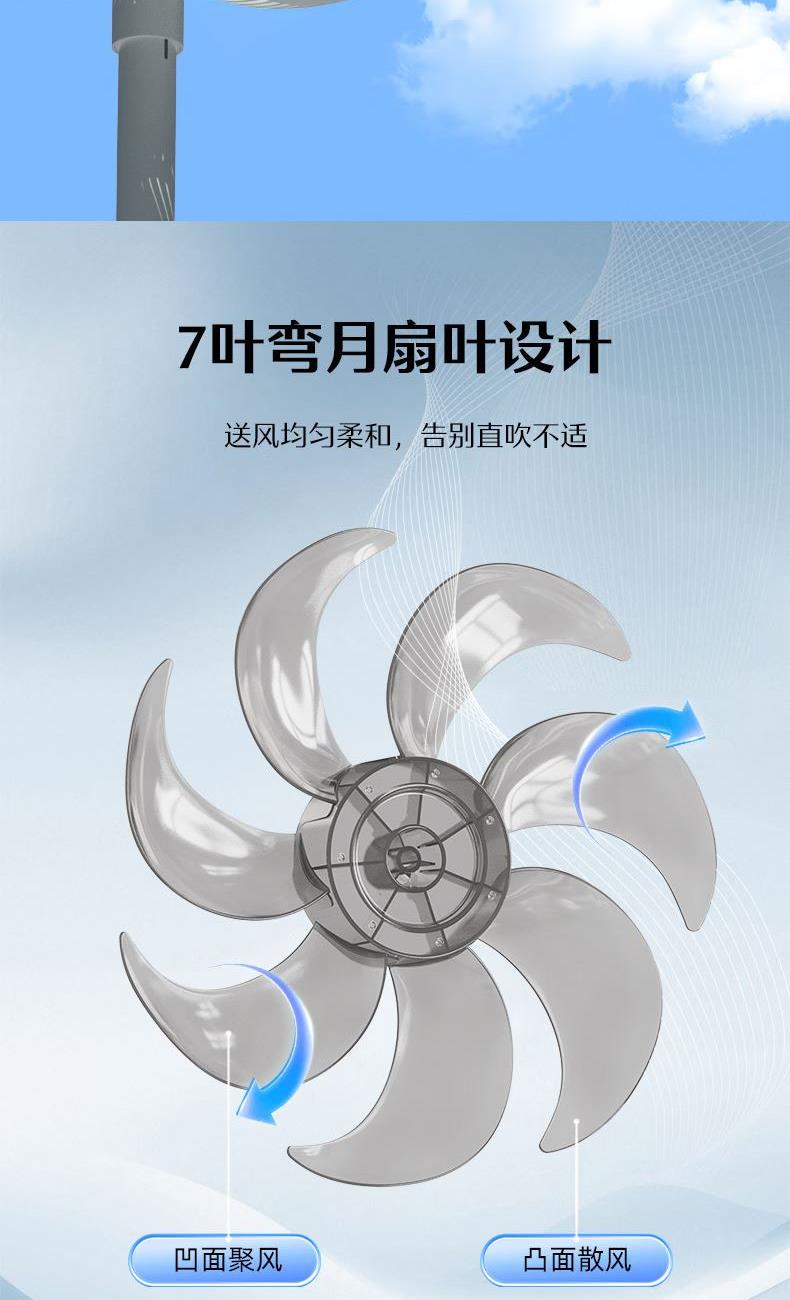 网罩:350mm 扇叶:300mm 7叶弯月扇叶 电机:66-14六系高效电机 立柱:27cm两节ABS 台地立一机三用 包装尺寸:500*210*385mm 风速:5.5m/s 档位:三档 喷漆工艺,质感星空灰配色 模拟潮汐海风 丝丝凉风铺面而来;复刻潮汐清凉海风,体验风的秘密。 产品上下手动摇头,左右自动摇头; 七叶扇叶,风柔音轻,凉爽惬意 安静陪伴,贴身呵护,清凉工作 柔风细腻强而不硬。