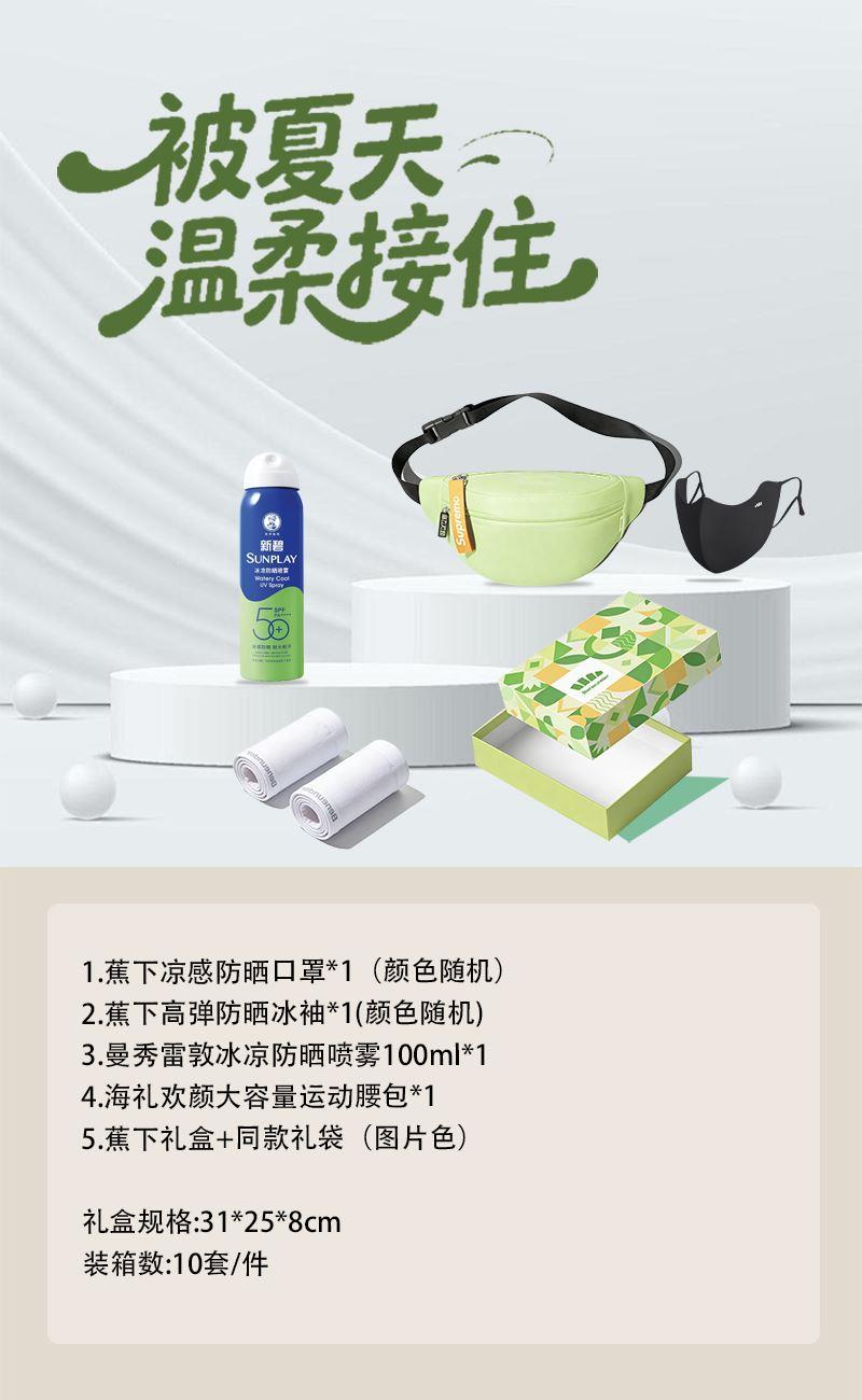 1.蕉下凉感防晒口罩*1(颜色随机) 2.蕉下高弹防晒冰袖*1(颜色随机) 3.曼秀雷敦冰凉防晒喷雾100ml*1 4.海礼欢颜大容量运动腰包*1 5.蕉下礼盒+同款礼袋(图片色)