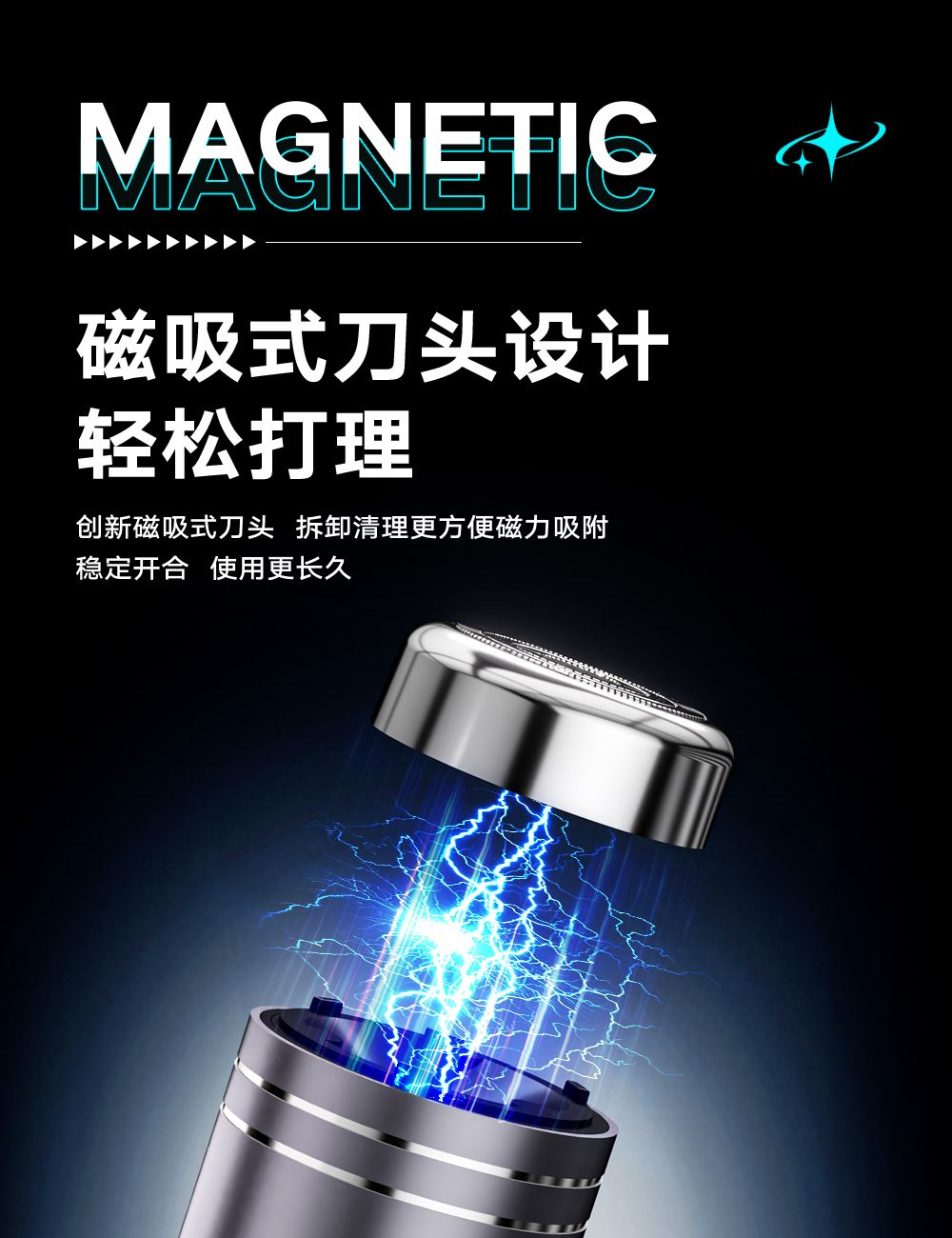 以前剃完须清理刀头超麻烦,拆半天还弄不干净?这款剃须刀的磁吸式刀头太懂懒人了!轻轻一拔就能取下刀头,冲一冲、擦一擦就干净,不用费劲抠缝隙。更贴心的是它有IPX7 全身防水,洗澡时能边洗边剃,剃完直接把整机放水下冲,清理一步到位,懒人真的会爱惨!