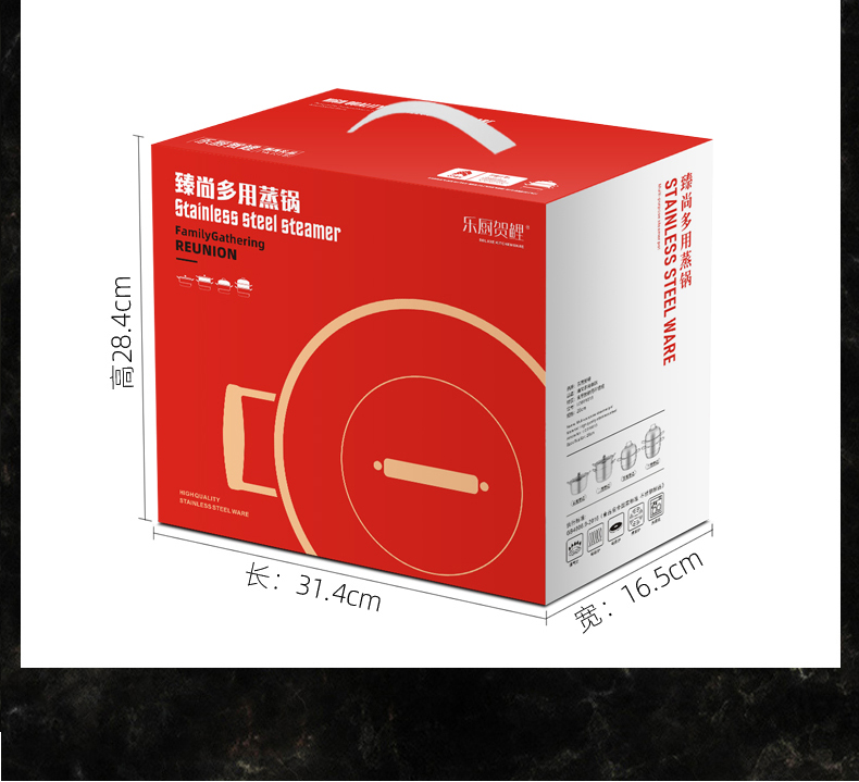产品规格 : 28cm 产品材质 : 410不锈钢 包装方式 : opp透明袋+手提彩盒 彩盒尺寸: 31.5cm * 17.0cm * 27.0cm 送啥都不如送实用!蒸锅礼盒,实用又体面 多层烹饪效率高,美味营养一锅解锁,厨房好帮手。 安全耐腐的材质,结实耐用,让你用得放心 不挑炉具,不管你家是电磁炉还是明火,它都能轻松适配 搭配马上暴富礼盒,开启美味新 “蒸” 程